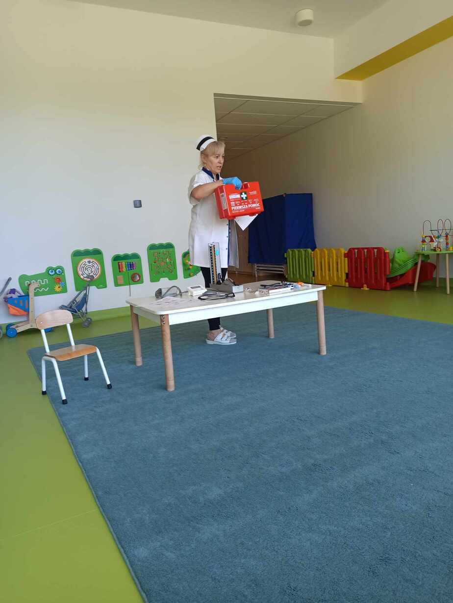 Dnia 12 maja obchodzimy Międzynarodowy Dzień Pielęgniarki. Z tej okazji ciocia pracująca w naszym żłobku w ramach zajęć edukacyjnych przeprowadziła pogadankę na temat trudnej i odpowiedzialnej pracy pielęgniarki, a także udzieliła wskazówek na temat sposobów dbania o zdrowie i higienę.