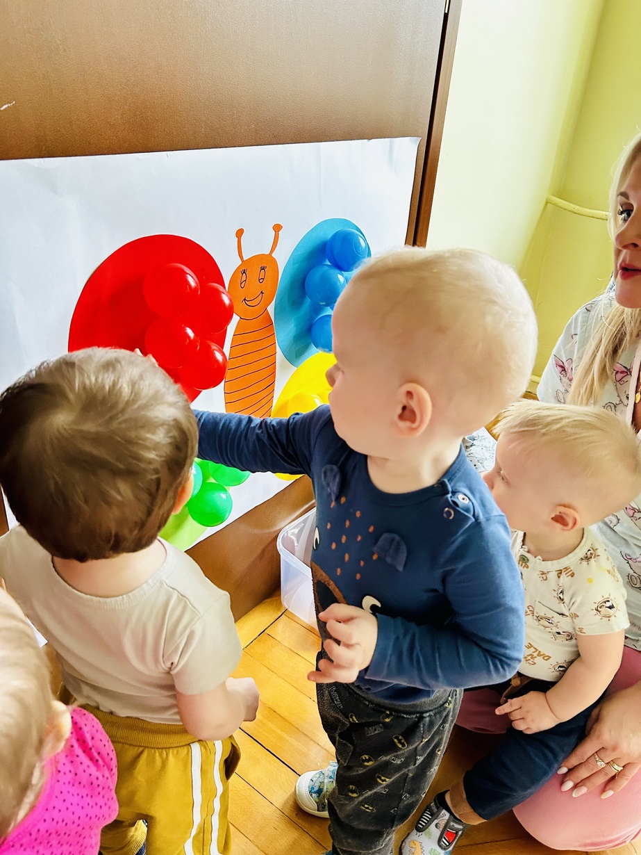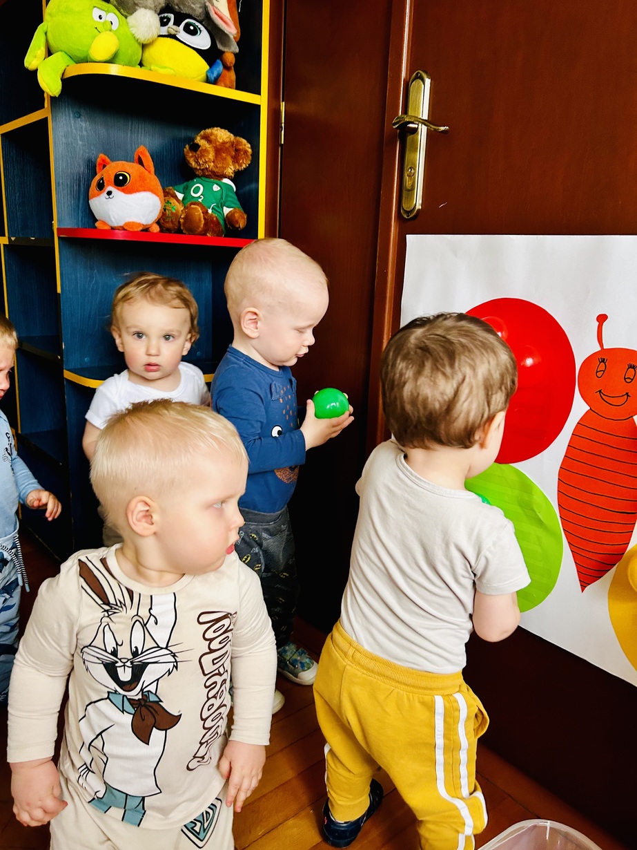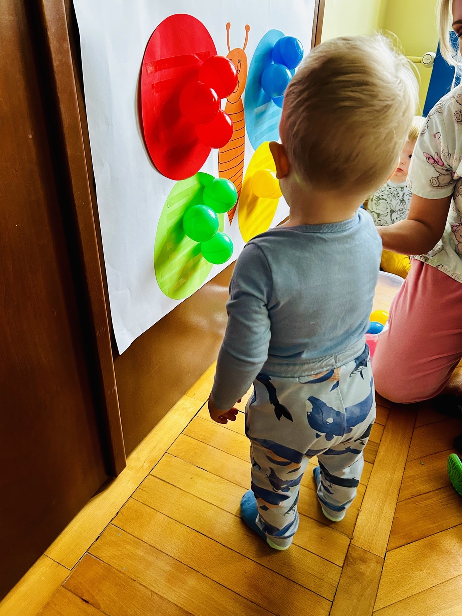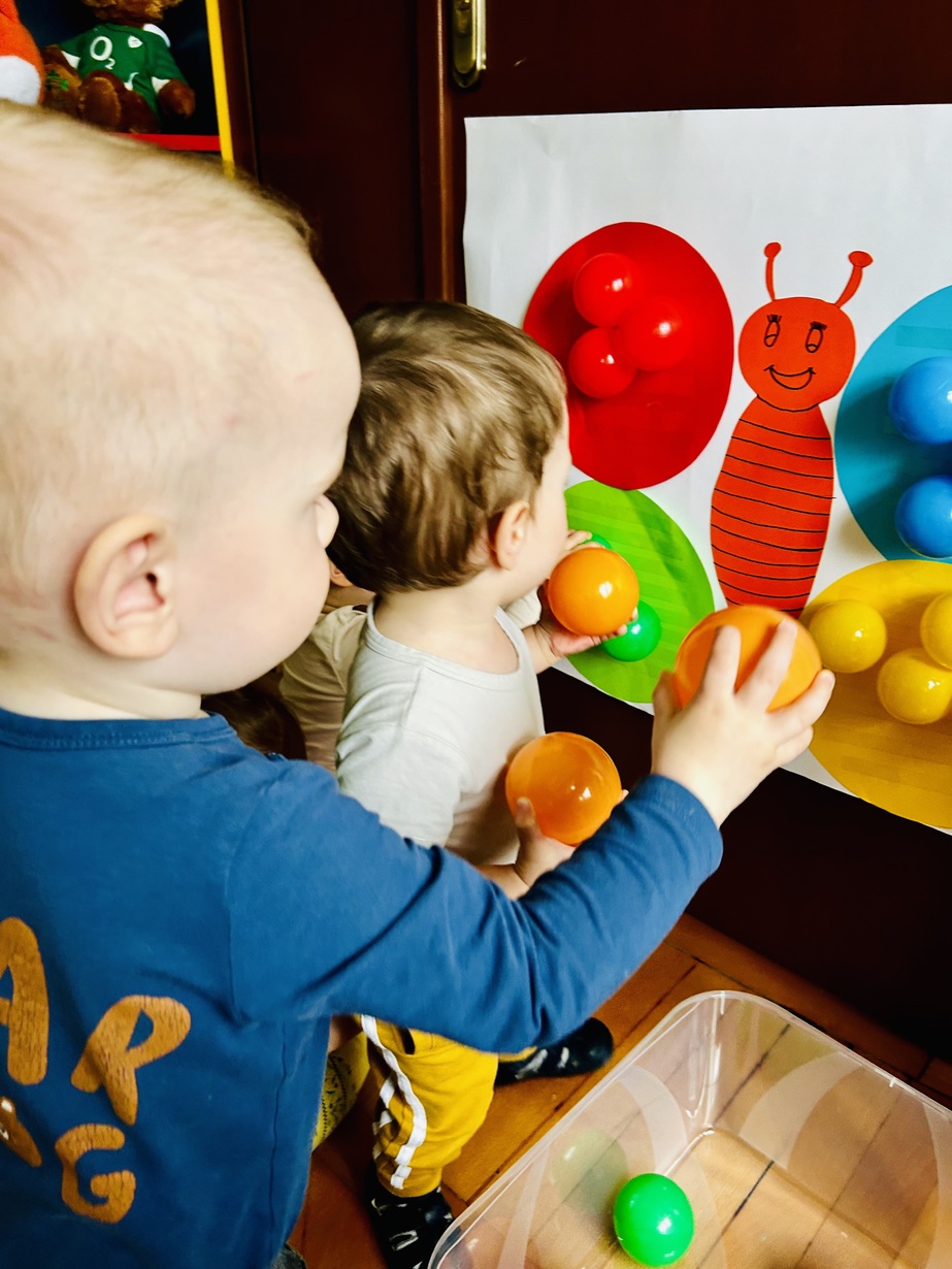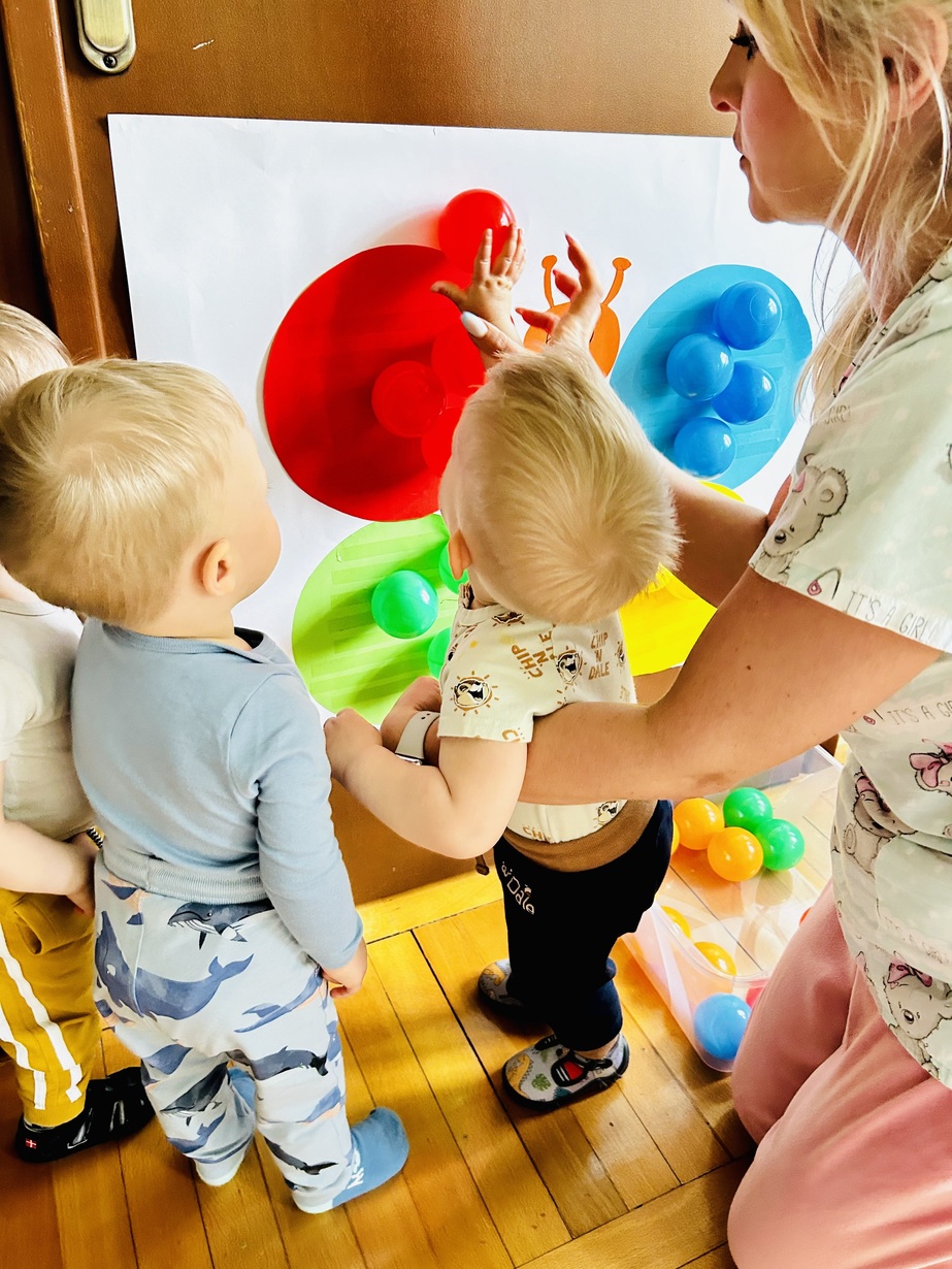 Ostatnio królowały u Nas piłeczki.Dzieci spędzały czas na zabawie nimi . Biedroneczki przyklejały i odklejały odpowiednie kolory piłek.