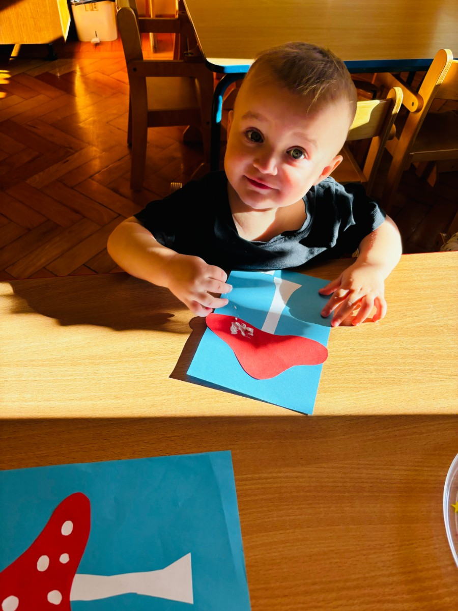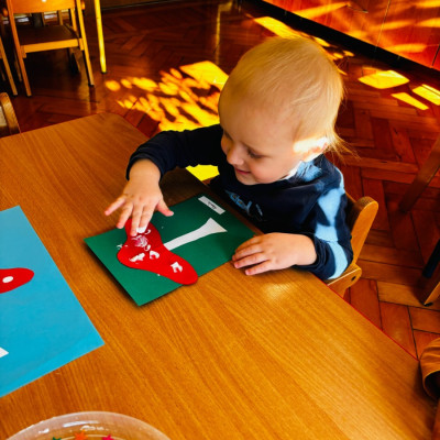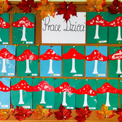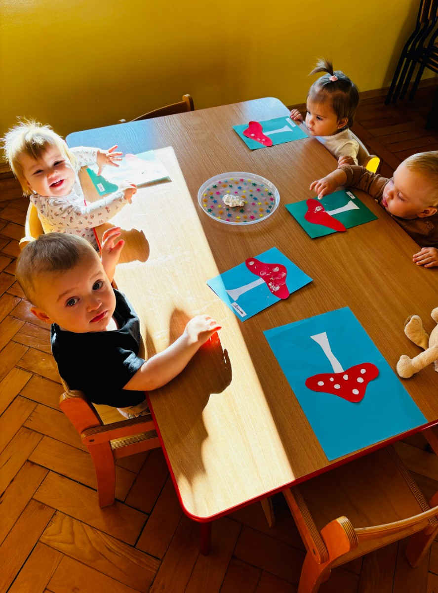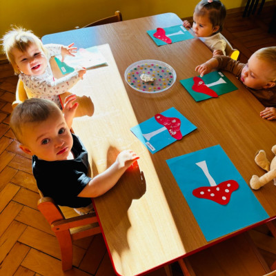 Maluszki malowały paluszkami kropeczki na kapeluszu muchomora . Praca plastyczną miała na celu doskonalenie sprawności manualnych .