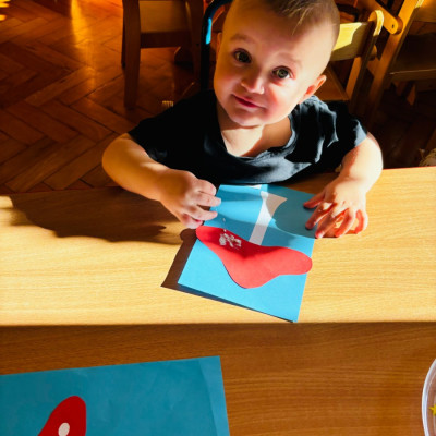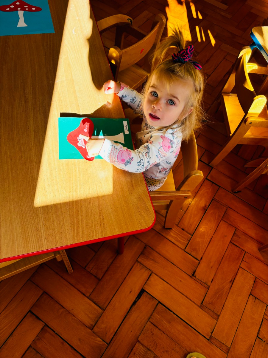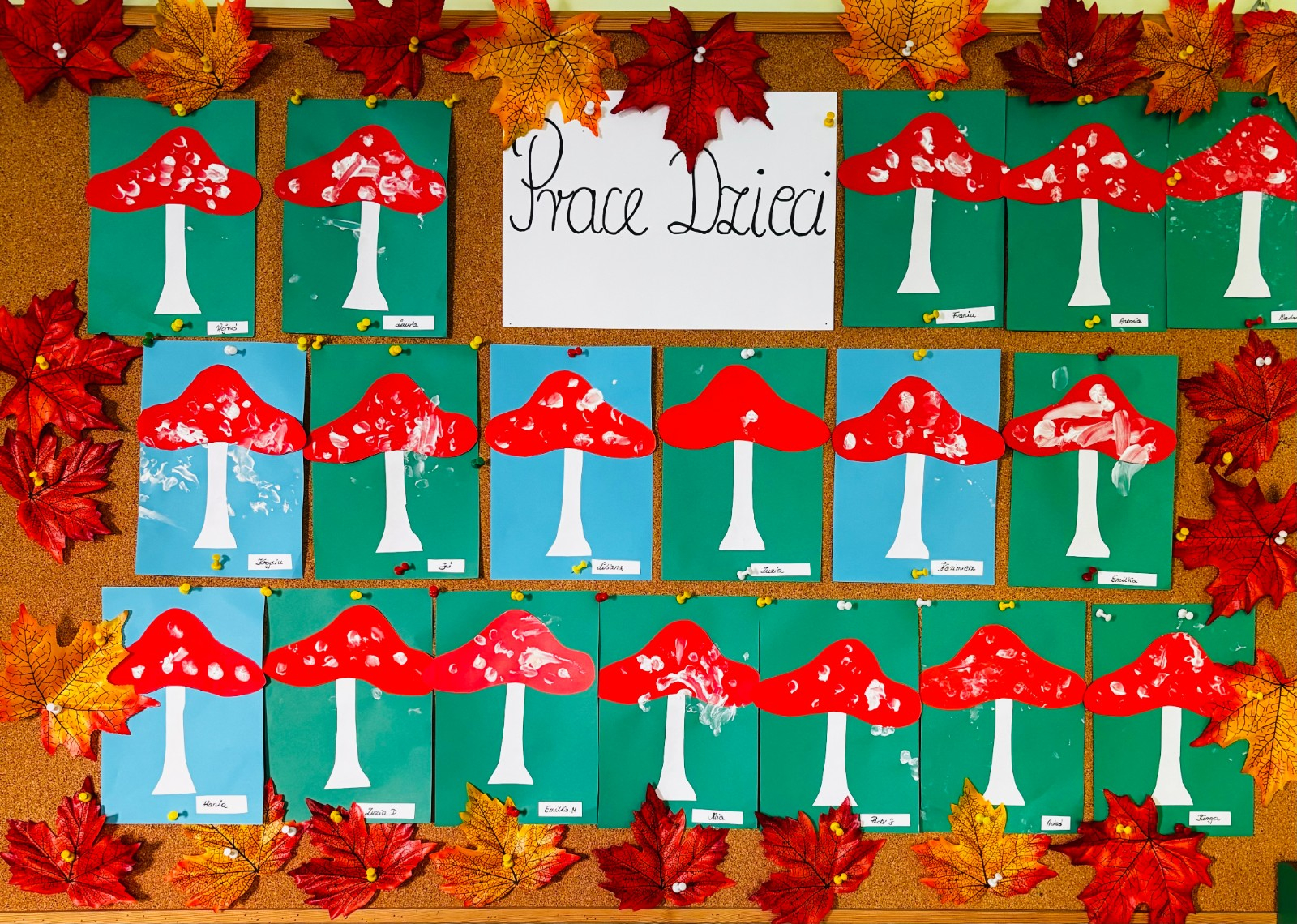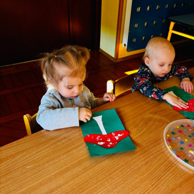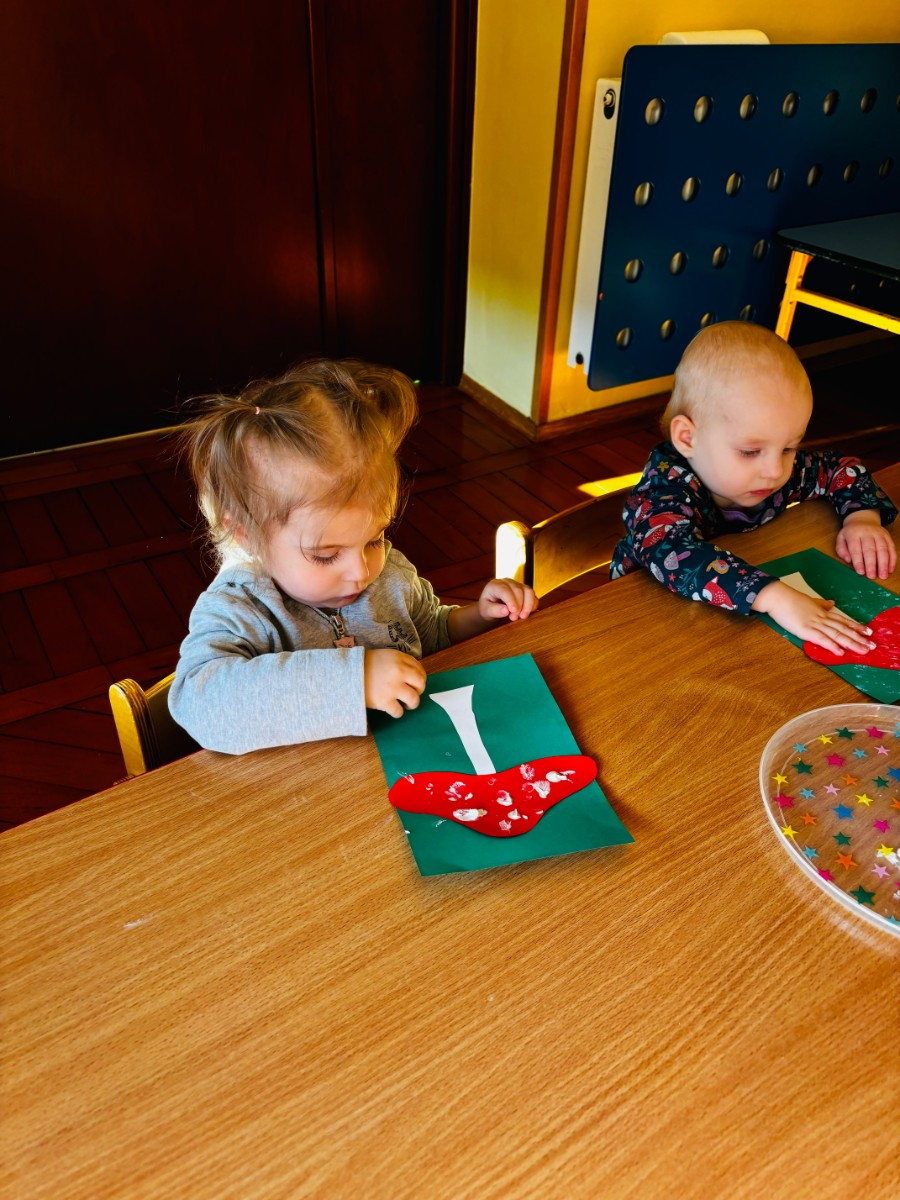 Maluszki malowały paluszkami kropeczki na kapeluszu muchomora . Praca plastyczną miała na celu doskonalenie sprawności manualnych .