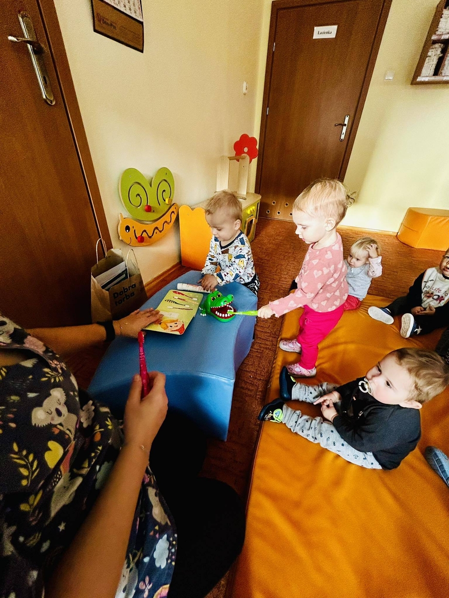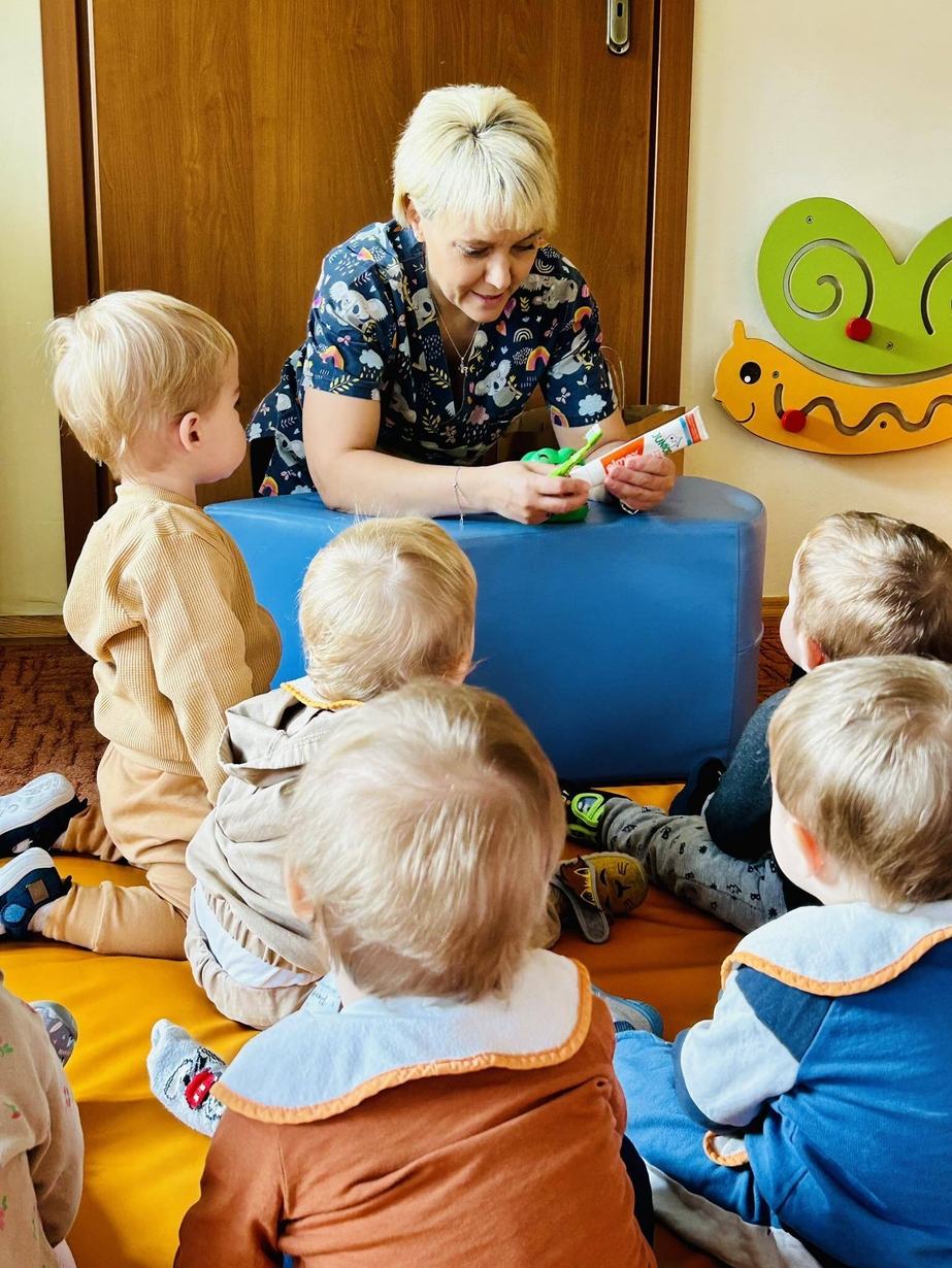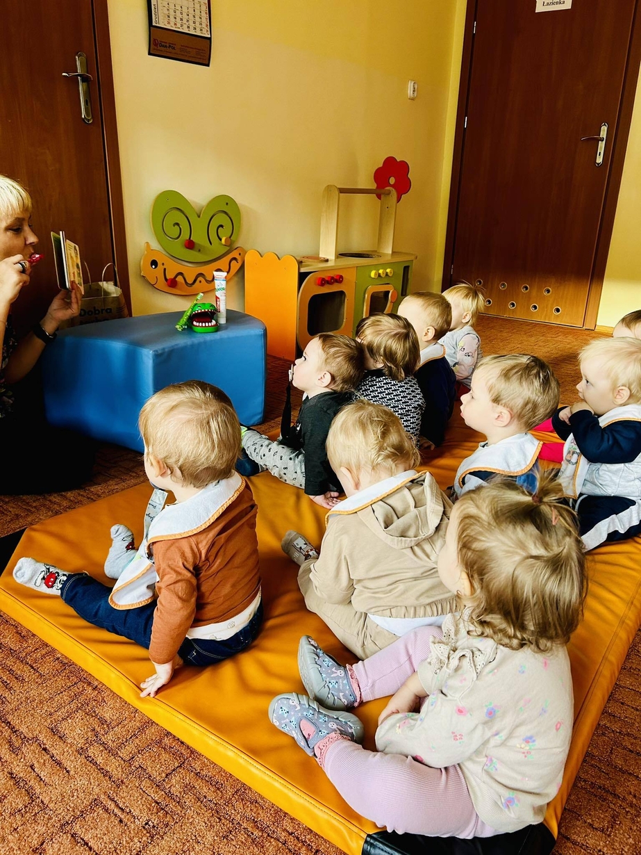 Dzisiaj nasze biedronki miały okazję zobaczyć i posłuchać o tym jak można dbac o swoje ząbki ...maluszki z zaciekawieniem słuchały pani opiekunki która opowiadała z pomocą krokodylka jak dbać i prawidłowo szczotować swoje ząbki.