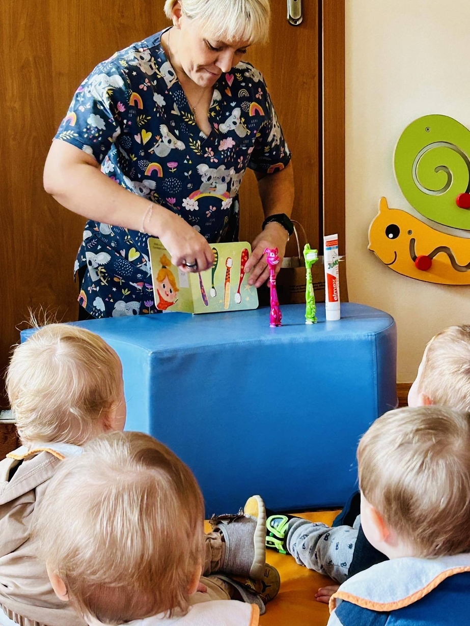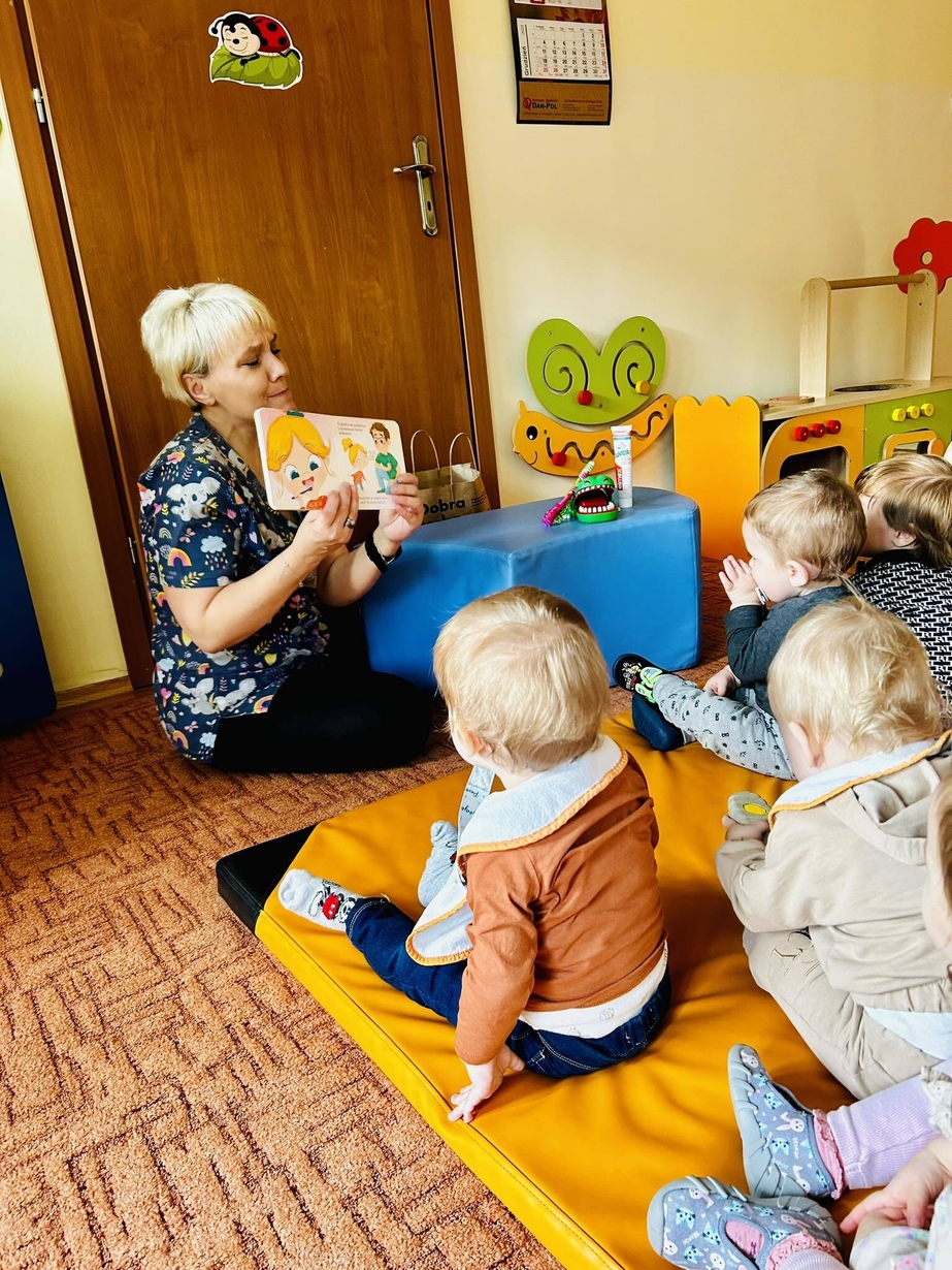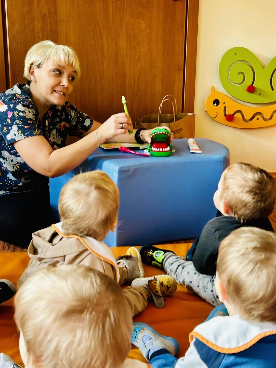 Dzisiaj nasze biedronki miały okazję zobaczyć i posłuchać o tym jak można dbac o swoje ząbki ...maluszki z zaciekawieniem słuchały pani opiekunki która opowiadała z pomocą krokodylka jak dbać i prawidłowo szczotować swoje ząbki.