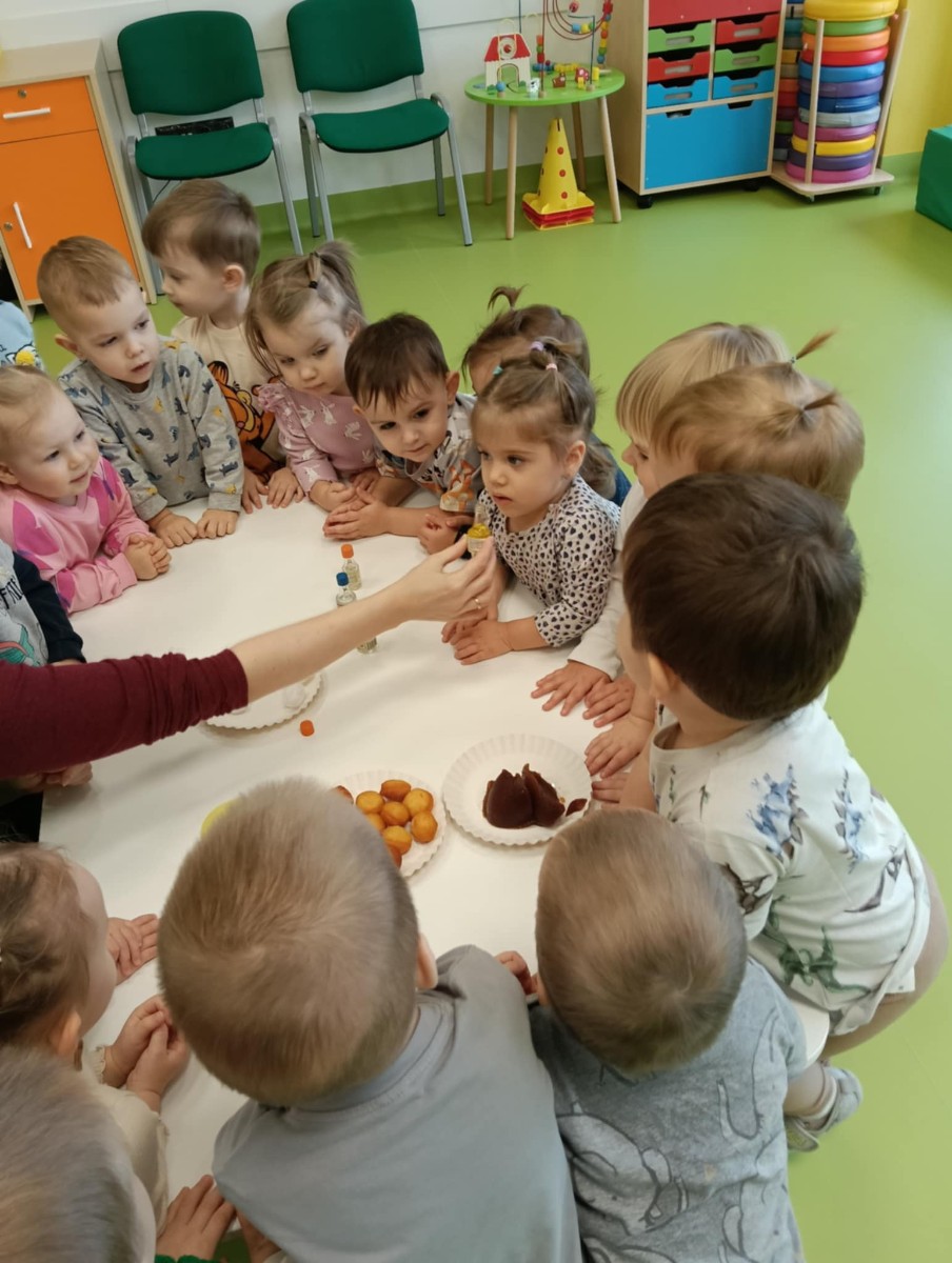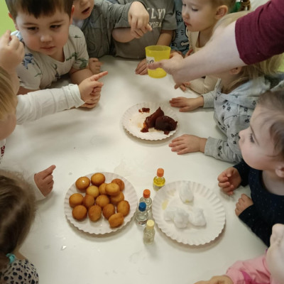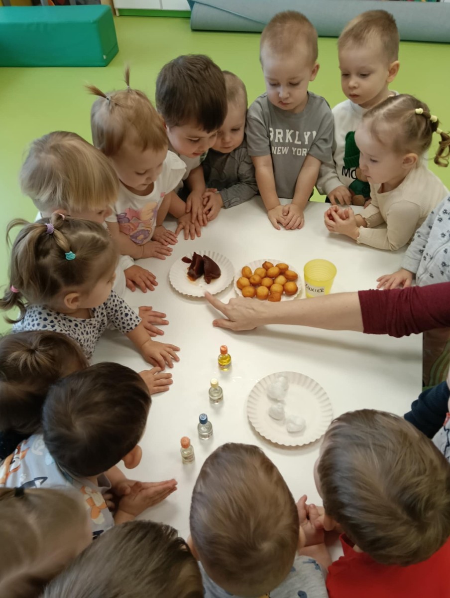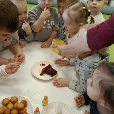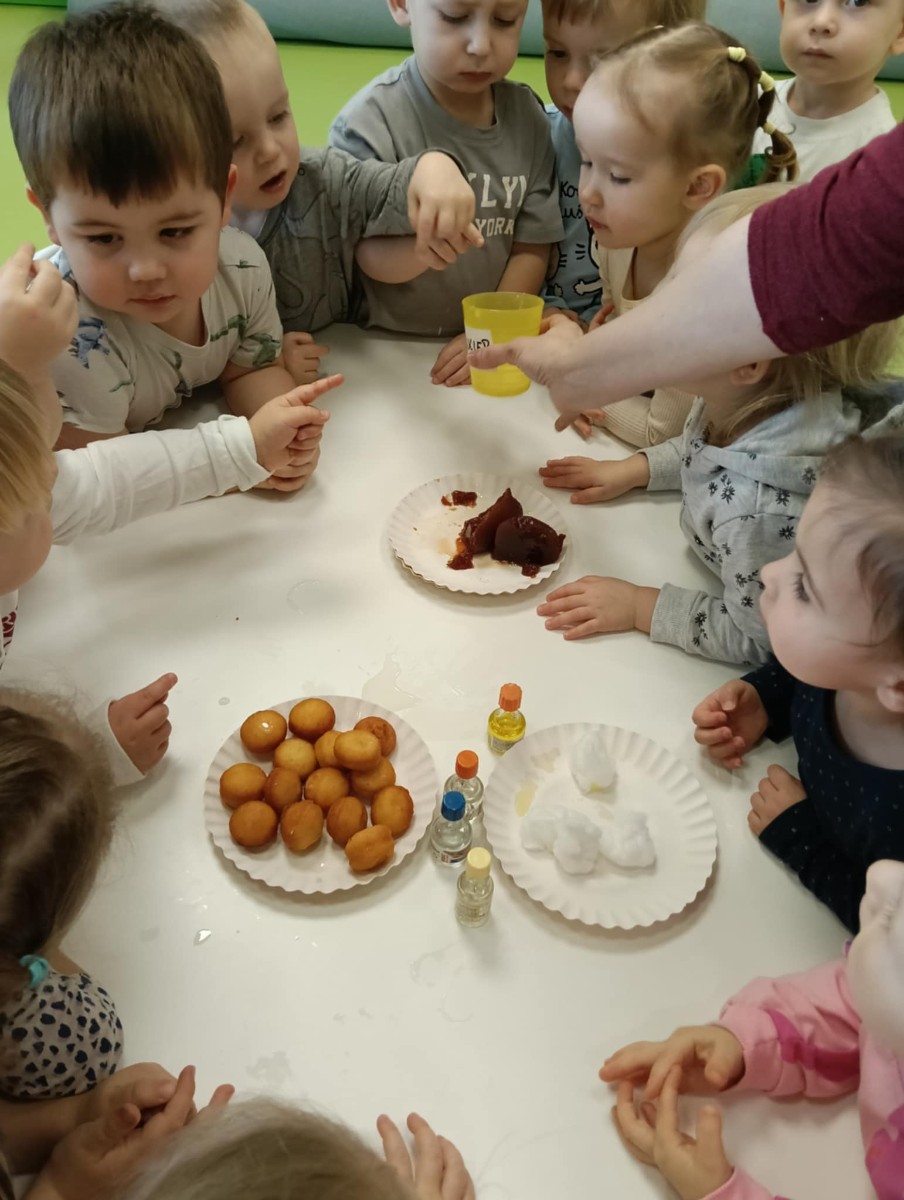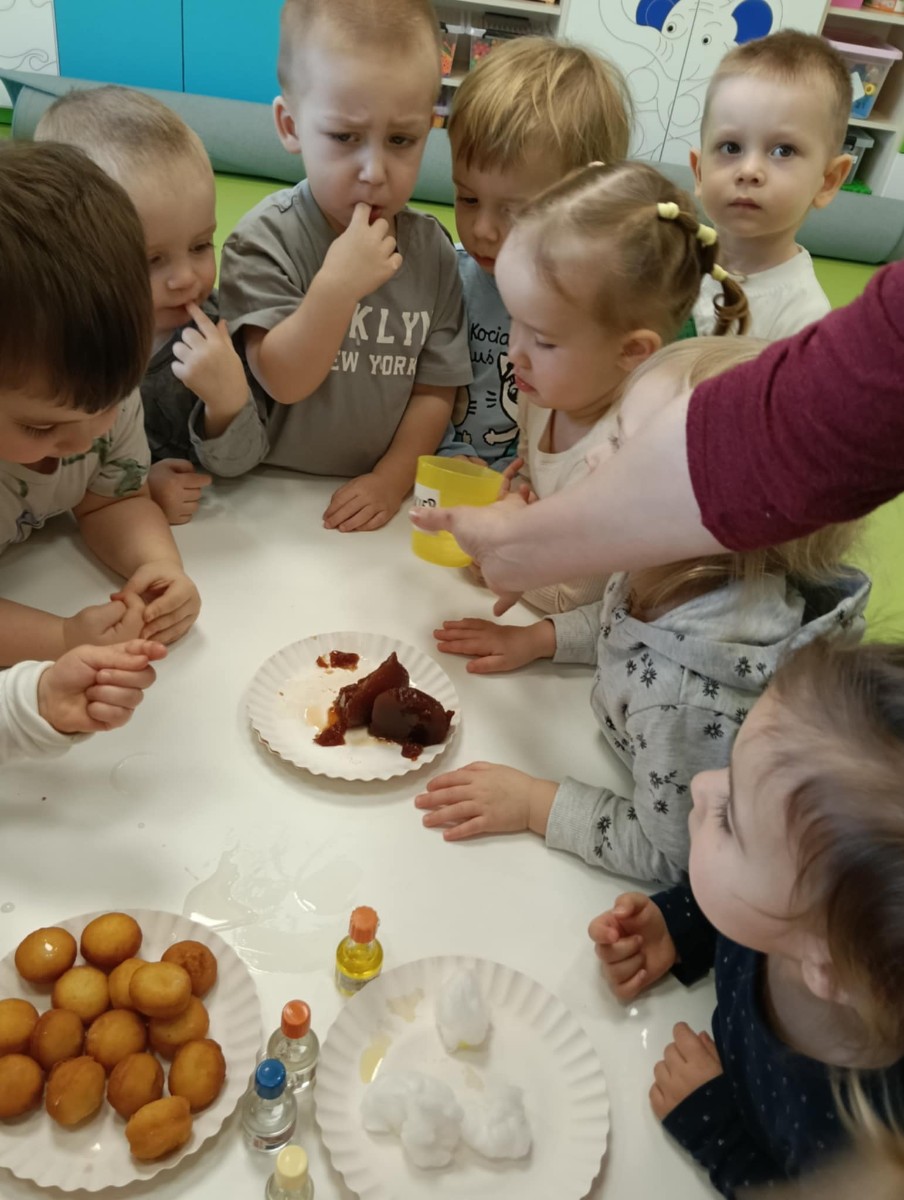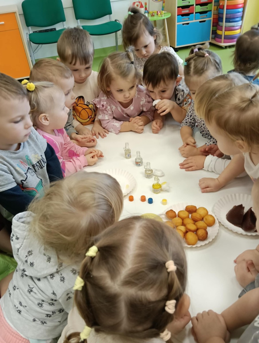 Z tej okazji Tygryski podczas zajęć sensorycznych miały okazję poznać z jakich składników składa się pączek, jak może pachnieć nadzienie w pączku oraz jak wygląda lukier. Musiały dopasować zapach do odpowiedniej buteleczki oraz mieli możliwość posmakować poszczególnych produktów. Były to zajęcia bardzo pachnące i smaczne