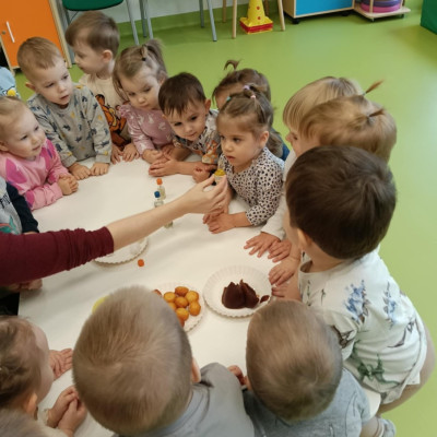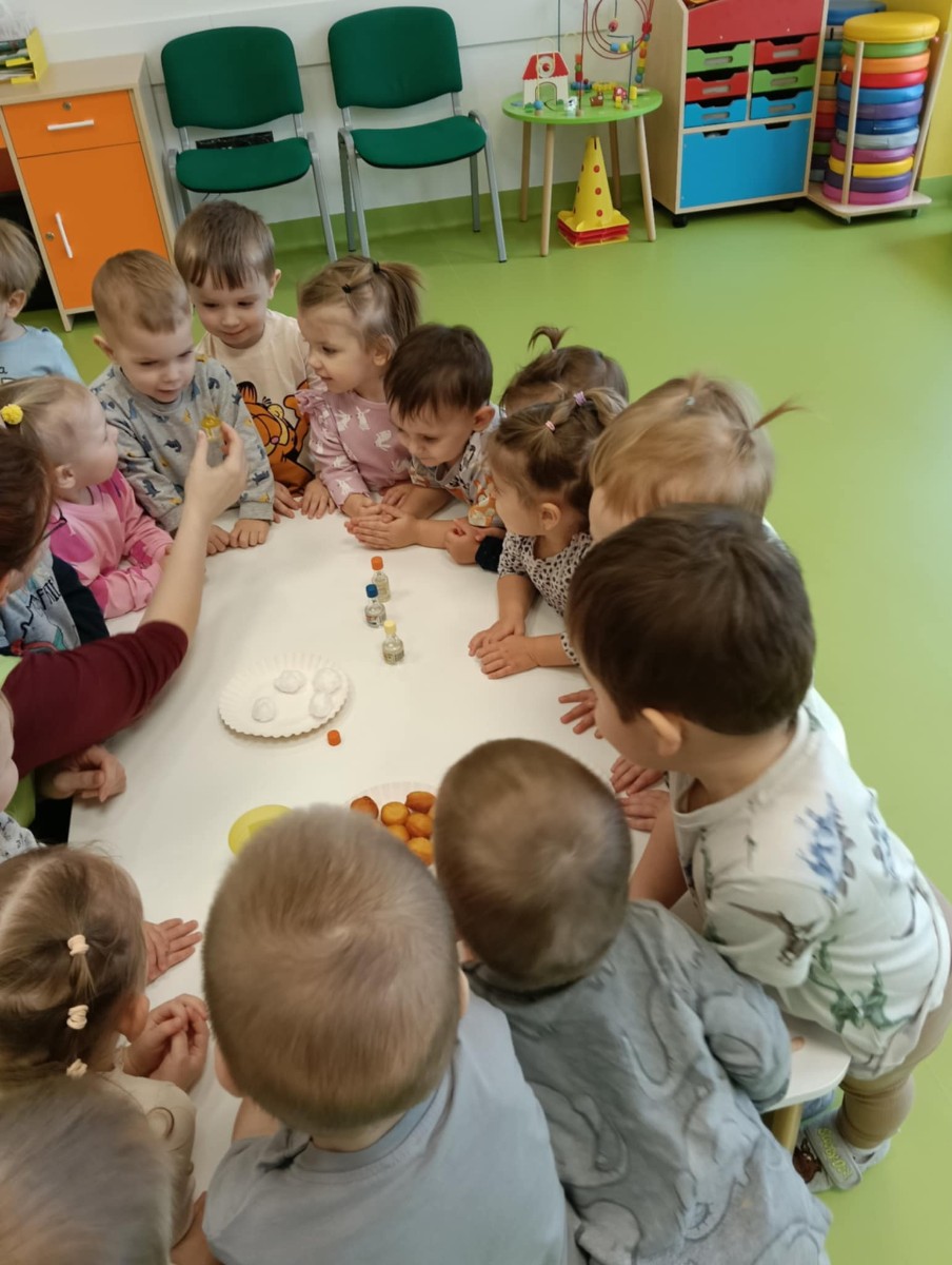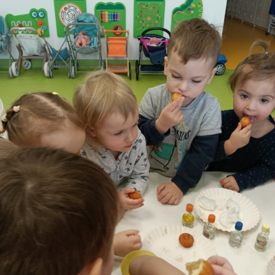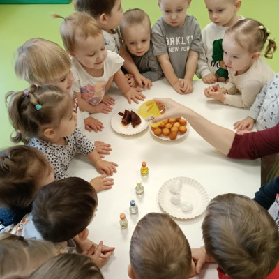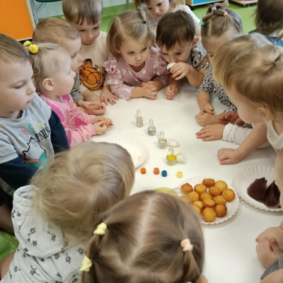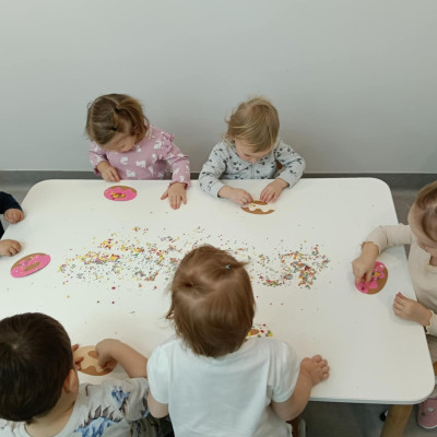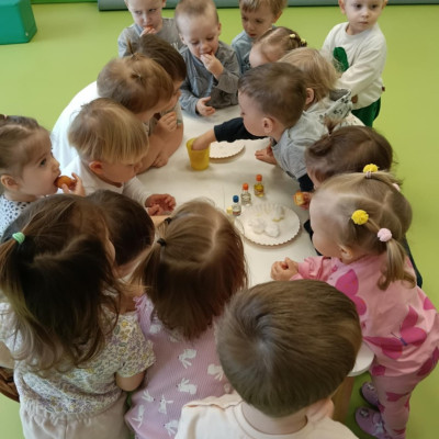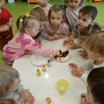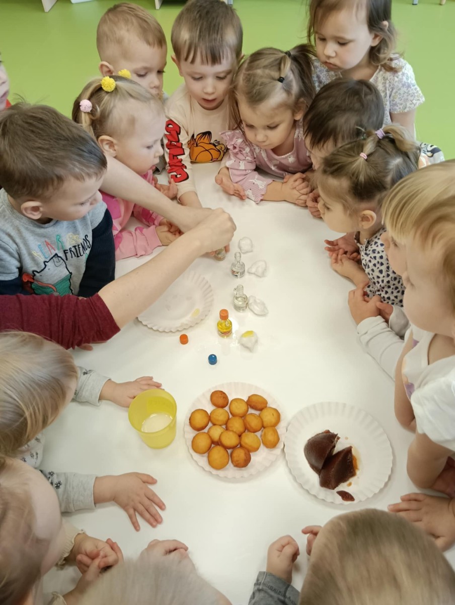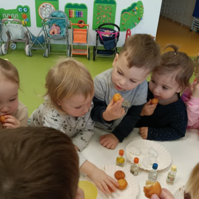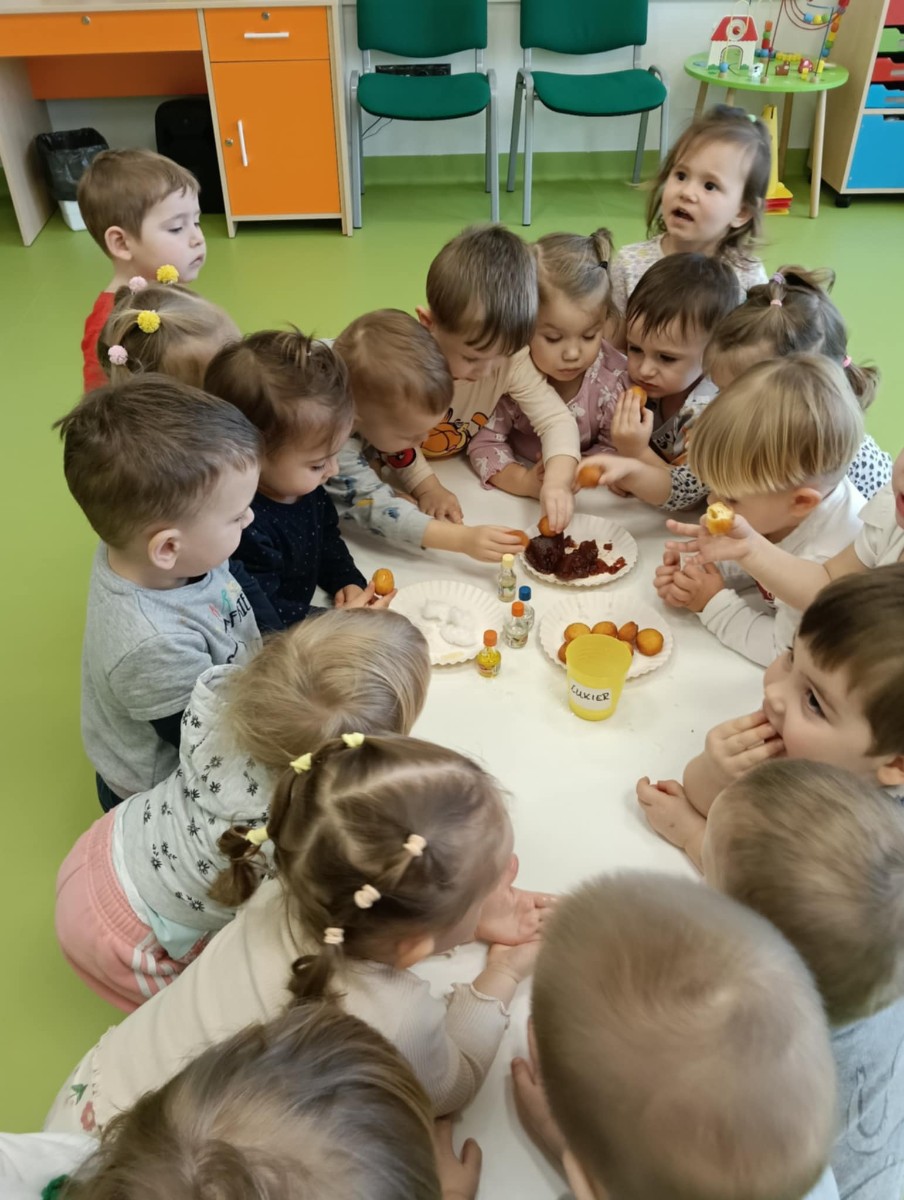 Z tej okazji Tygryski podczas zajęć sensorycznych miały okazję poznać z jakich składników składa się pączek, jak może pachnieć nadzienie w pączku oraz jak wygląda lukier. Musiały dopasować zapach do odpowiedniej buteleczki oraz mieli możliwość posmakować poszczególnych produktów. Były to zajęcia bardzo pachnące i smaczne