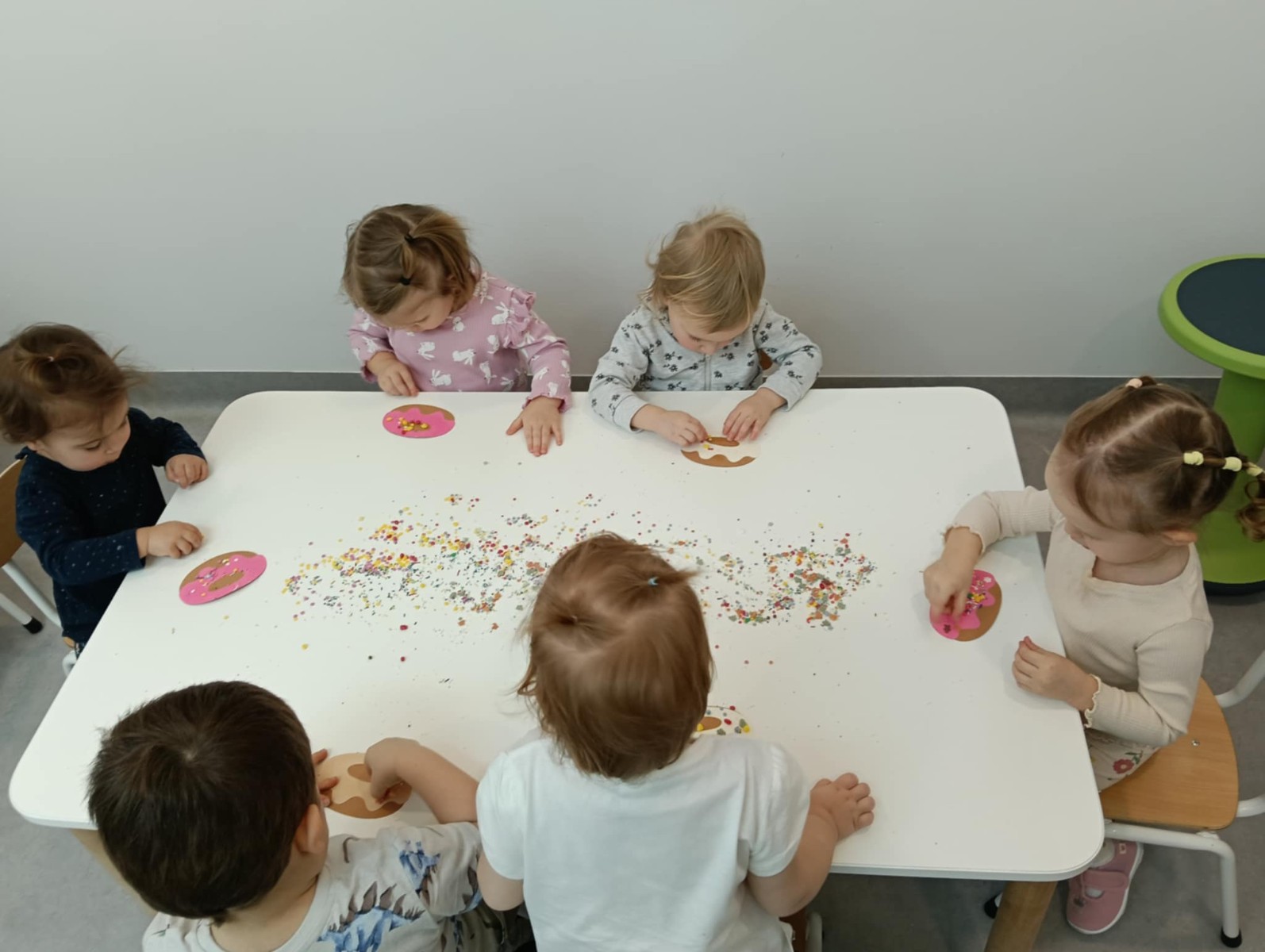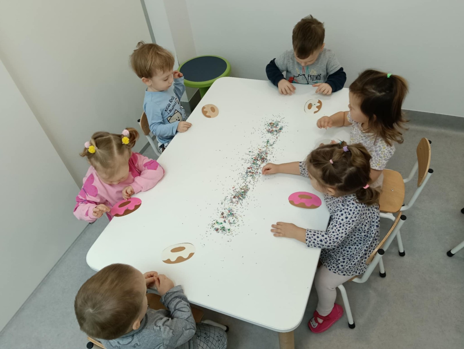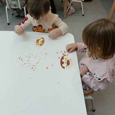 . Na zakończenie Tygryski wykonały pracę plastyczną przy wykorzystaniu szablonu Donata i kolorowych posypek.