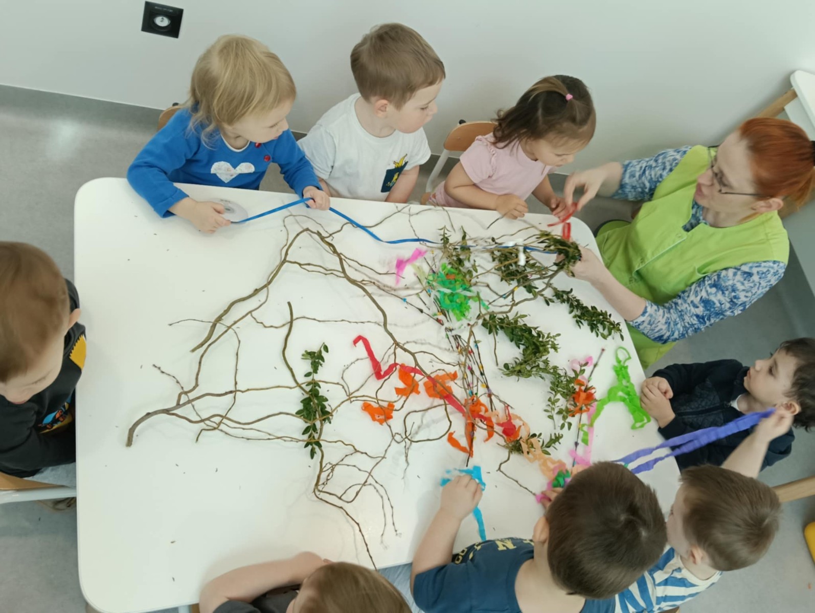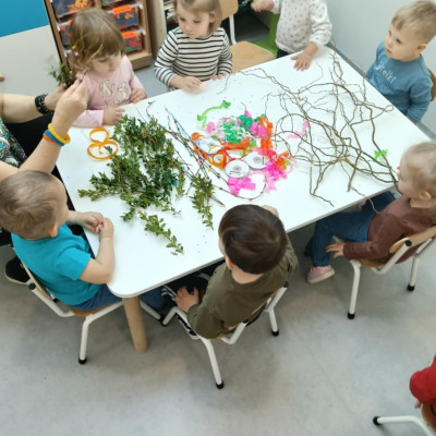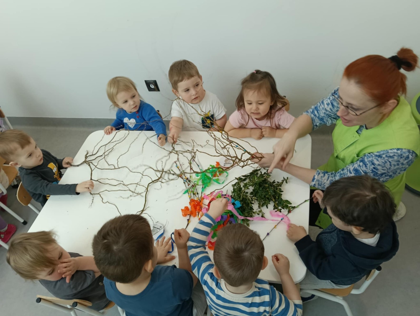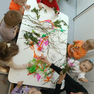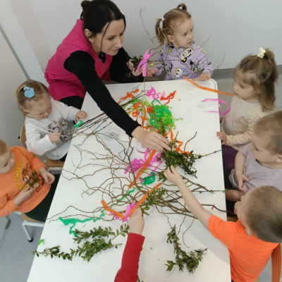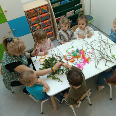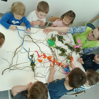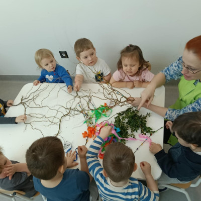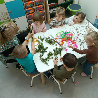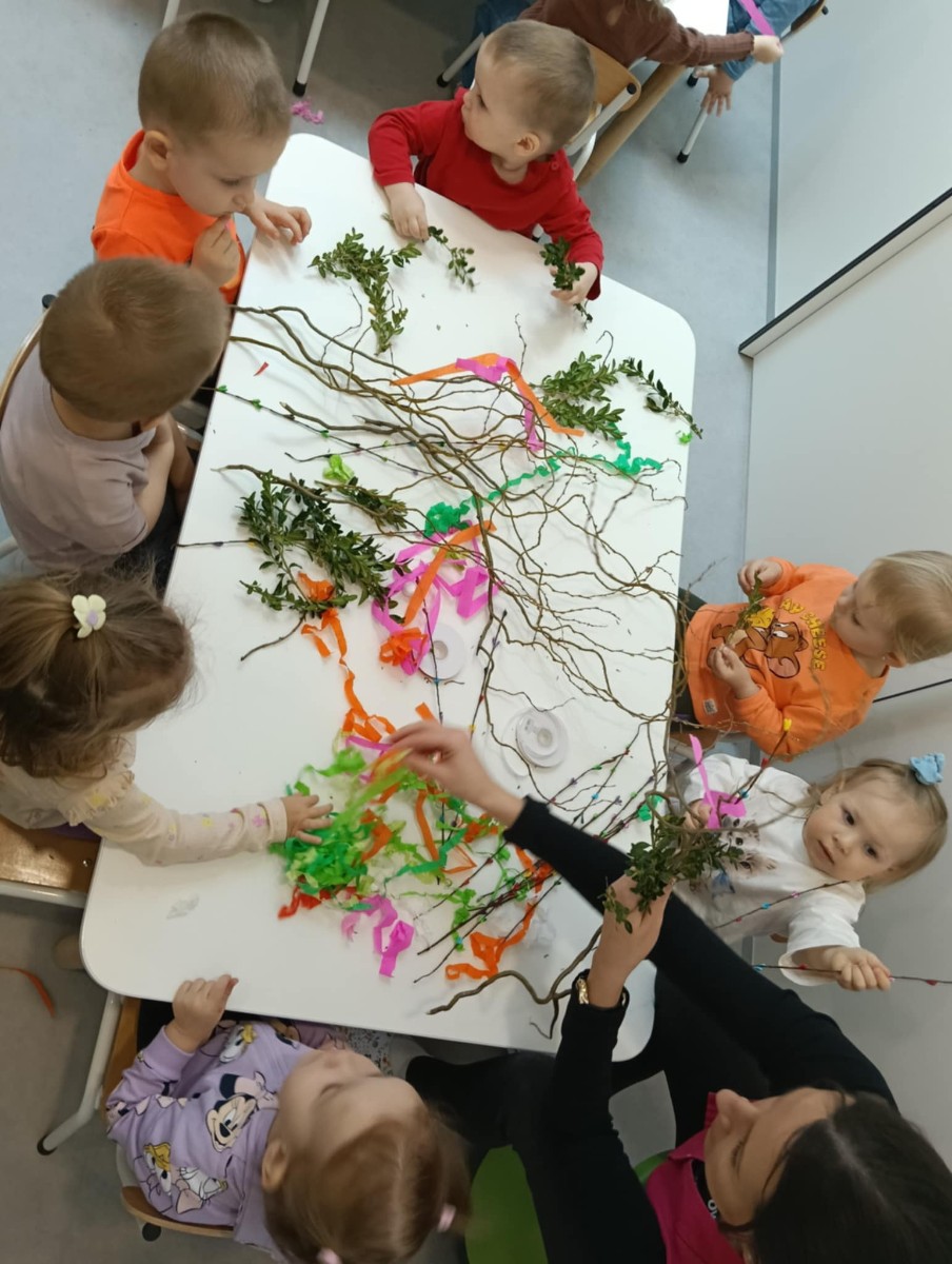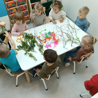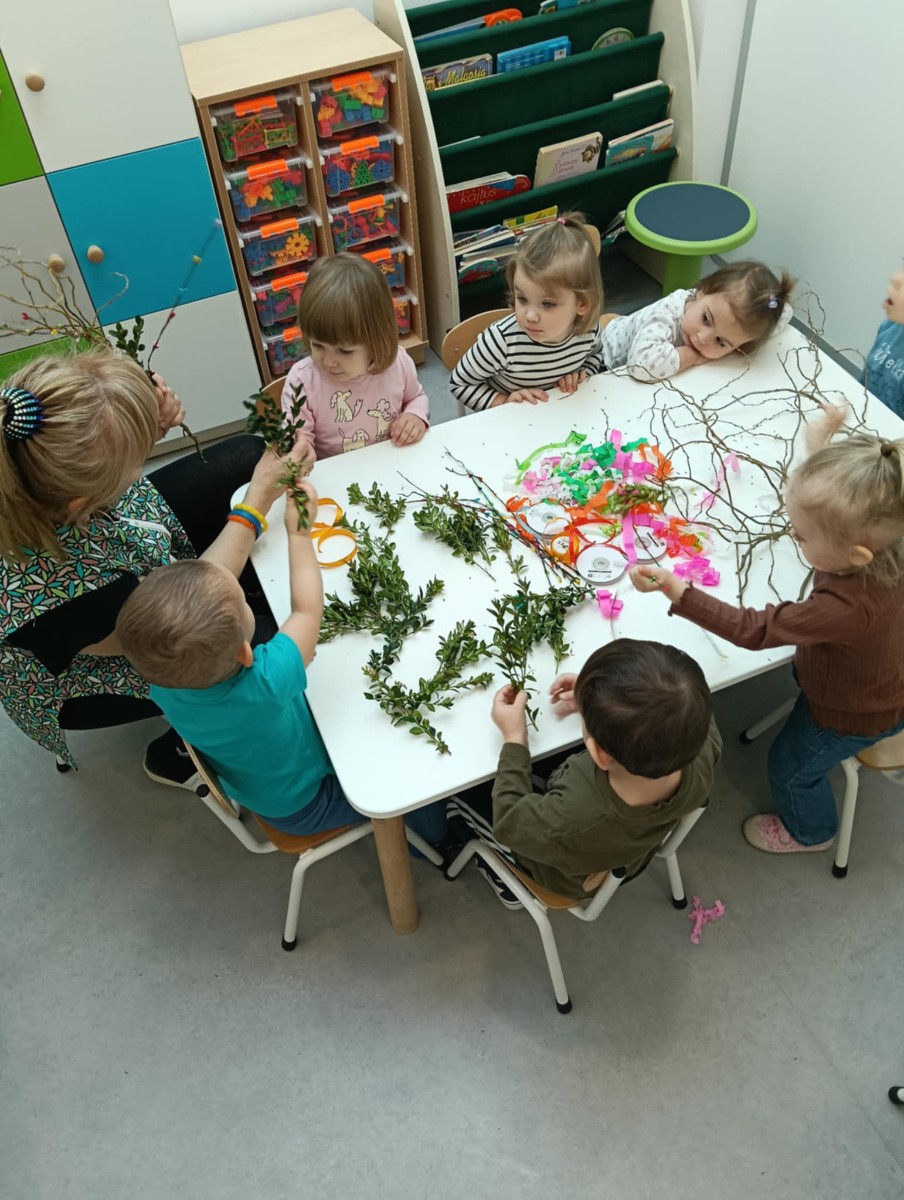 Zdjęcie przedstawia dzieci wykonujące palmy wielkanocne