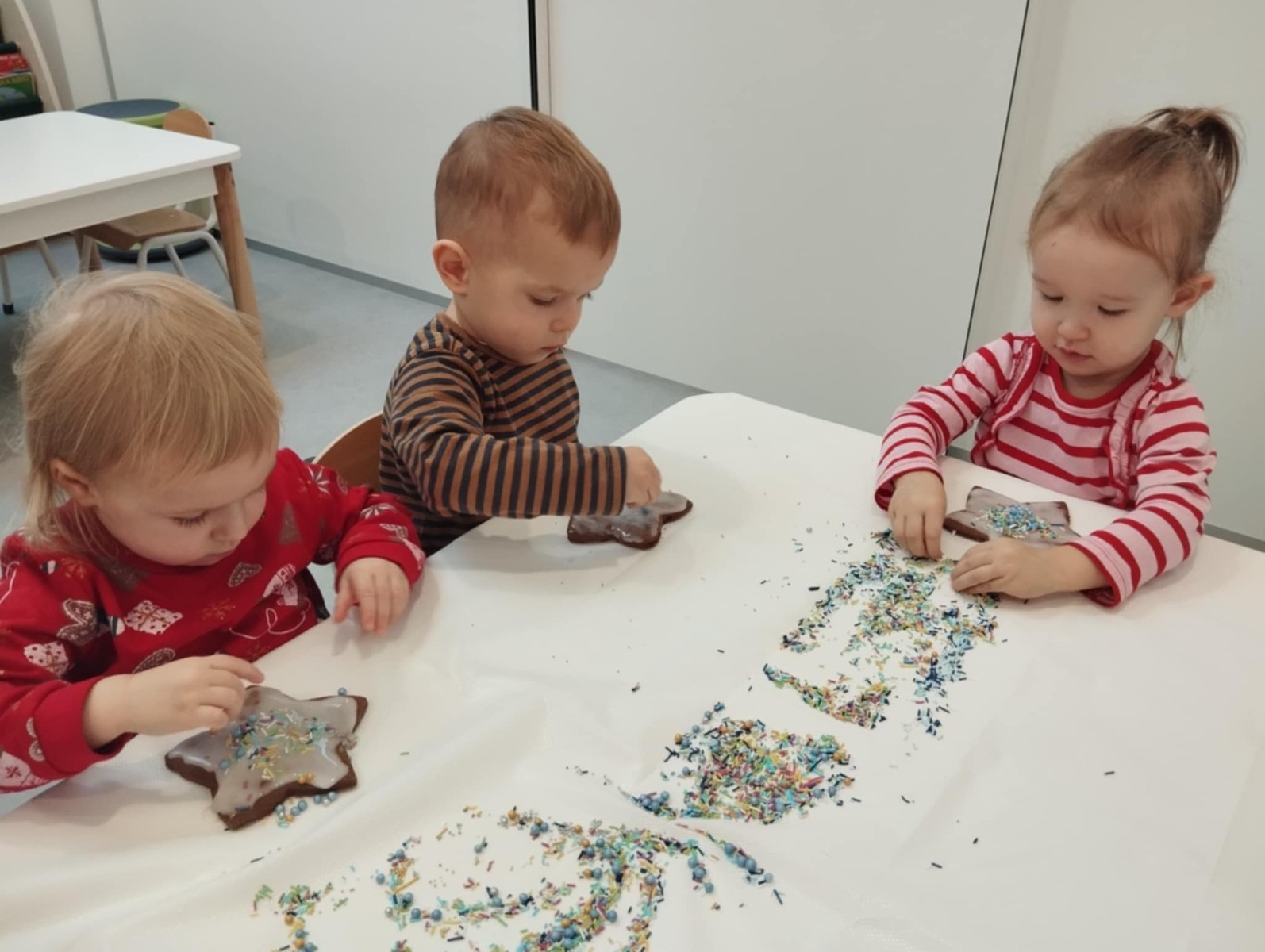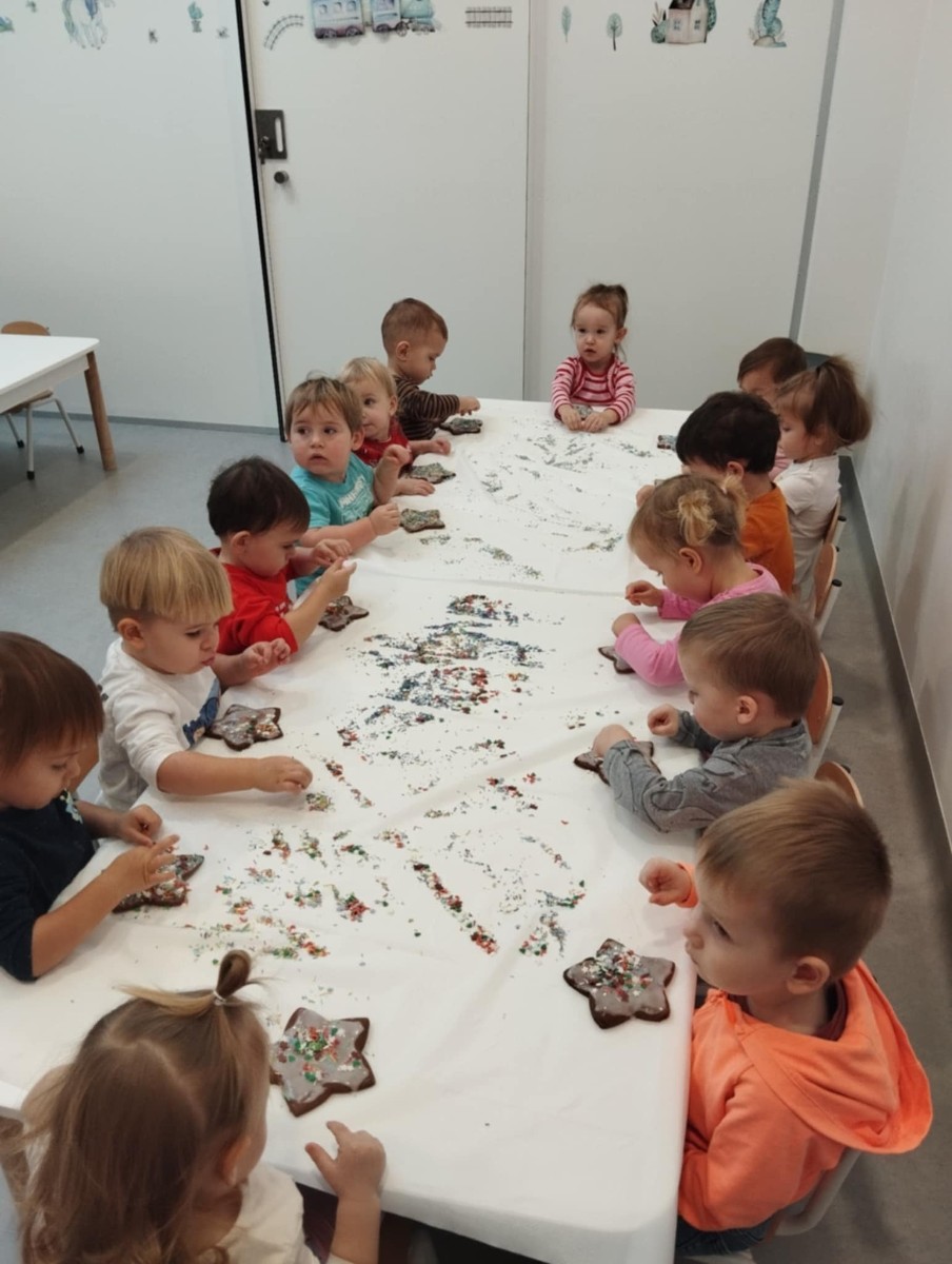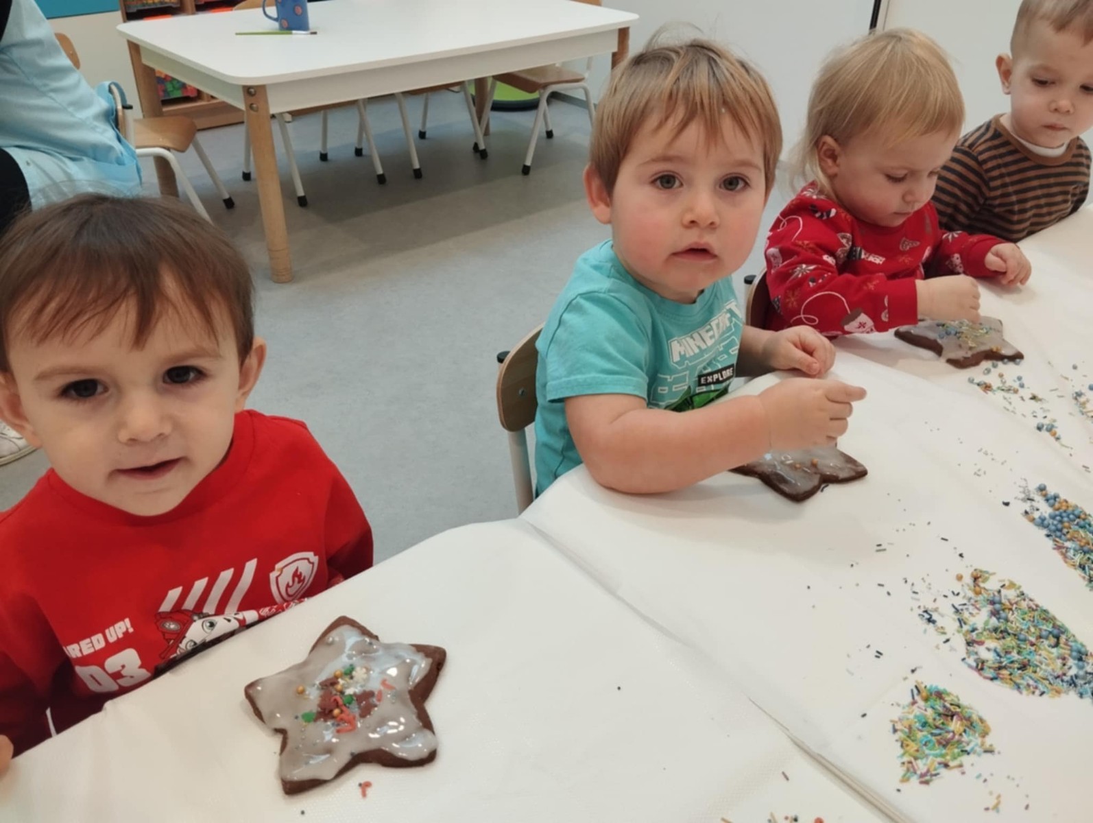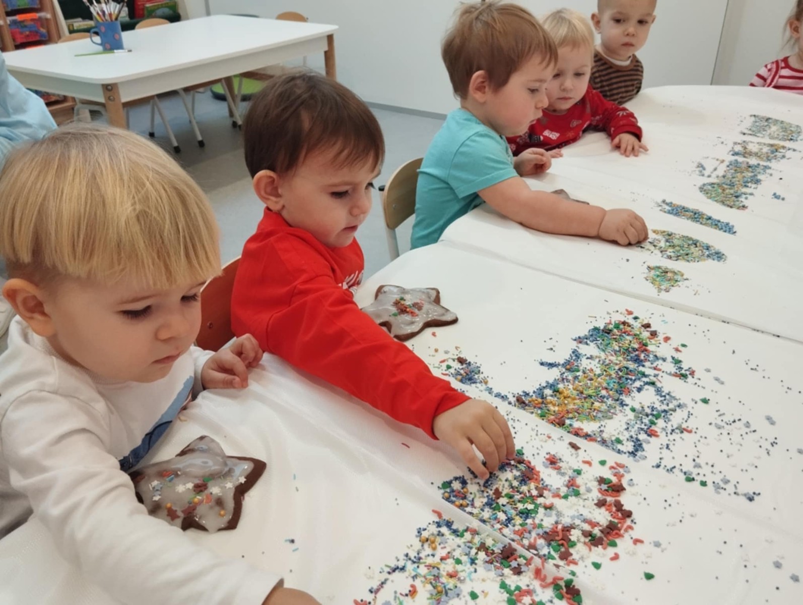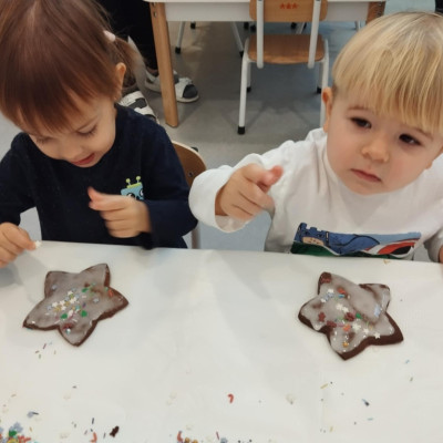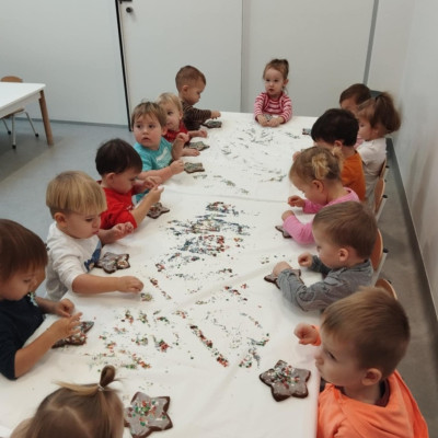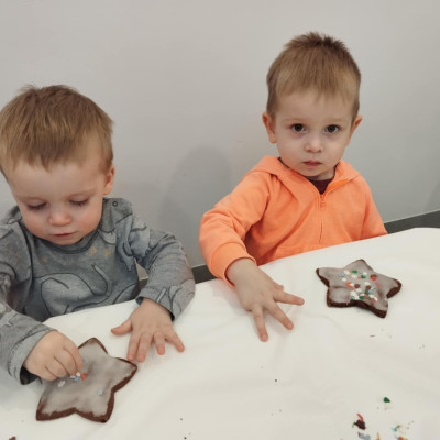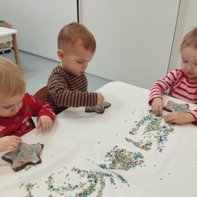 dlatego grupa Tygrysków przygotowuje się już! Dziś nasi mali artyści samodzielnie dekorowali pierniczki , wykorzystując różnokolorowe i o różnych smakach posypki. Wymagało to od nich ogromnej koncentracji, jednak sprawiło im to wiele radości.