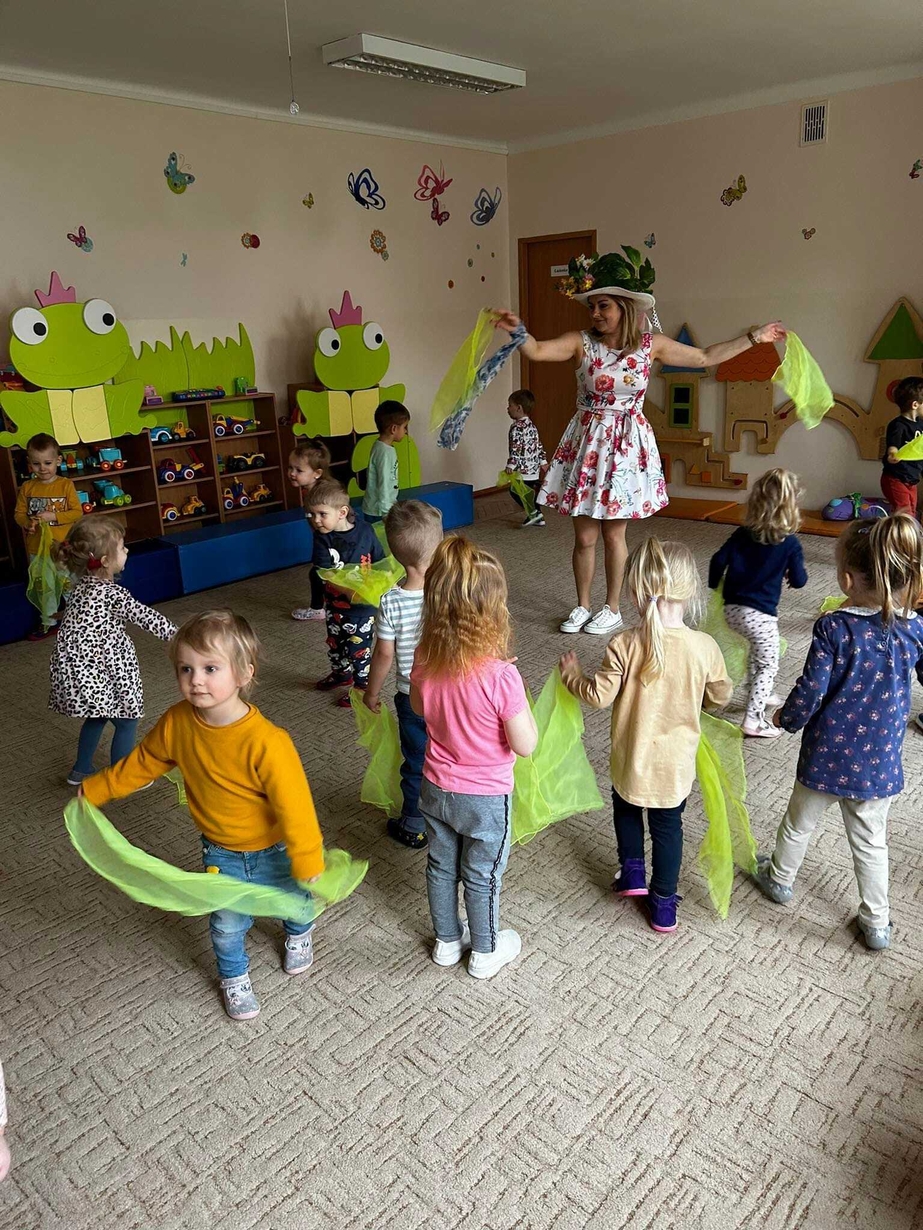 Następnie dzieci przyozdobiły suknię Pani Wiosny kolorowymi kwiatuszkami.