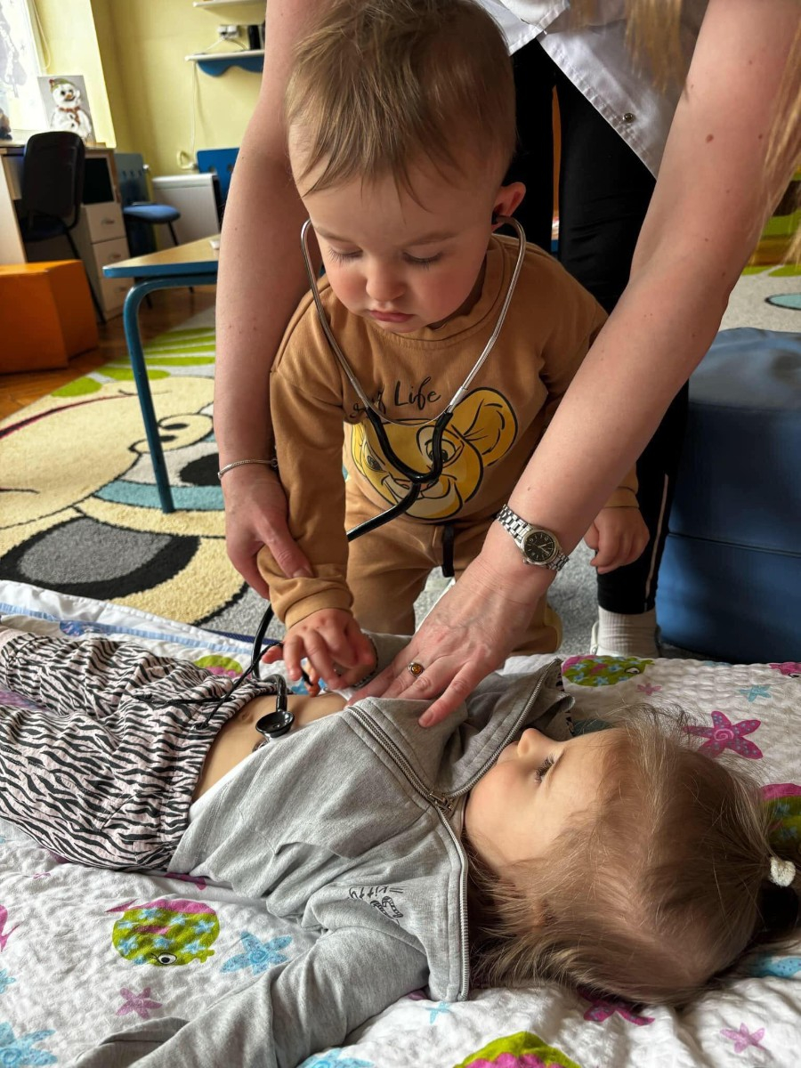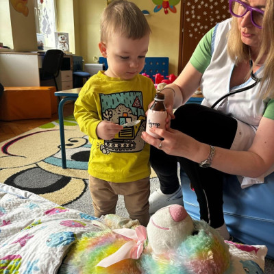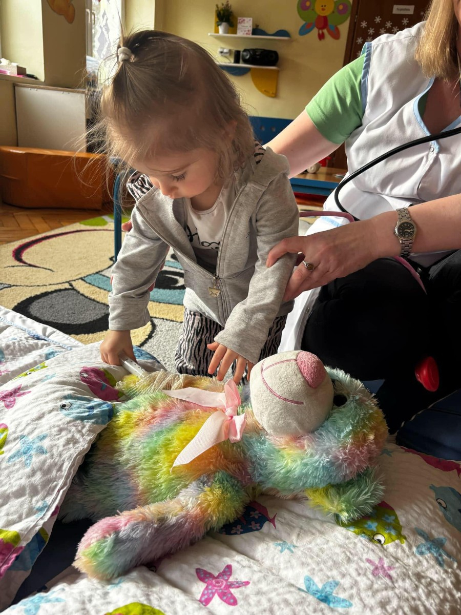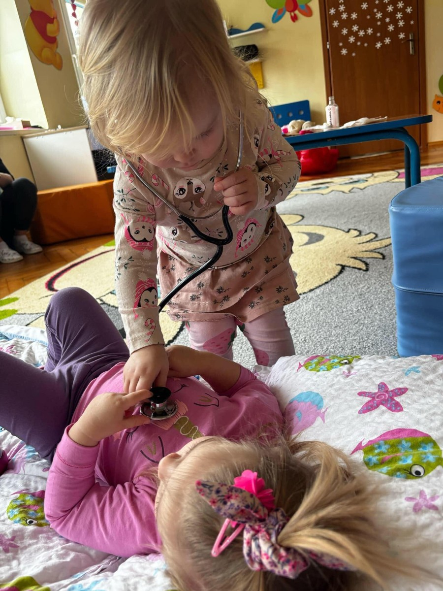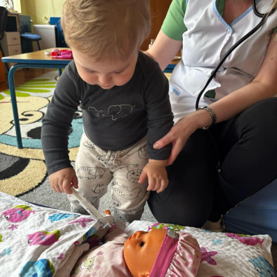 Dzieci z grupy "Biedronki" poznały zawód lekarza. Podczas wspólnej zabawy dowiedziały się, na czym polega jego praca, zapoznały się z akcesoriami medycznymi i mogły wcielić się w rolę lekarza. Na zakończenie wszystkie dzieci otrzymały odznaki „Dzielny Pacjent”.