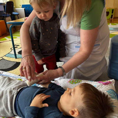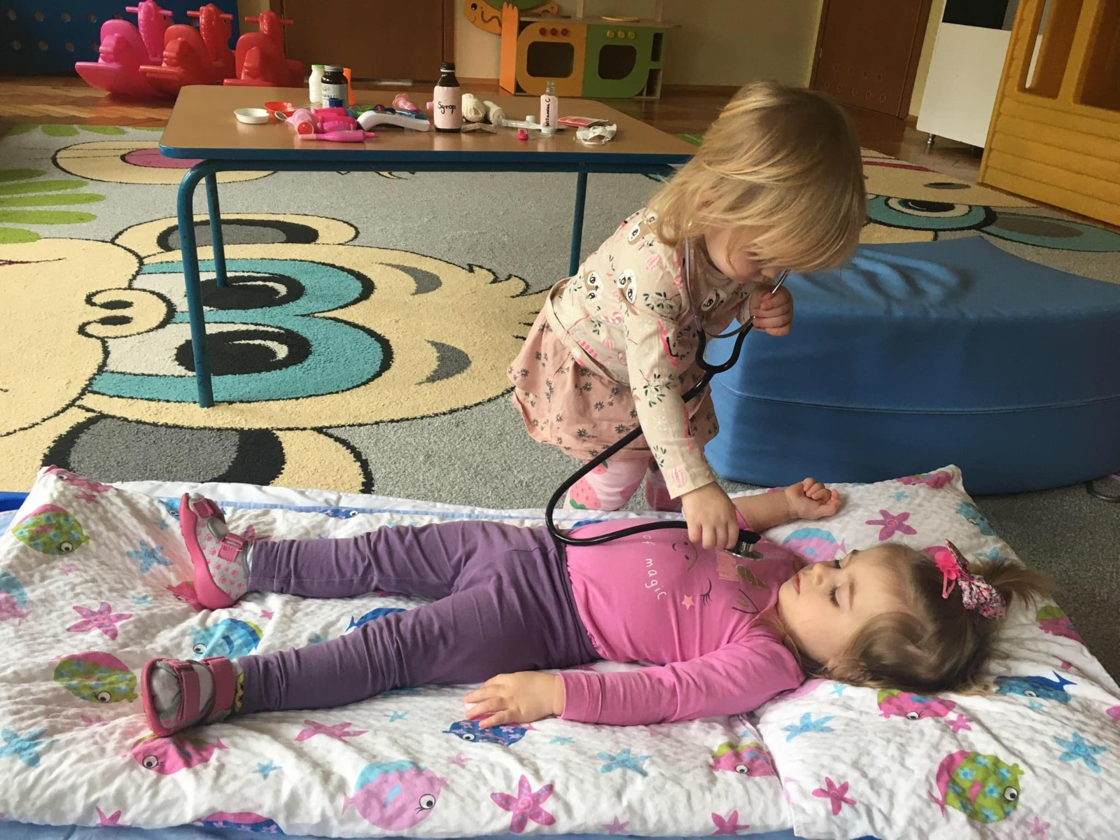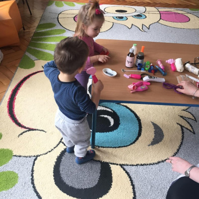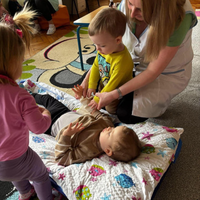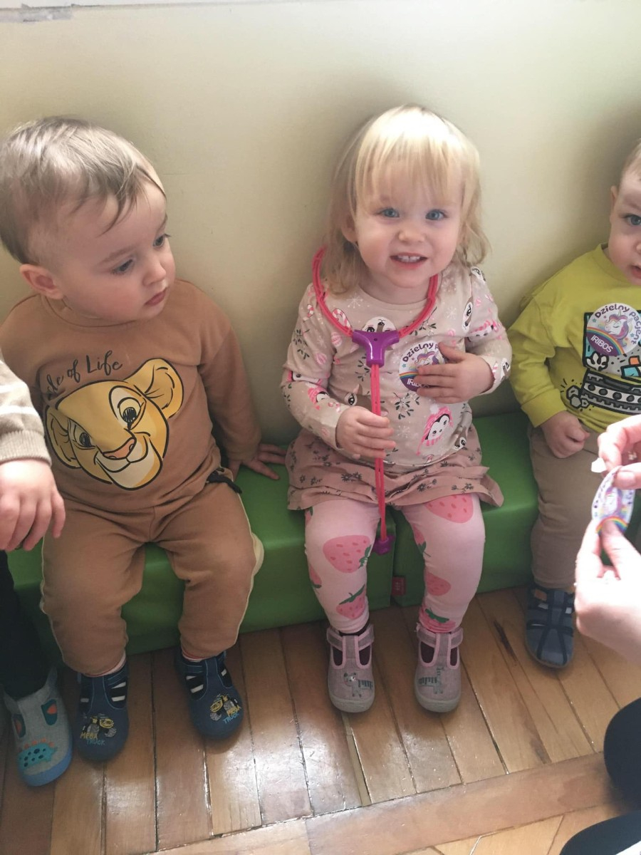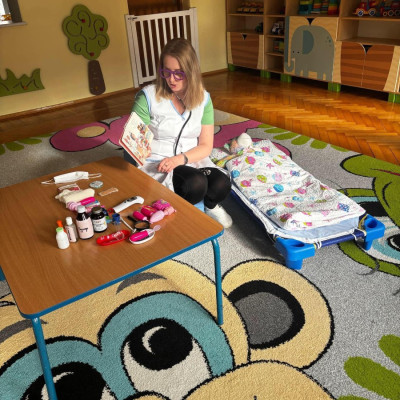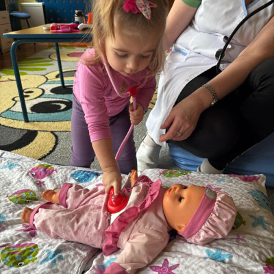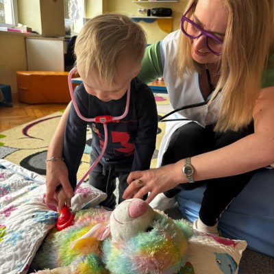 Dzieci z grupy "Biedronki" poznały zawód lekarza. Podczas wspólnej zabawy dowiedziały się, na czym polega jego praca, zapoznały się z akcesoriami medycznymi i mogły wcielić się w rolę lekarza. Na zakończenie wszystkie dzieci otrzymały odznaki „Dzielny Pacjent”.