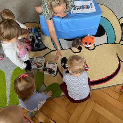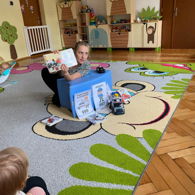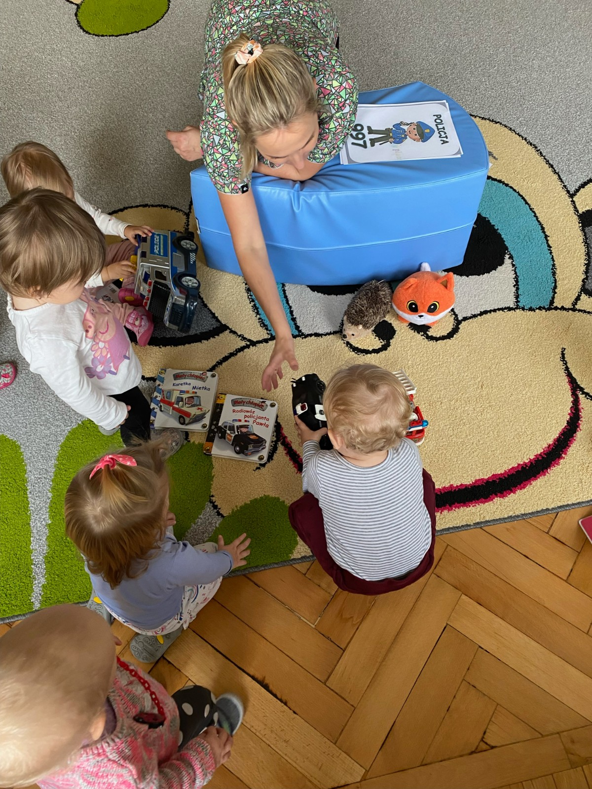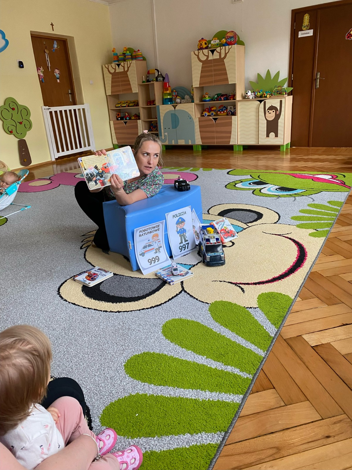 Dzieci poznały zawody ; strażaka, policjanta , lekarza. Miały okazję poznać numery alarmowe i dźwięk syren pojazdów uprzywilejowanych 🚒🚑🚓