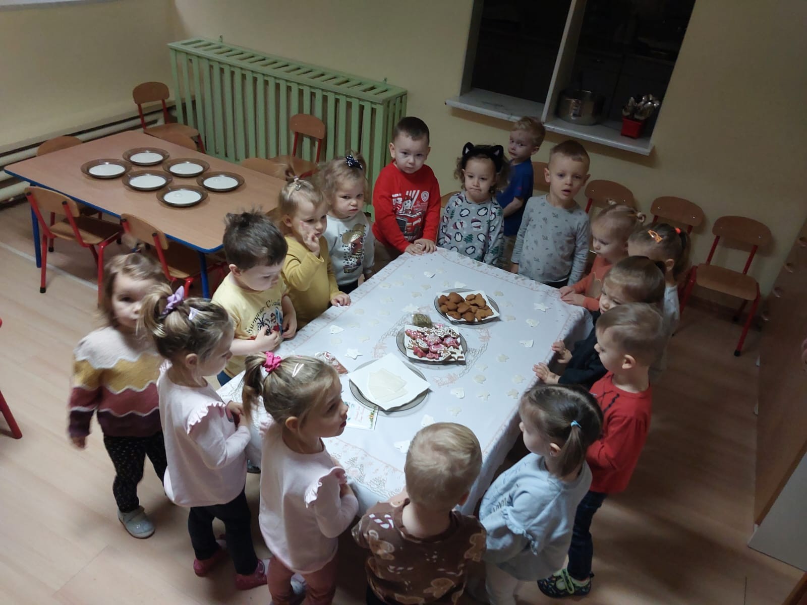 Zdjęcie przedstawia stół z pierniczkami i opłatkiem