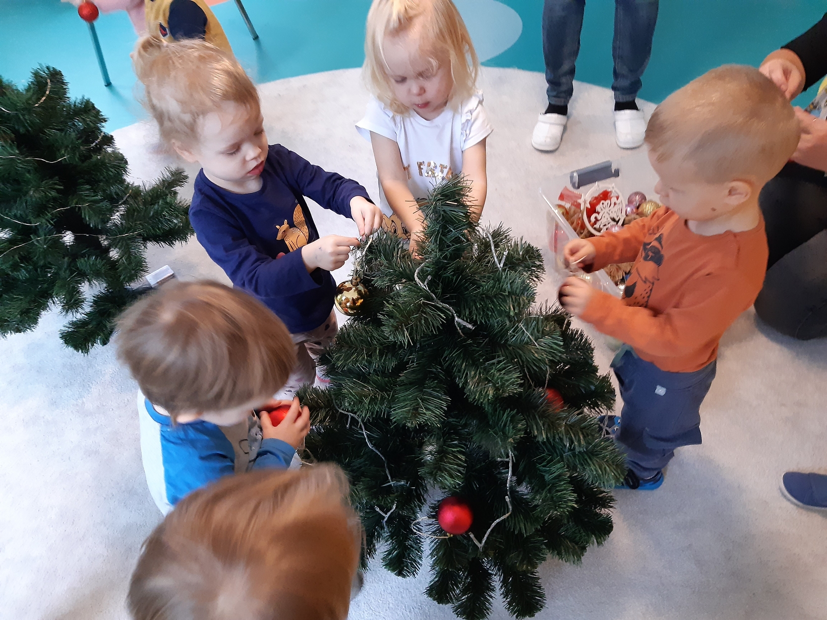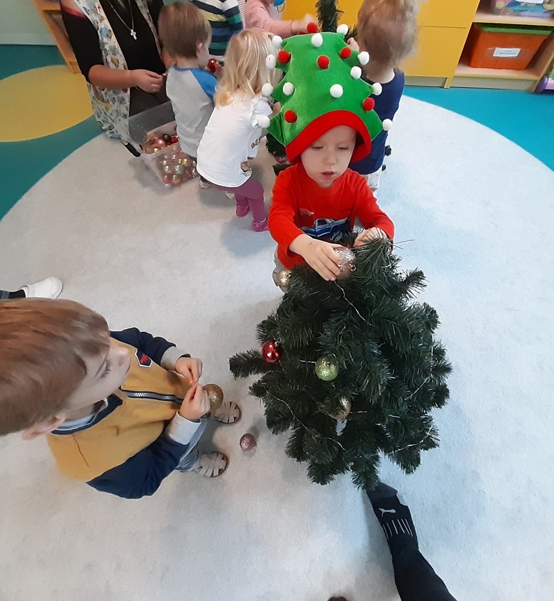 Dziś w ramach zajęć nasze Żabki z pomocą pań opiekunek ozdabiały świąteczne drzewko w kolorowe bombki,  łańcuchy oraz lampki a  po zakończonych zajęciach śpiewały piosenkę której uczyły się od kilku dni,, Choinko piękna jak las".