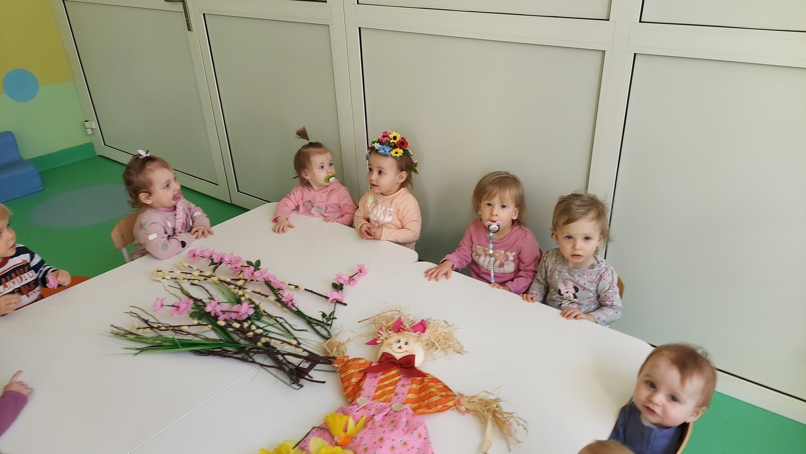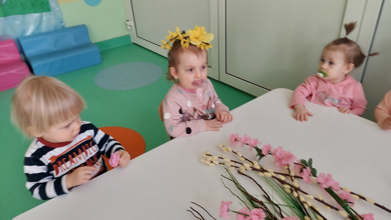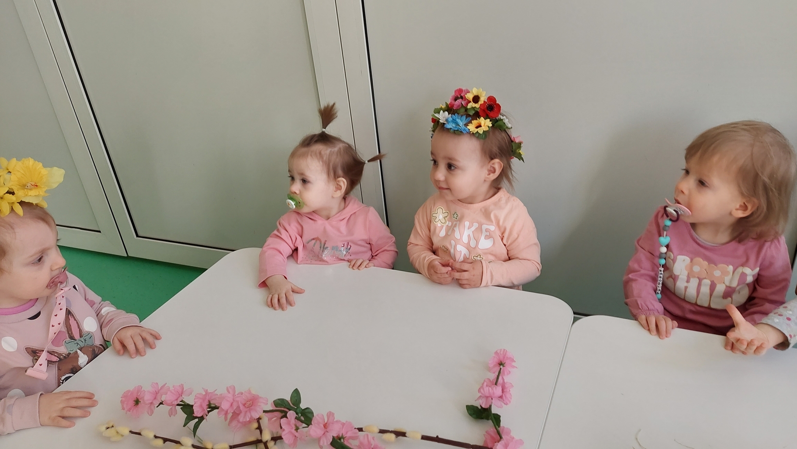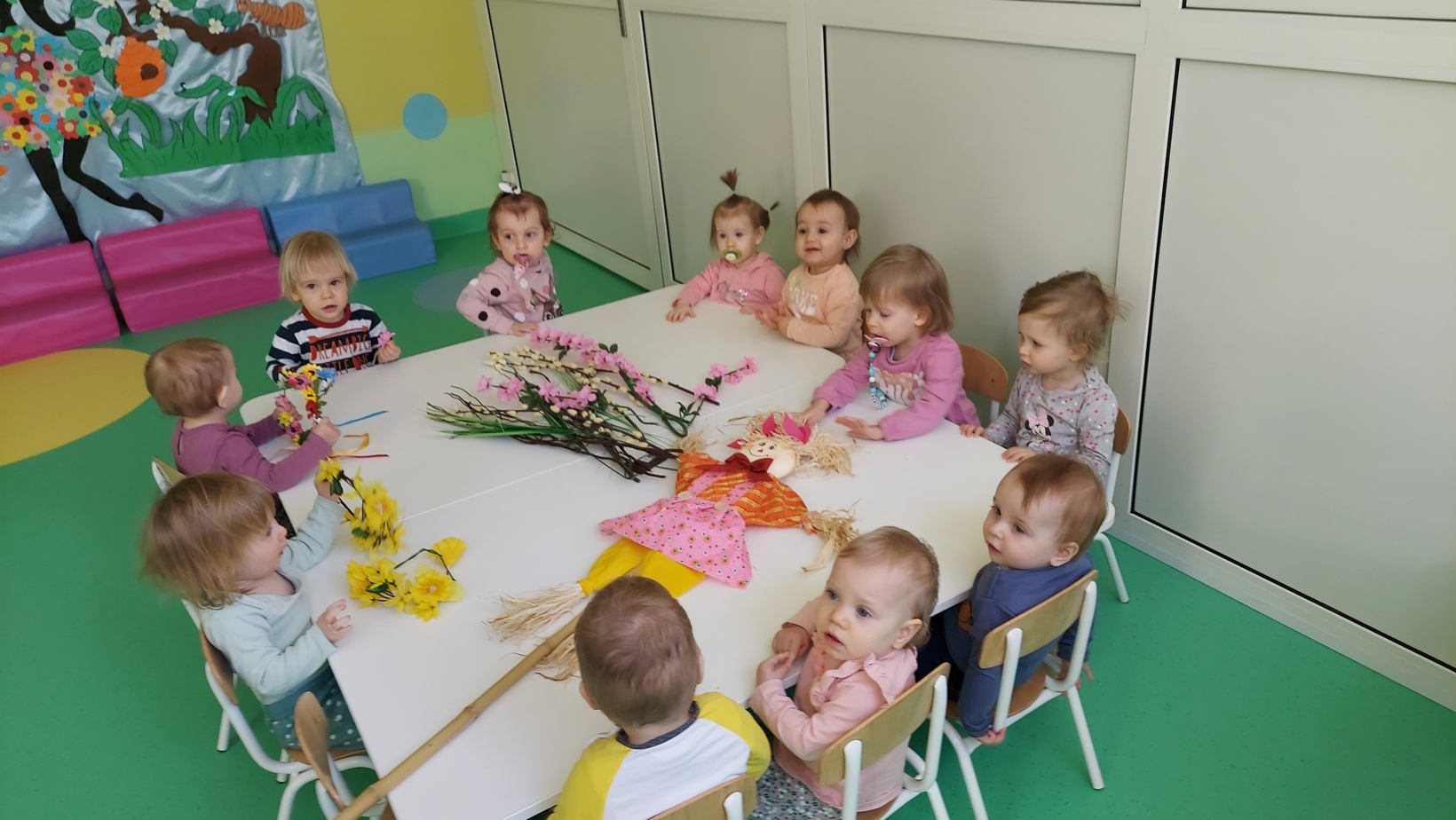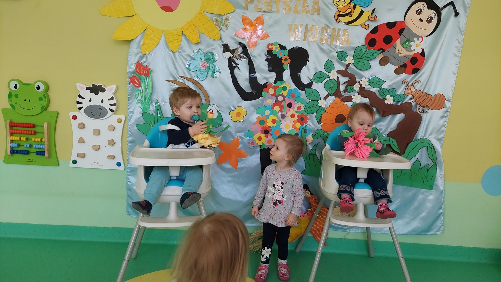 20 marca dzieci z grupy Misie powitały długo oczekiwaną wiosnę. W nastrój wiosenny wprowadziła nas piosennka ,,Tam daleko, gdzie wysoka sosna".Dzieci poznały Panią Wiosnę oraz jej pierwsze zwiastuny: kwiaty, bazie, jaskółki, pszczółki, drzewa z pierwszymi listkami, promienne słońce, na tyle których zrobiły sobie pamiątkowe zdjęcie. Później w ramach zabawy z poznanych kwiatów, bazi i innych zwiastunów przy pomocy pań zrobiliśmy wiosenne wianki i marzanne - symbol odchodzącej zimy. Nasze Misie z kwiatami w ręce i marzanną dumnie maszerowały by ostatecznie pożegnać zimę, a powitać nową porę roku - wiosne. Mamy nadzieję że już zostanie z nami i będziemy mogli spacerować po żłobkowym ogrodzie, by podziwiać jak pięknie zmienia się przyroda.