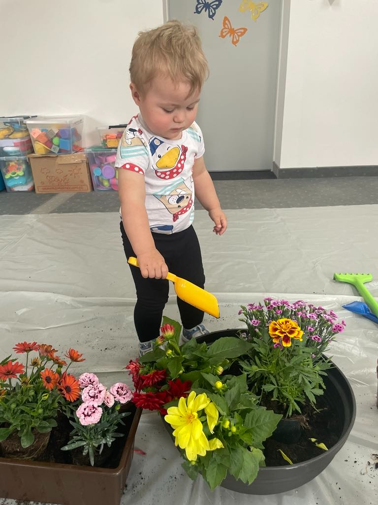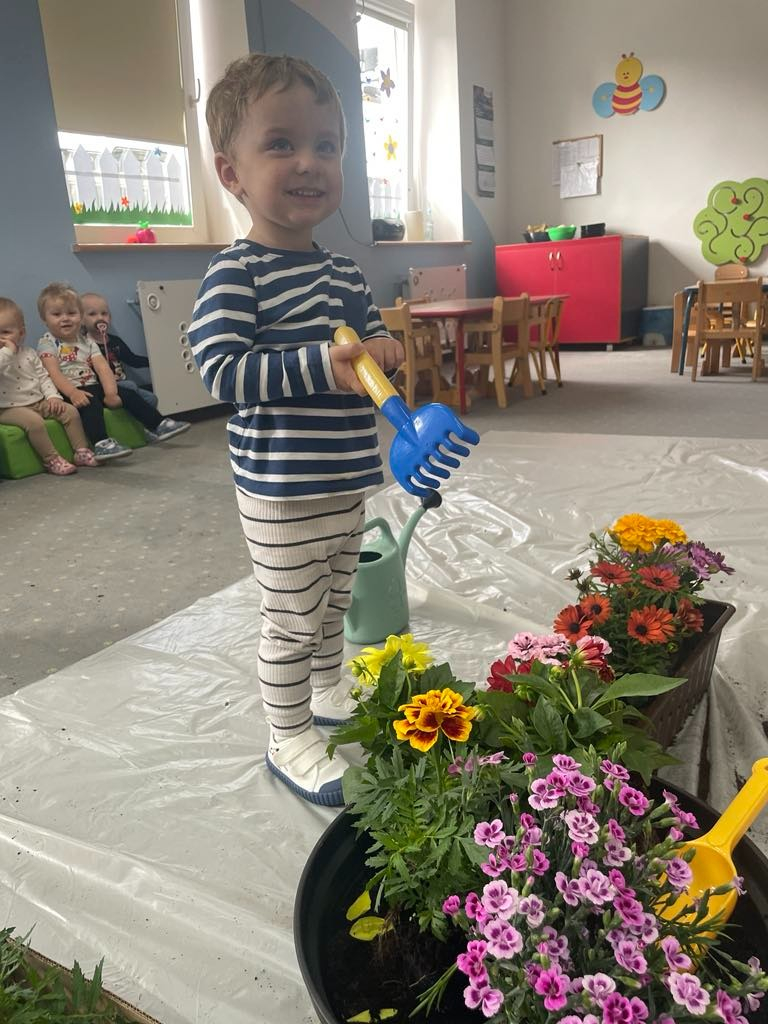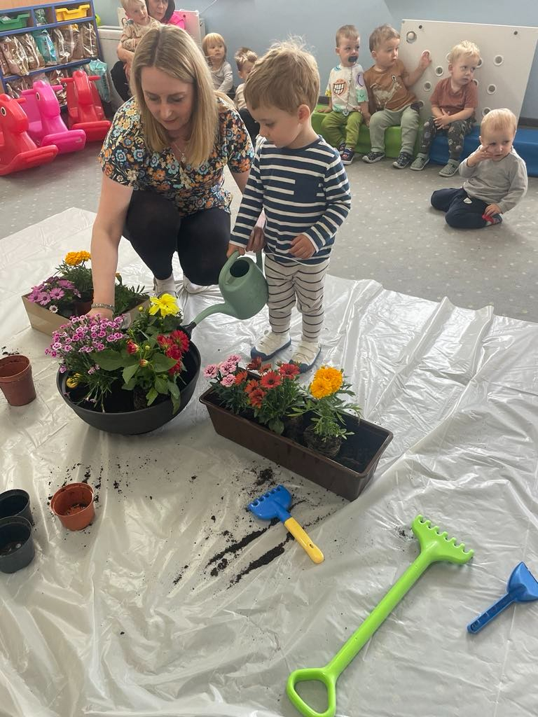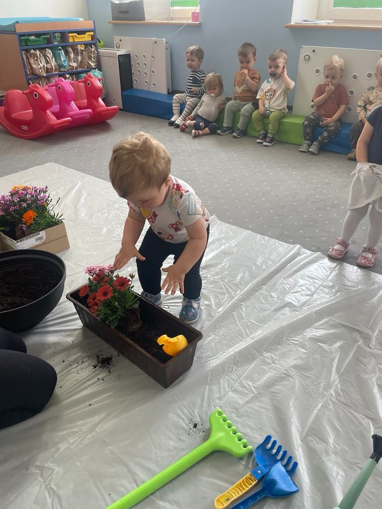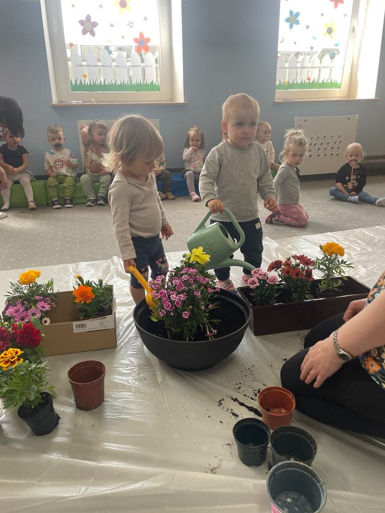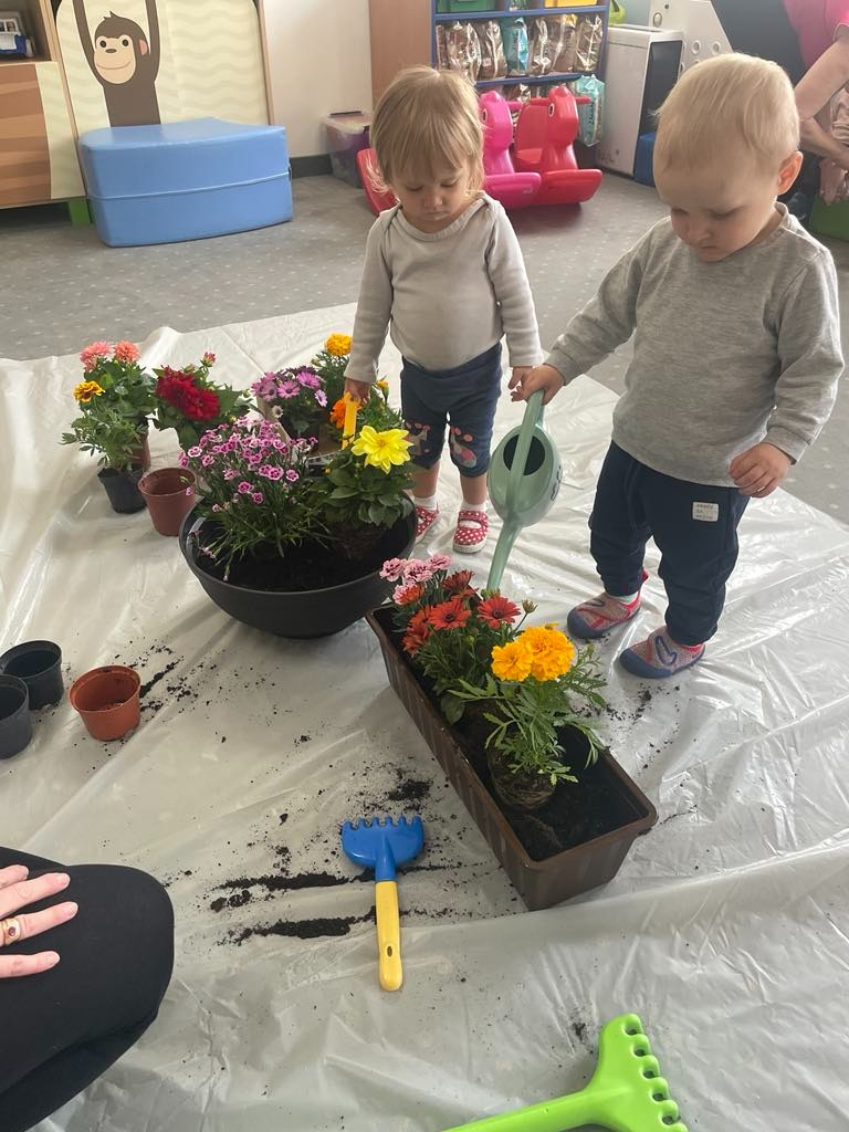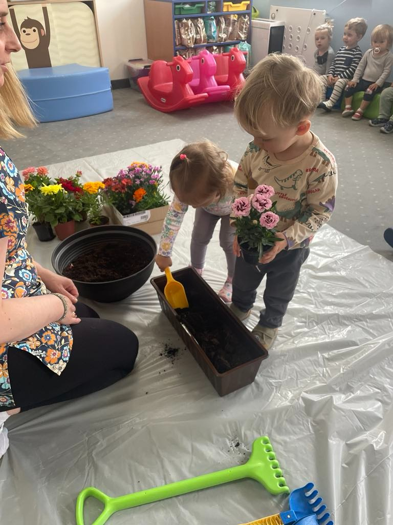„Biedronki ” z pierwszej grupy zamieniły się w małych ogrodników i posadziły kwiaty w donicach. Praca ta bardzo spodobała się dzieciom, które z radością przygotowywały doniczki z ziemią, wsadzały kolorowe kwiaty i podlewały je.