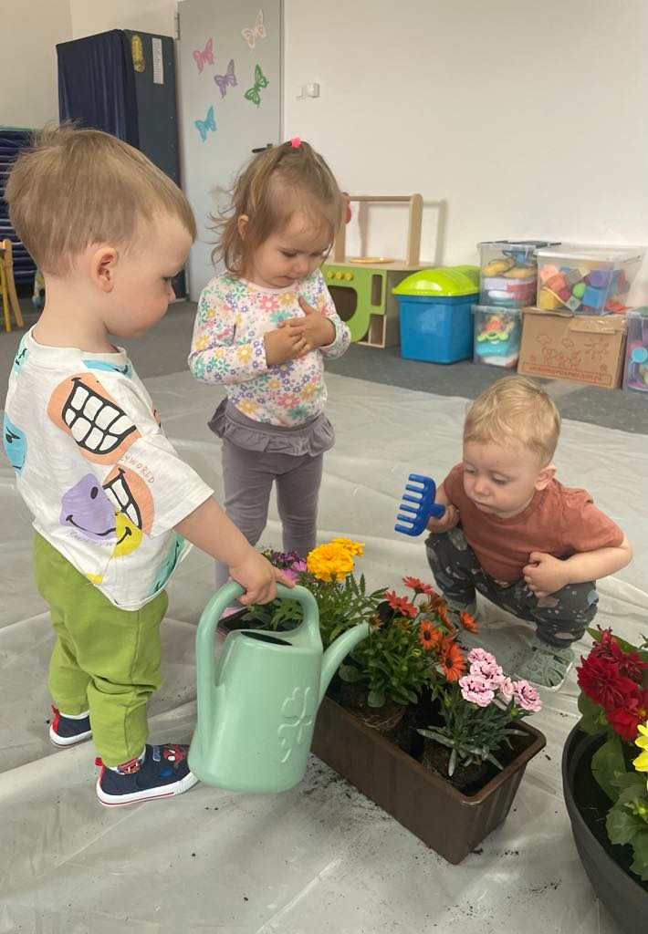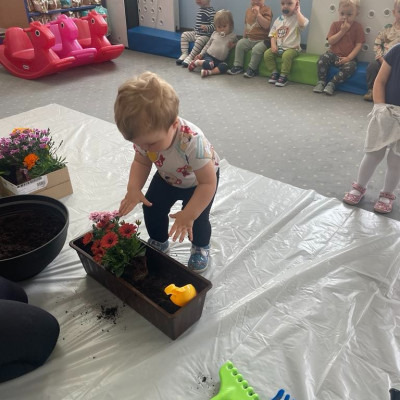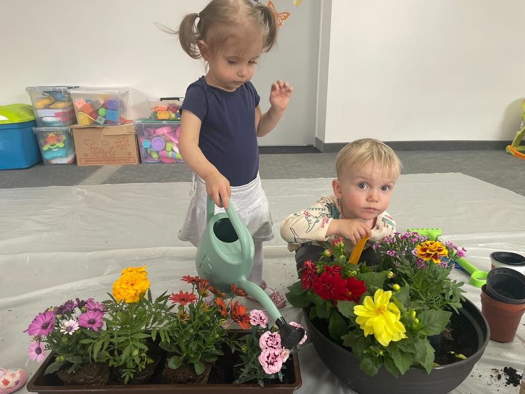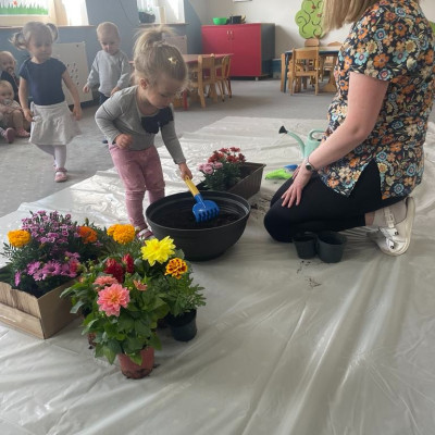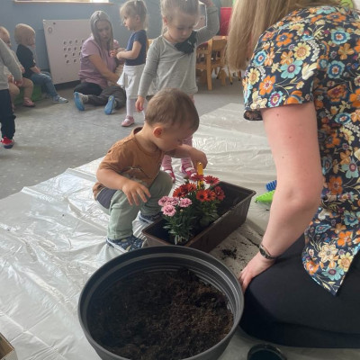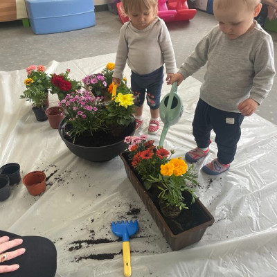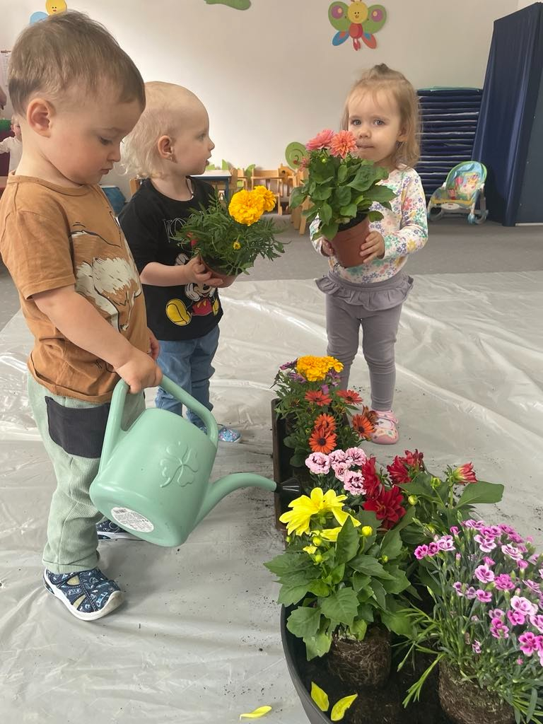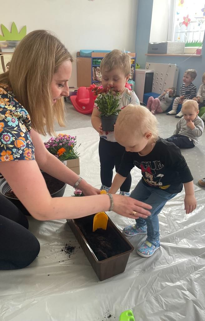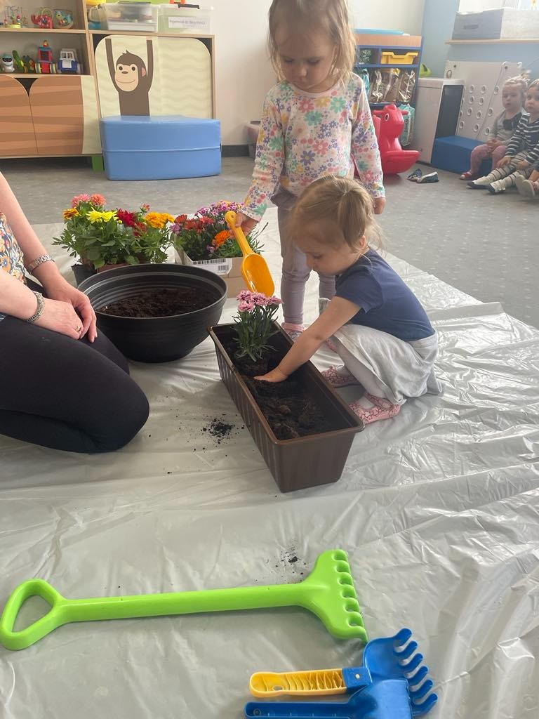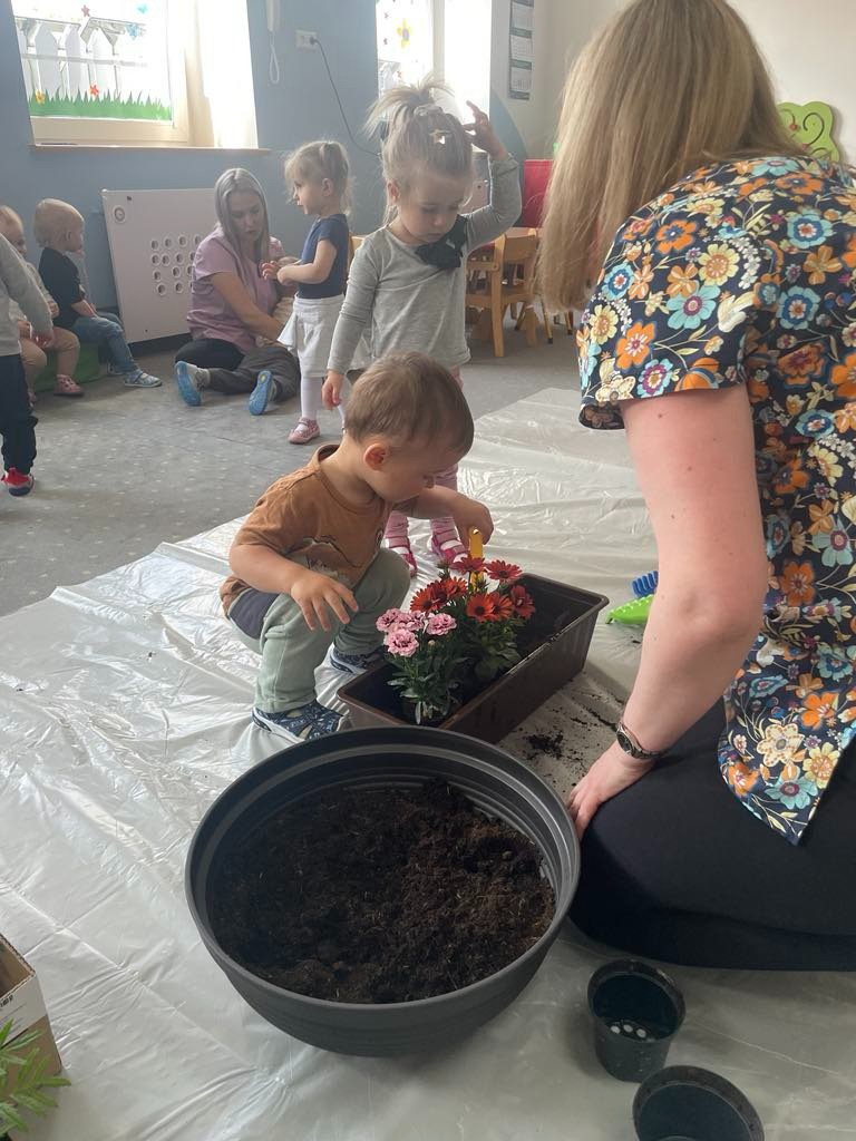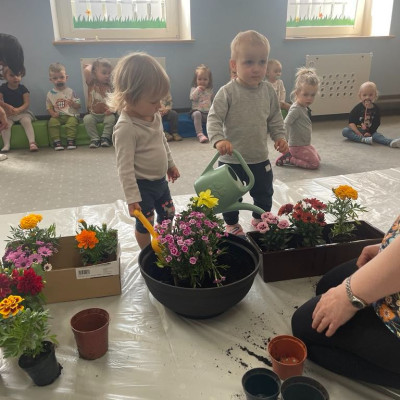 „Biedronki ” z pierwszej grupy zamieniły się w małych ogrodników i posadziły kwiaty w donicach. Praca ta bardzo spodobała się dzieciom, które z radością przygotowywały doniczki z ziemią, wsadzały kolorowe kwiaty i podlewały je.