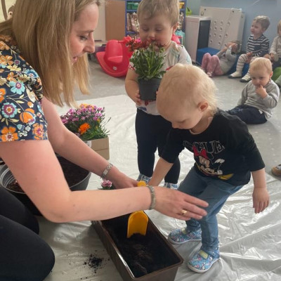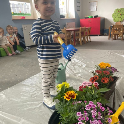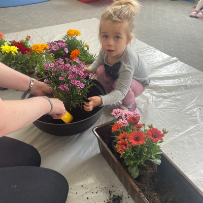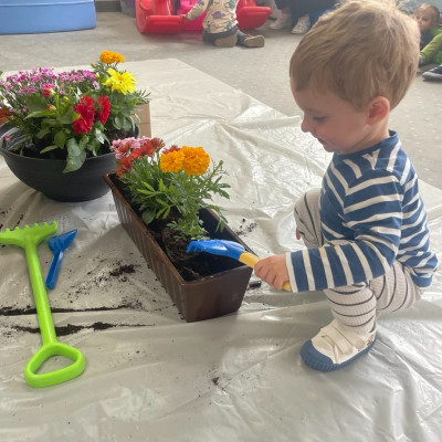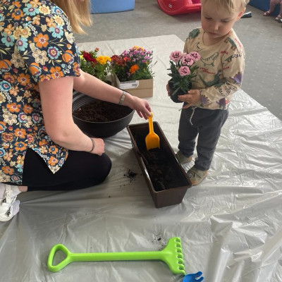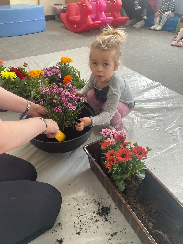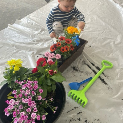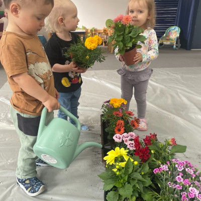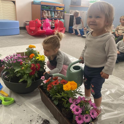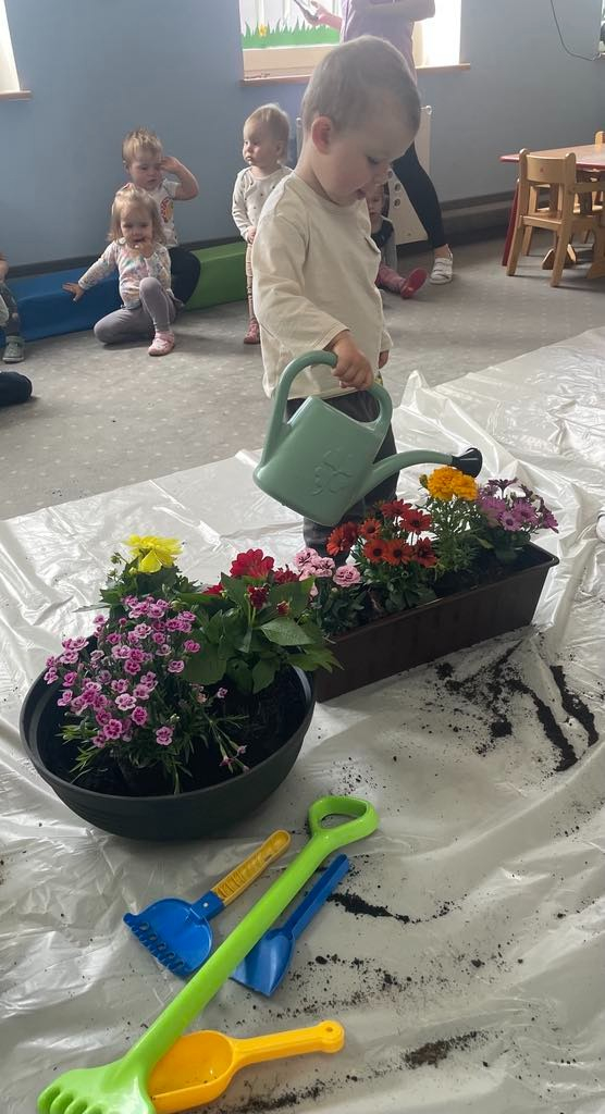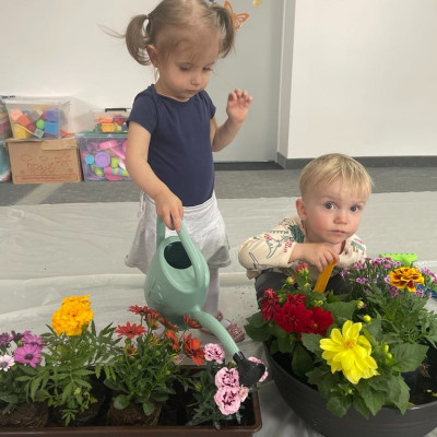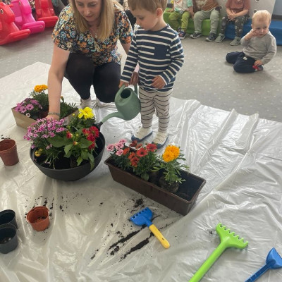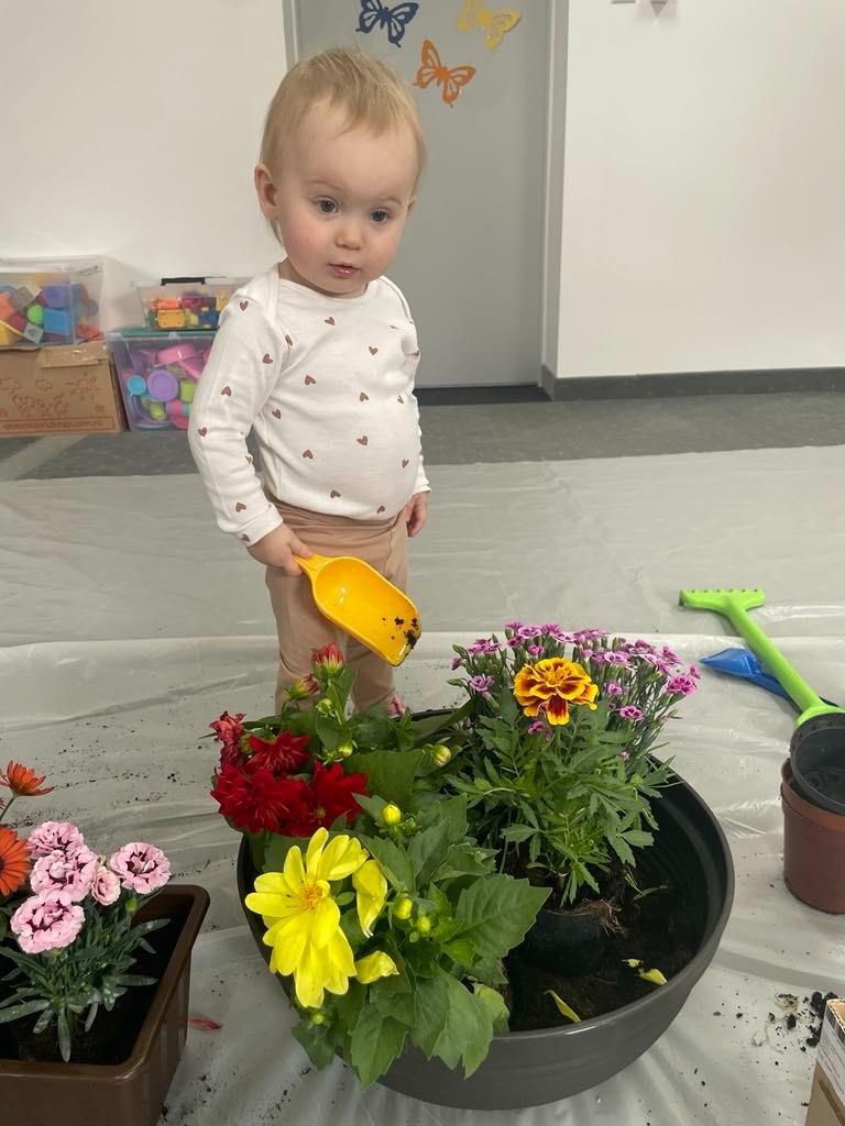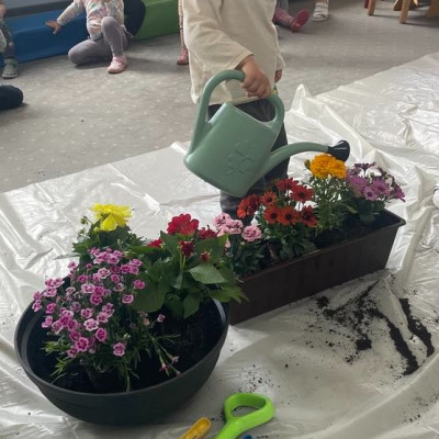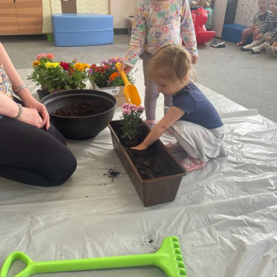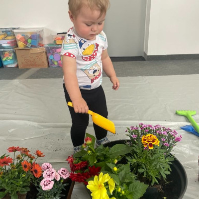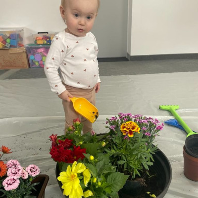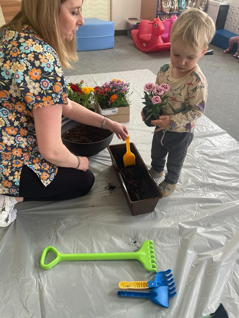 „Biedronki ” z pierwszej grupy zamieniły się w małych ogrodników i posadziły kwiaty w donicach. Praca ta bardzo spodobała się dzieciom, które z radością przygotowywały doniczki z ziemią, wsadzały kolorowe kwiaty i podlewały je.
