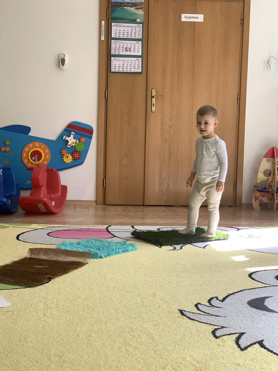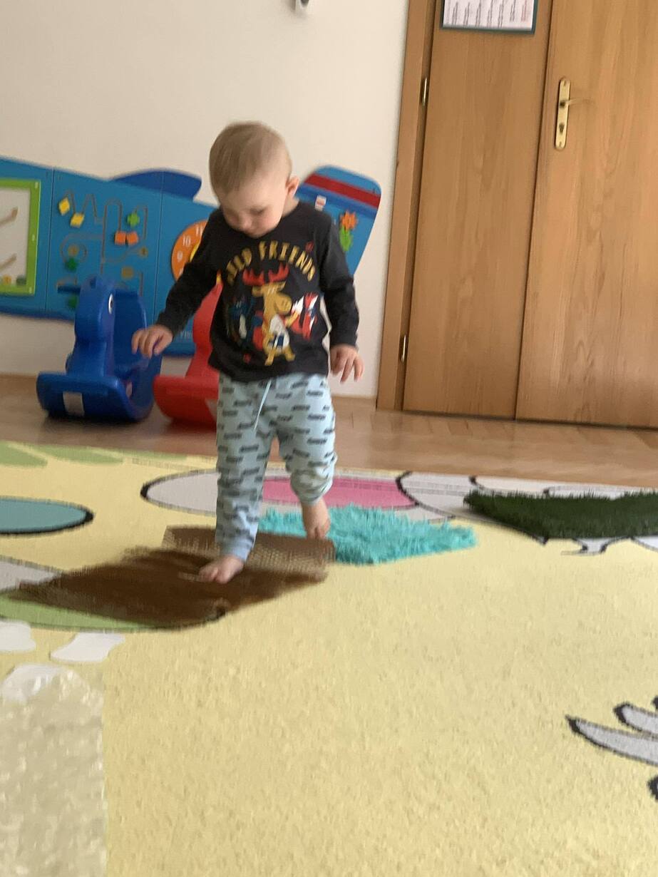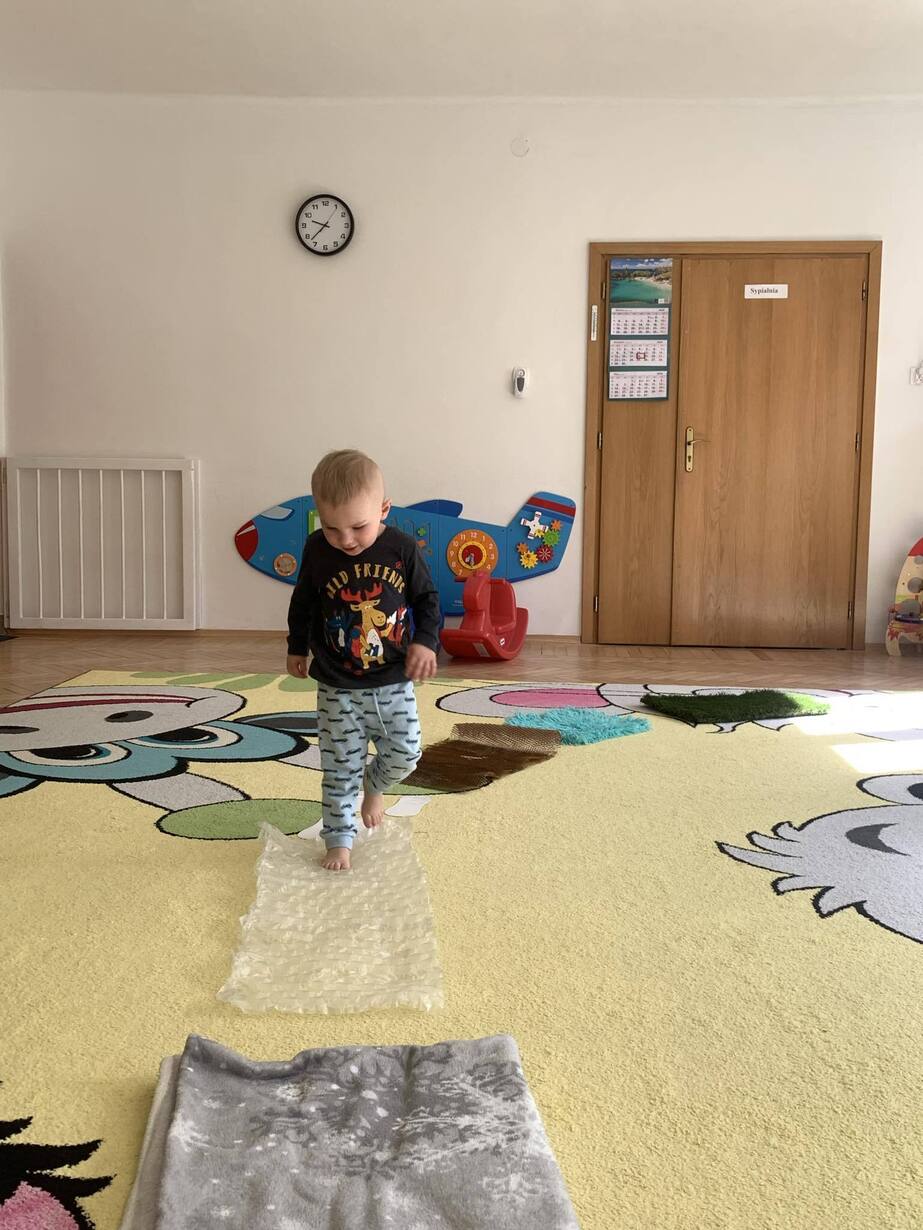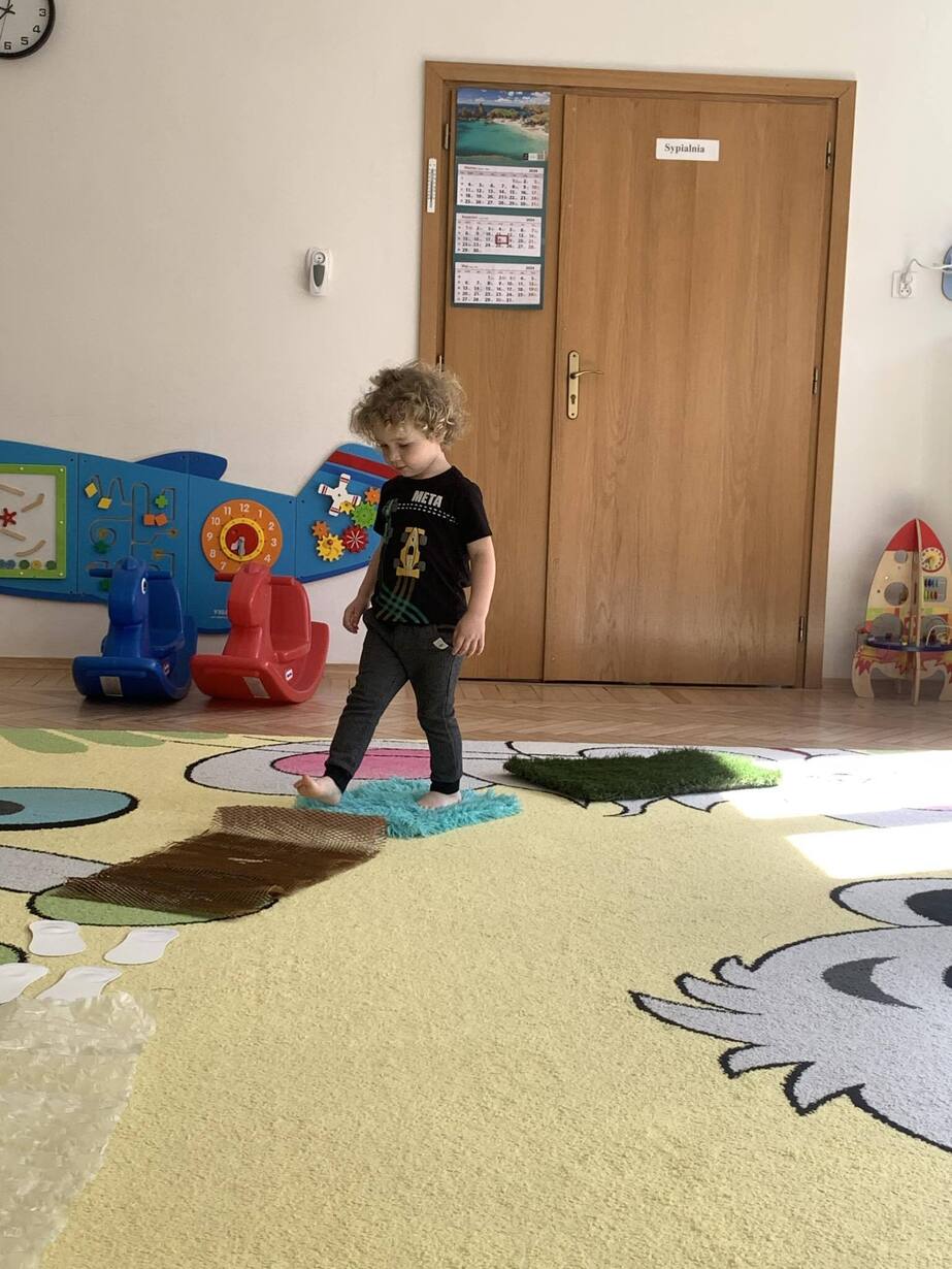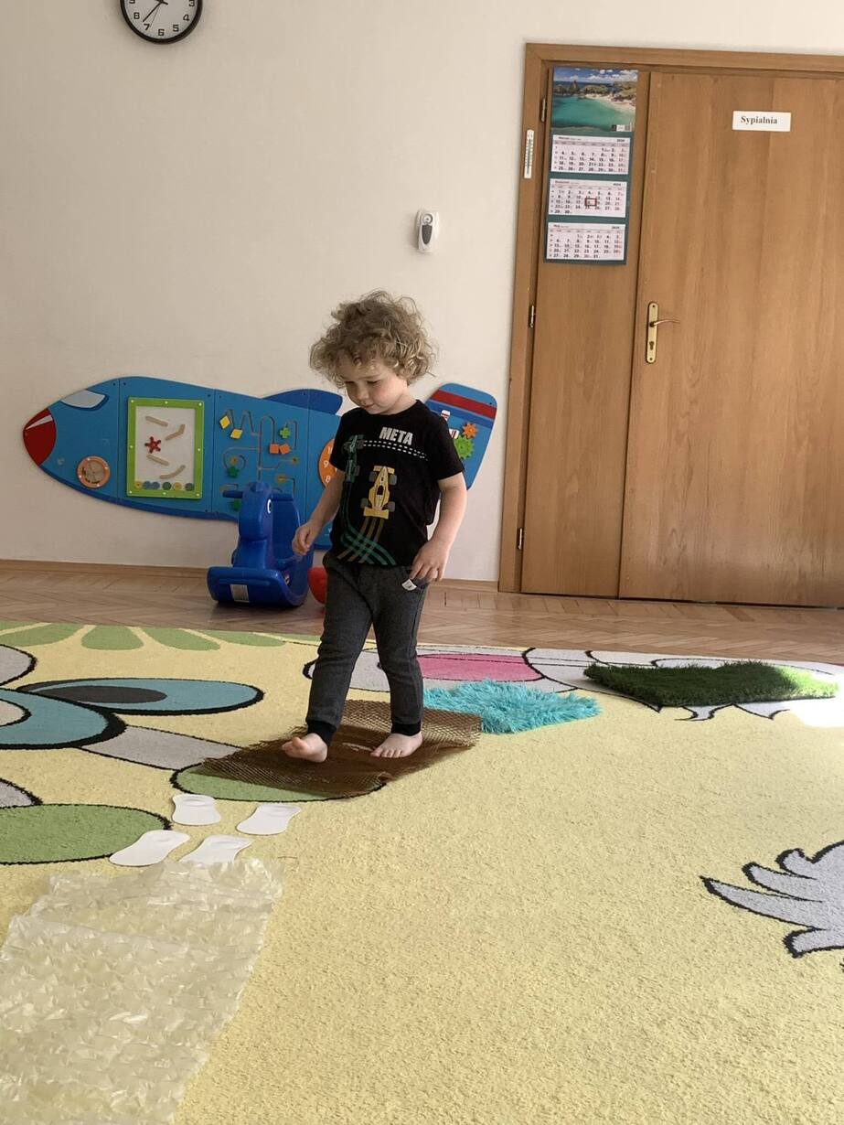 W grupie Misiów była świetna zabawa sensoryczna, która pozwala dzieciom na poznanie świata za pomocą zmysłów. Dzieci spacerując gołymi stopami miały okazję poznać podłoże, składające się z różnych faktur.