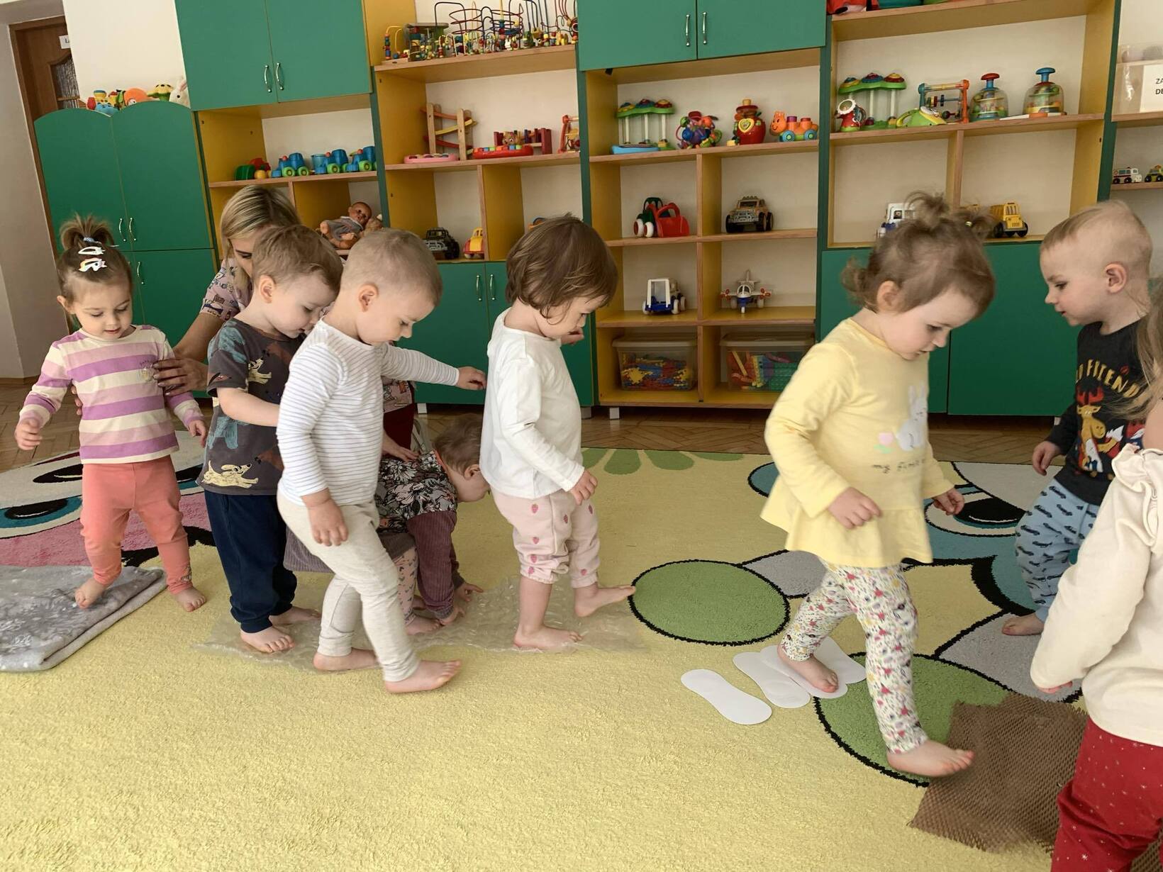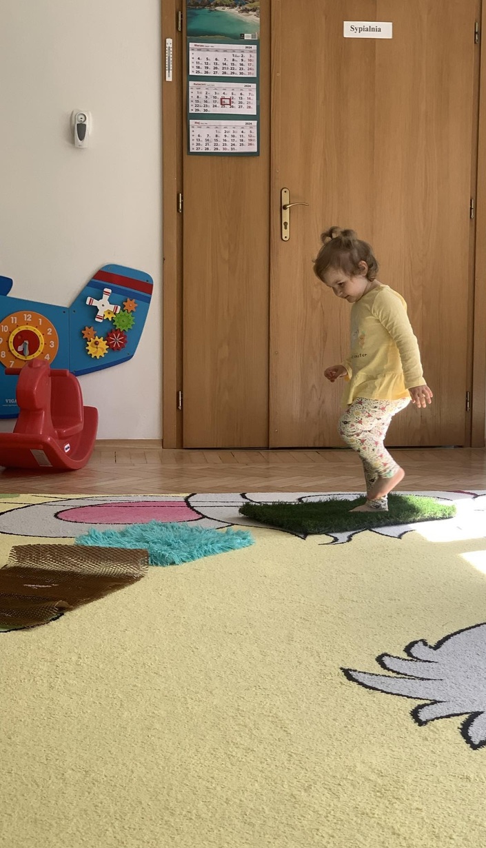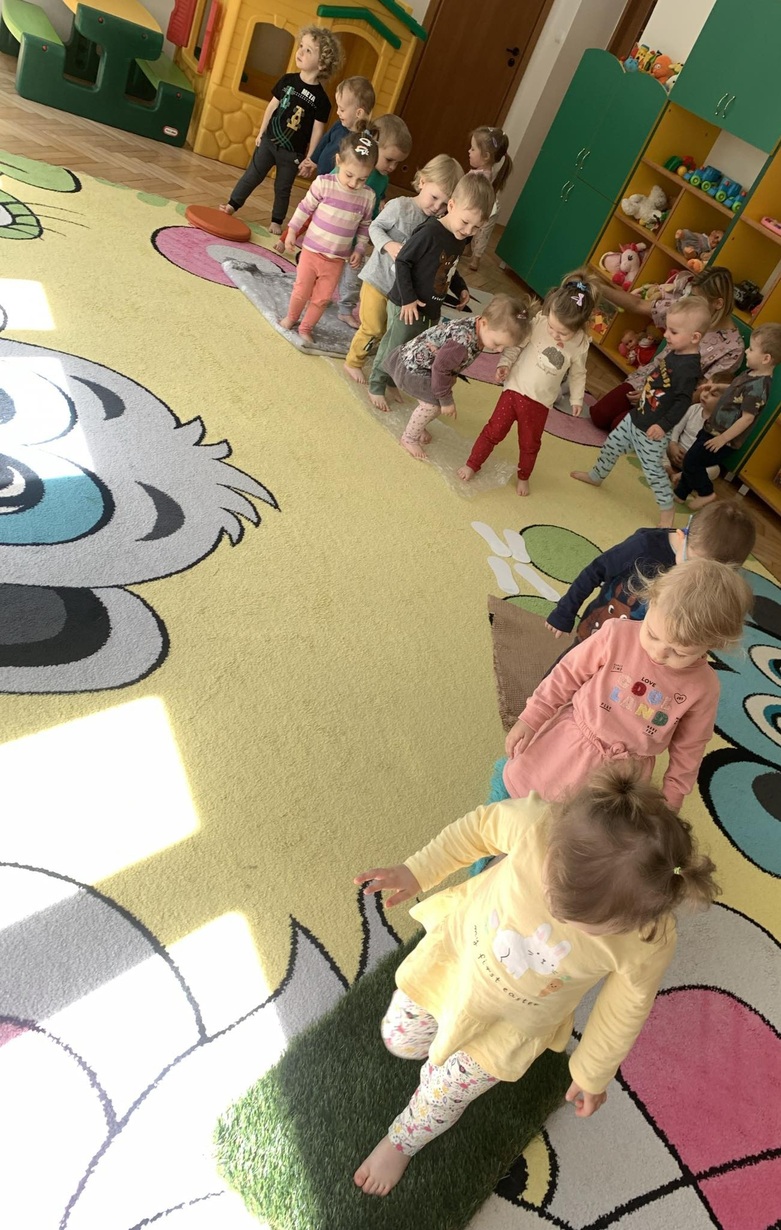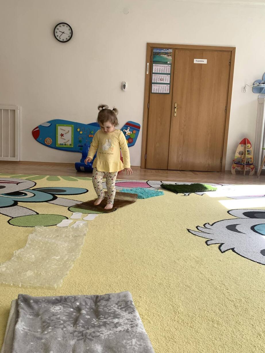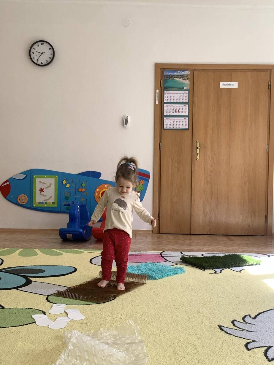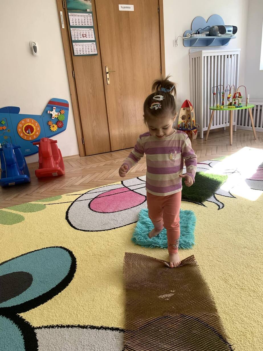 W grupie Misiów była świetna zabawa sensoryczna, która pozwala dzieciom na poznanie świata za pomocą zmysłów. Dzieci spacerując gołymi stopami miały okazję poznać podłoże, składające się z różnych faktur.