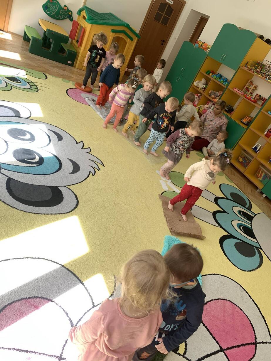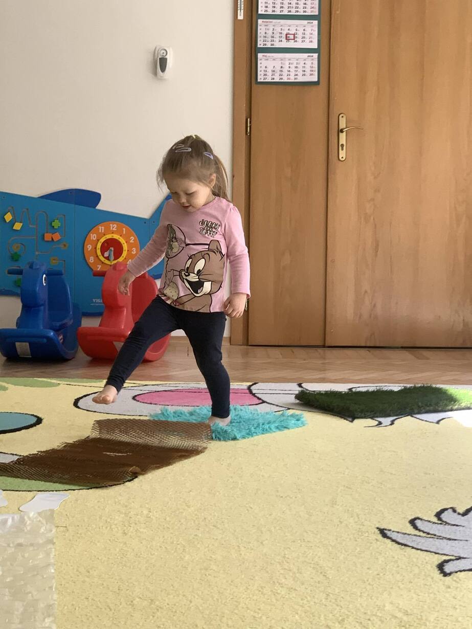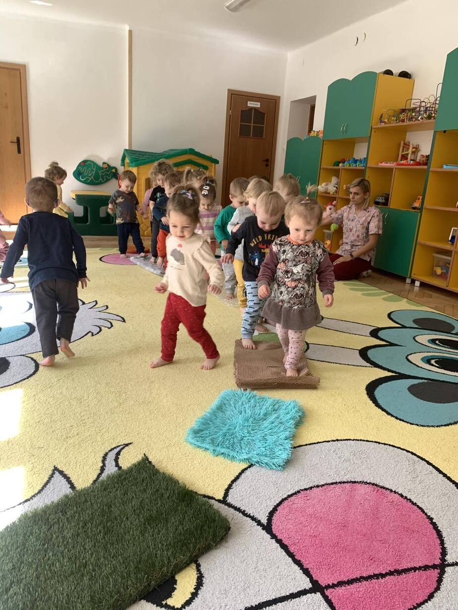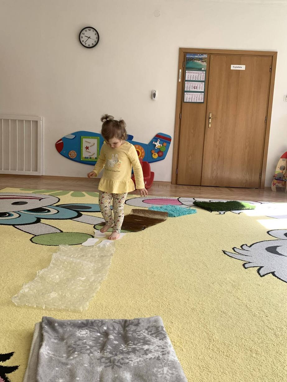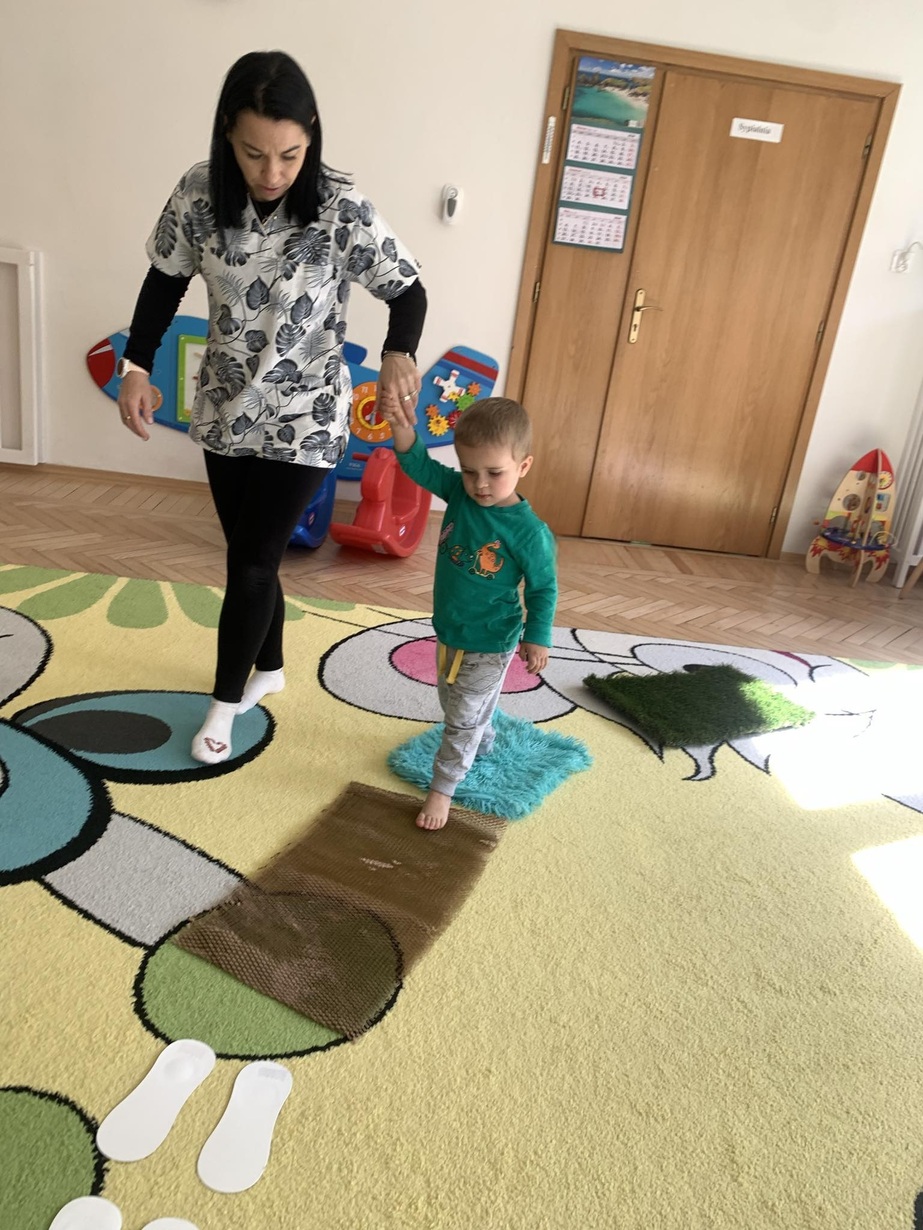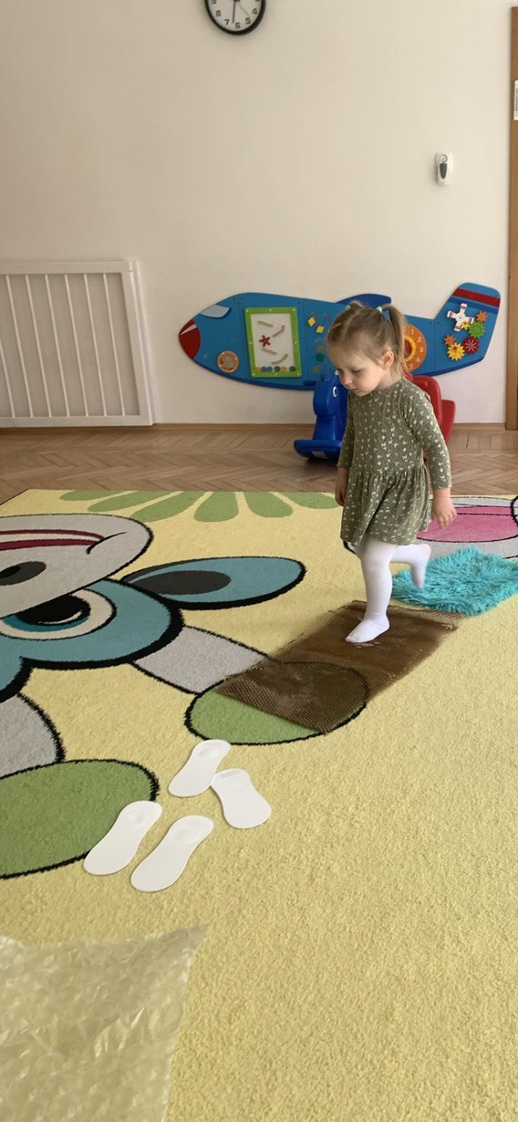 W grupie Misiów była świetna zabawa sensoryczna, która pozwala dzieciom na poznanie świata za pomocą zmysłów. Dzieci spacerując gołymi stopami miały okazję poznać podłoże, składające się z różnych faktur.