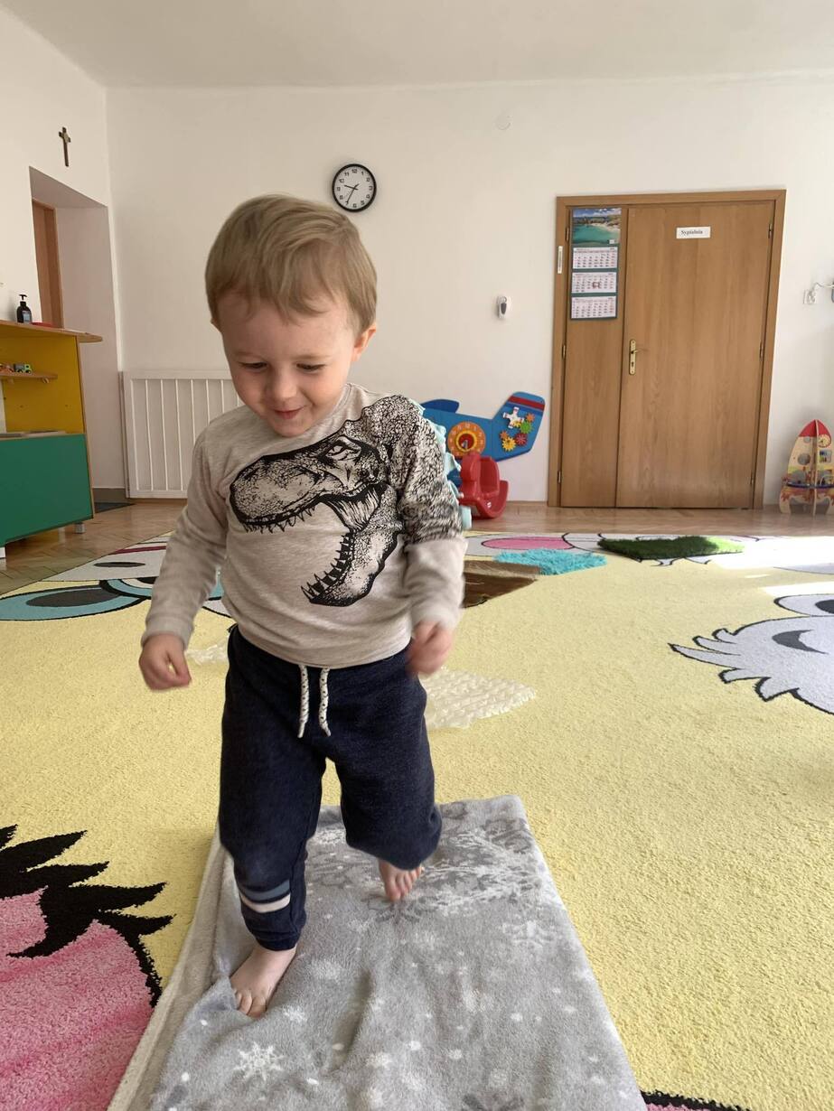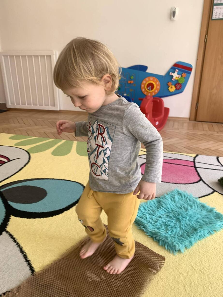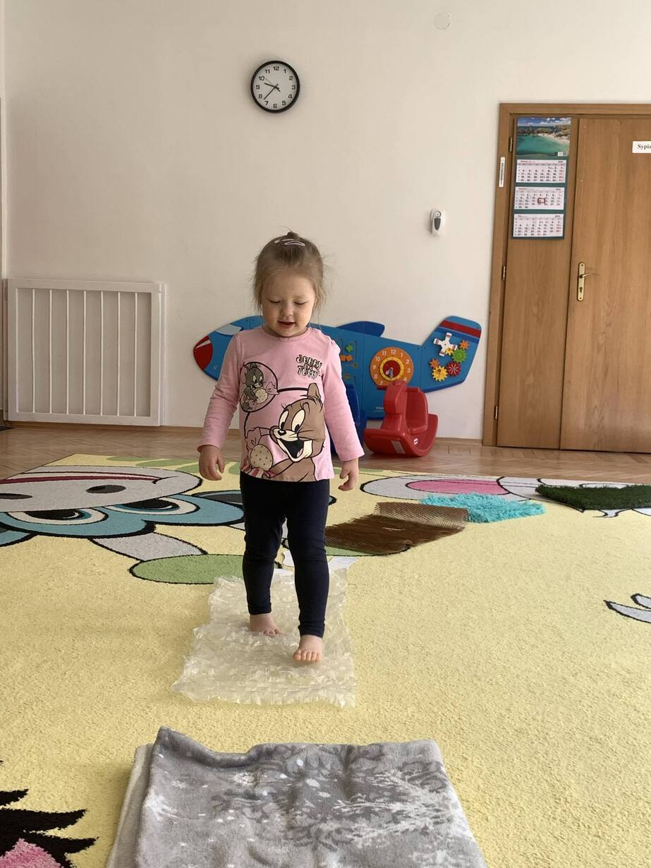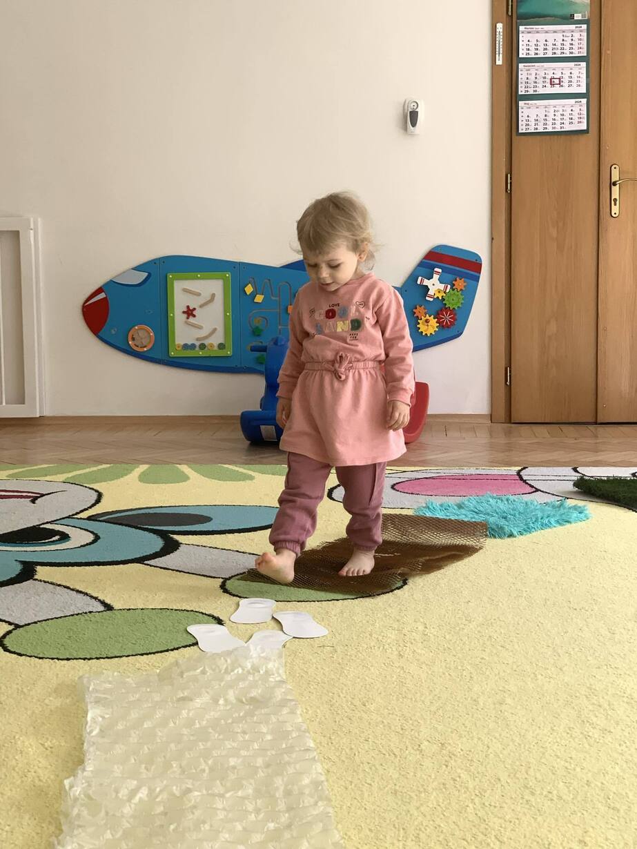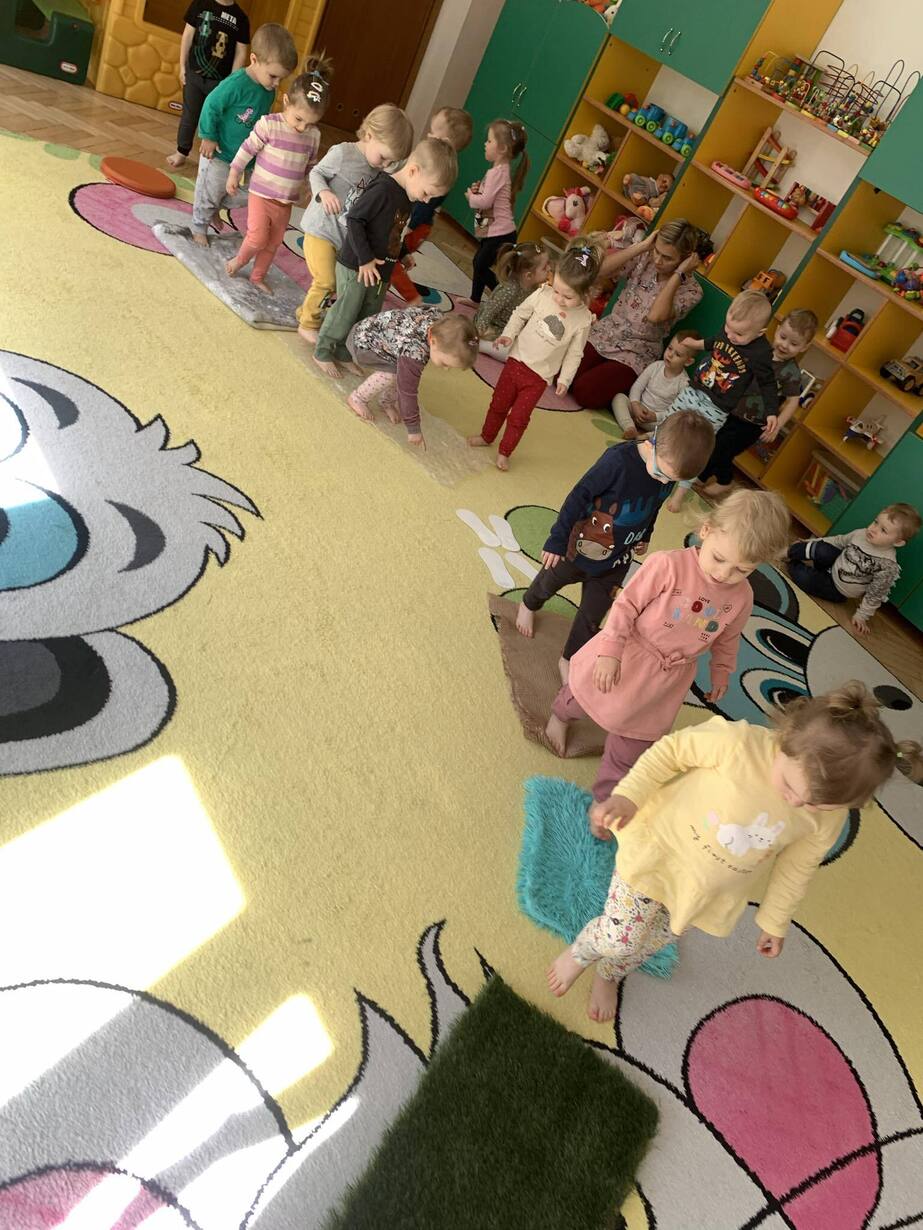 W grupie Misiów była świetna zabawa sensoryczna, która pozwala dzieciom na poznanie świata za pomocą zmysłów. Dzieci spacerując gołymi stopami miały okazję poznać podłoże, składające się z różnych faktur.