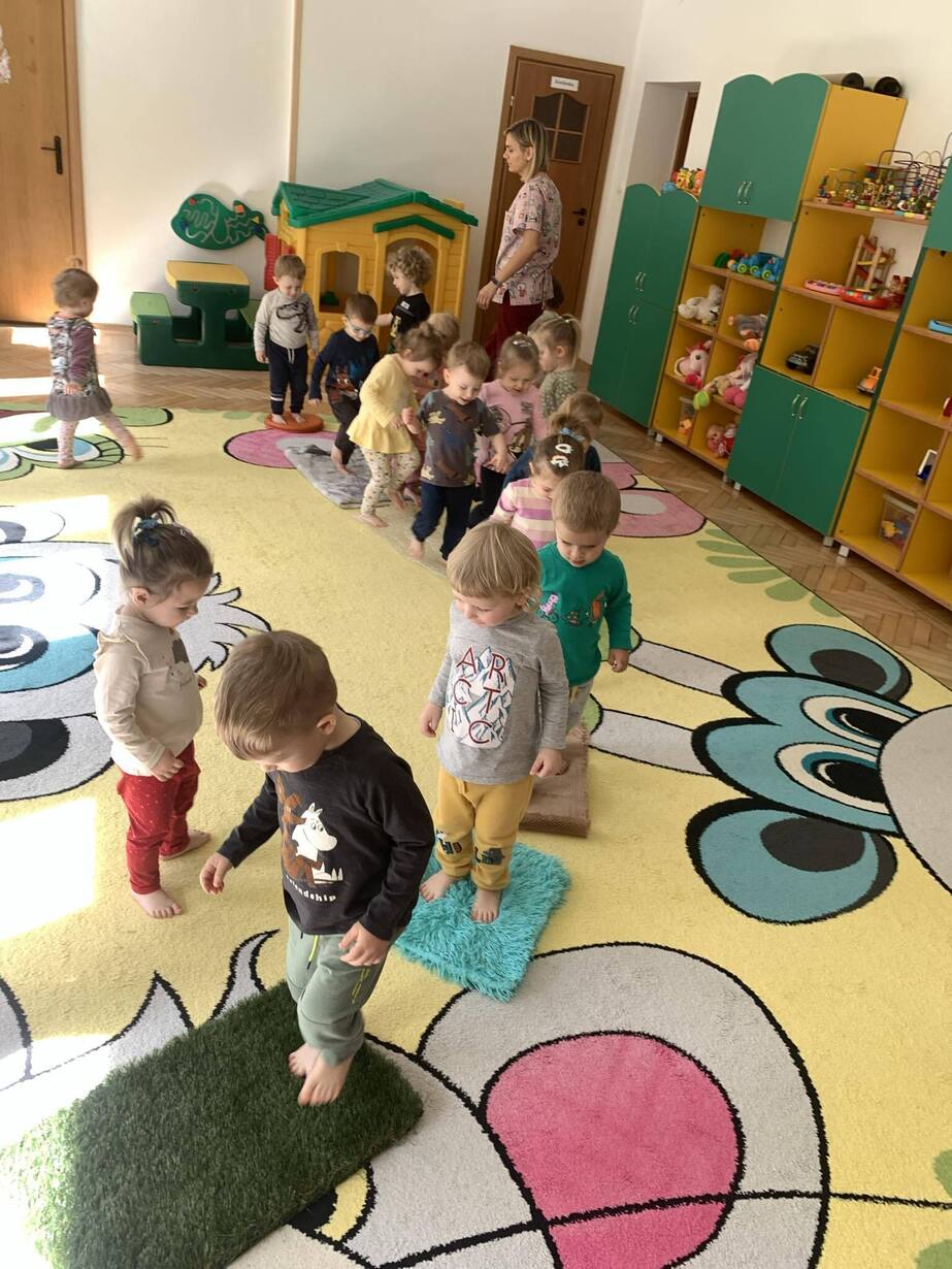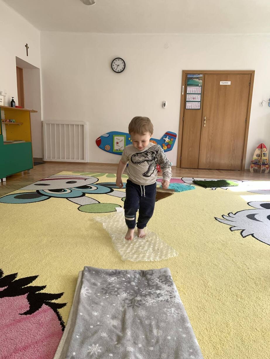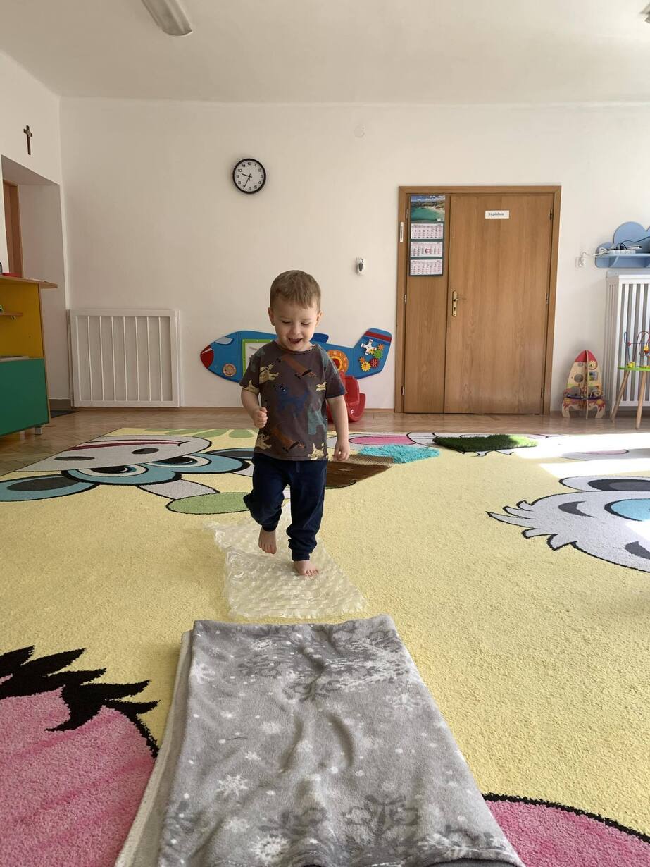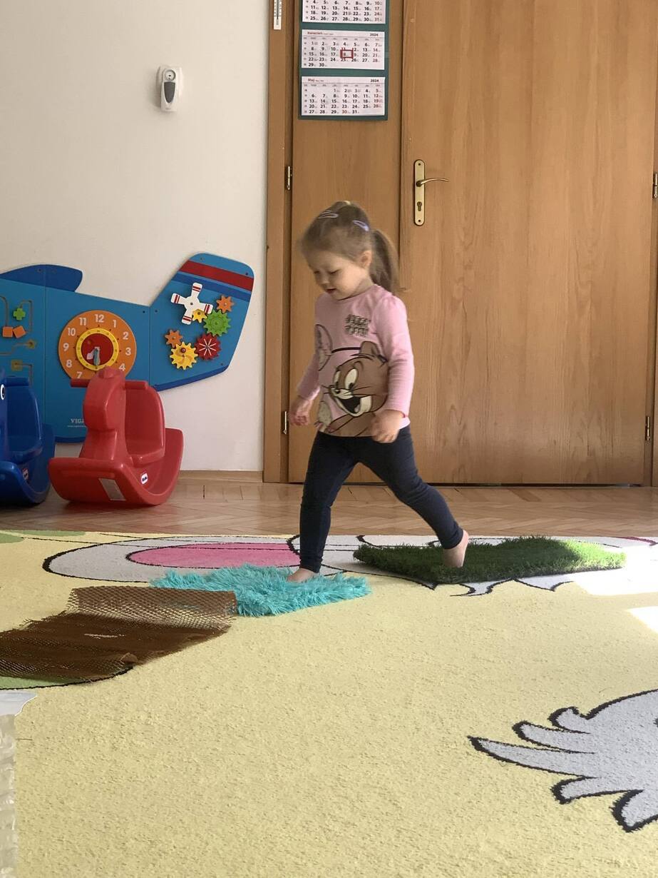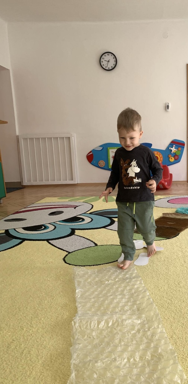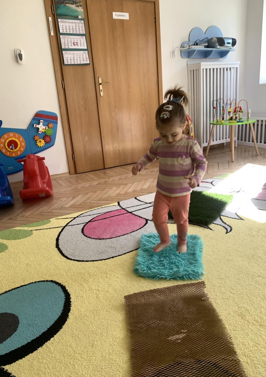 W grupie Misiów była świetna zabawa sensoryczna, która pozwala dzieciom na poznanie świata za pomocą zmysłów. Dzieci spacerując gołymi stopami miały okazję poznać podłoże, składające się z różnych faktur.