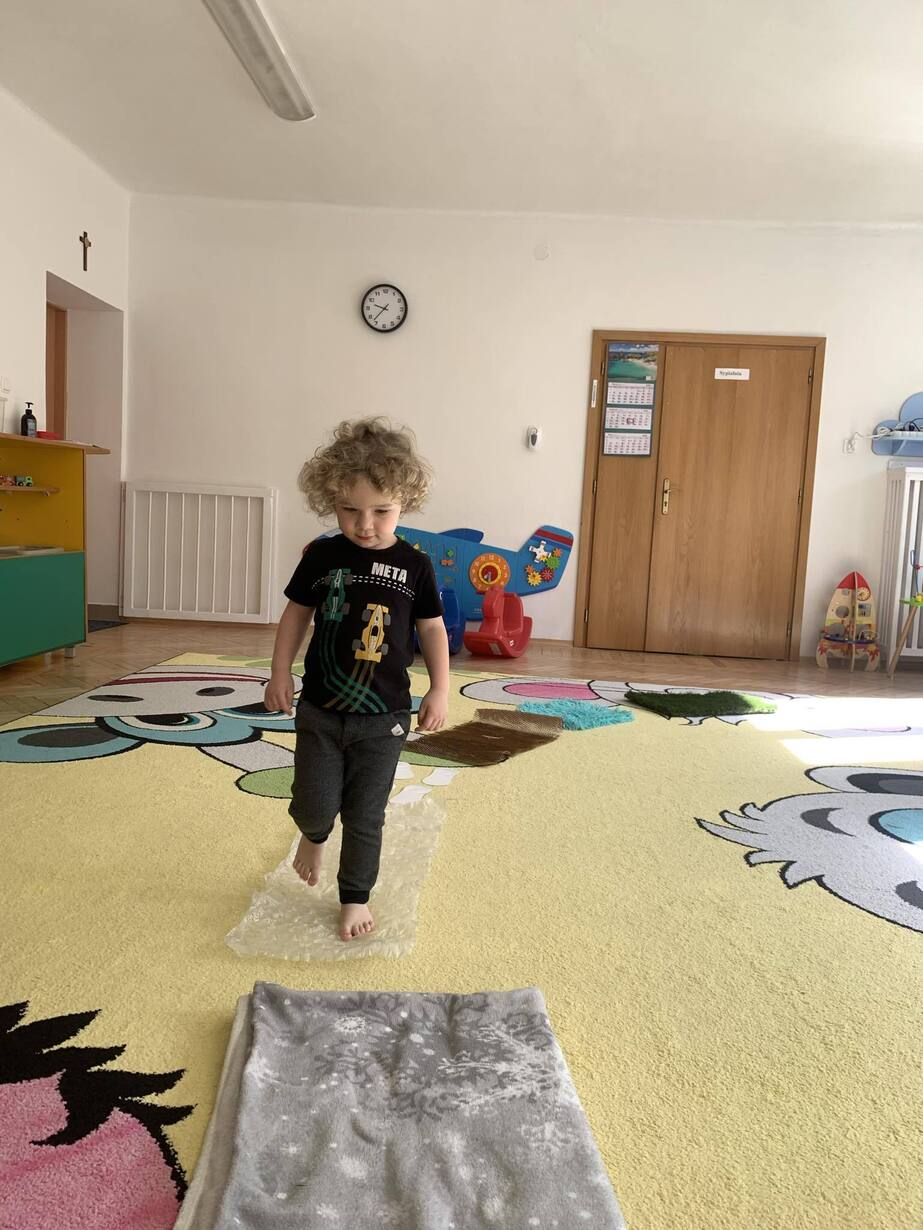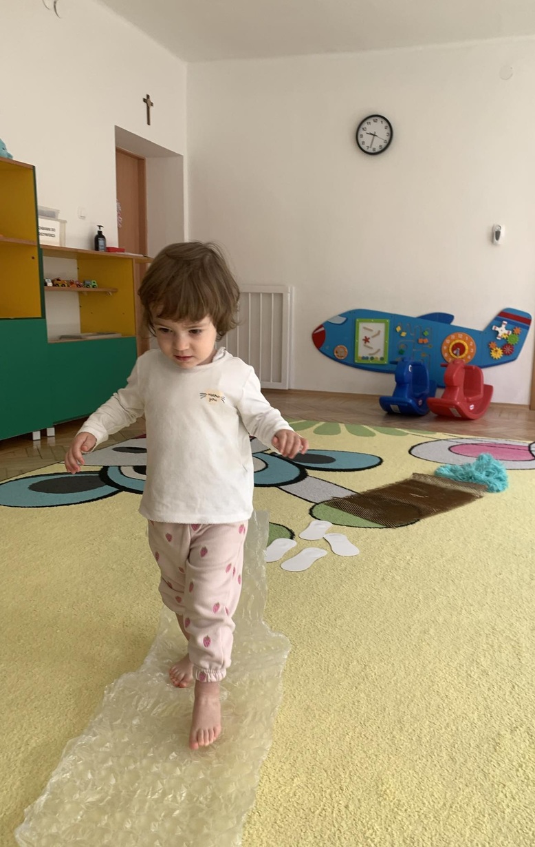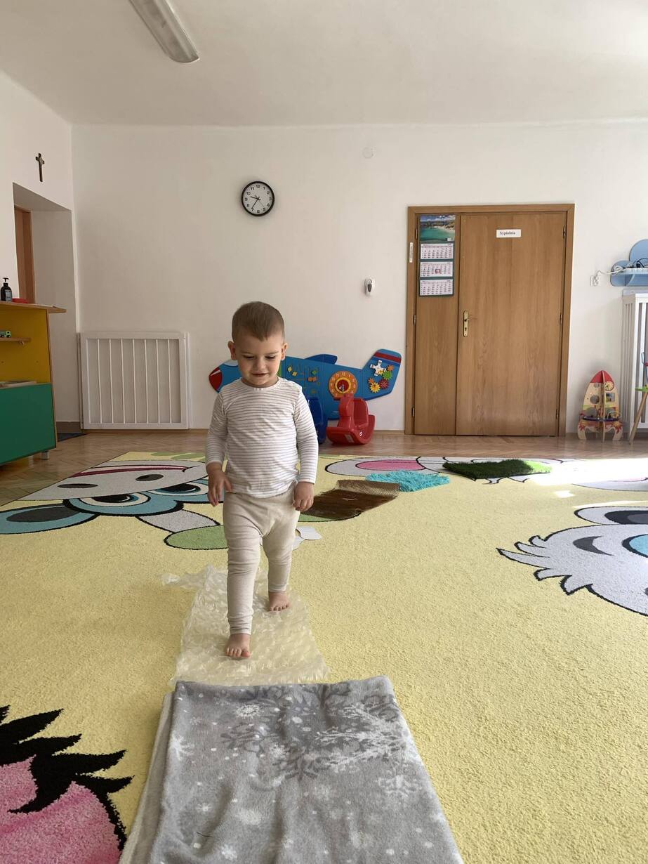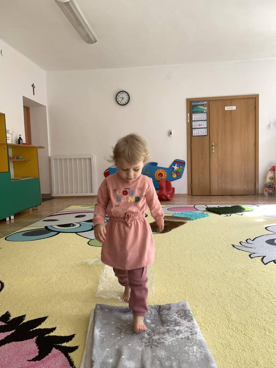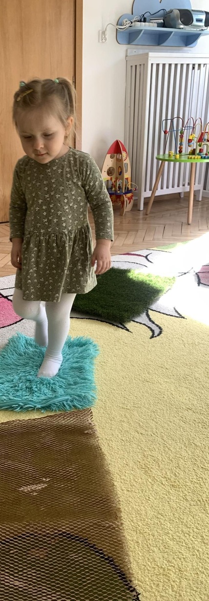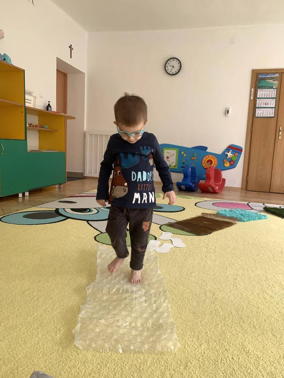 W grupie Misiów była świetna zabawa sensoryczna, która pozwala dzieciom na poznanie świata za pomocą zmysłów. Dzieci spacerując gołymi stopami miały okazję poznać podłoże, składające się z różnych faktur.