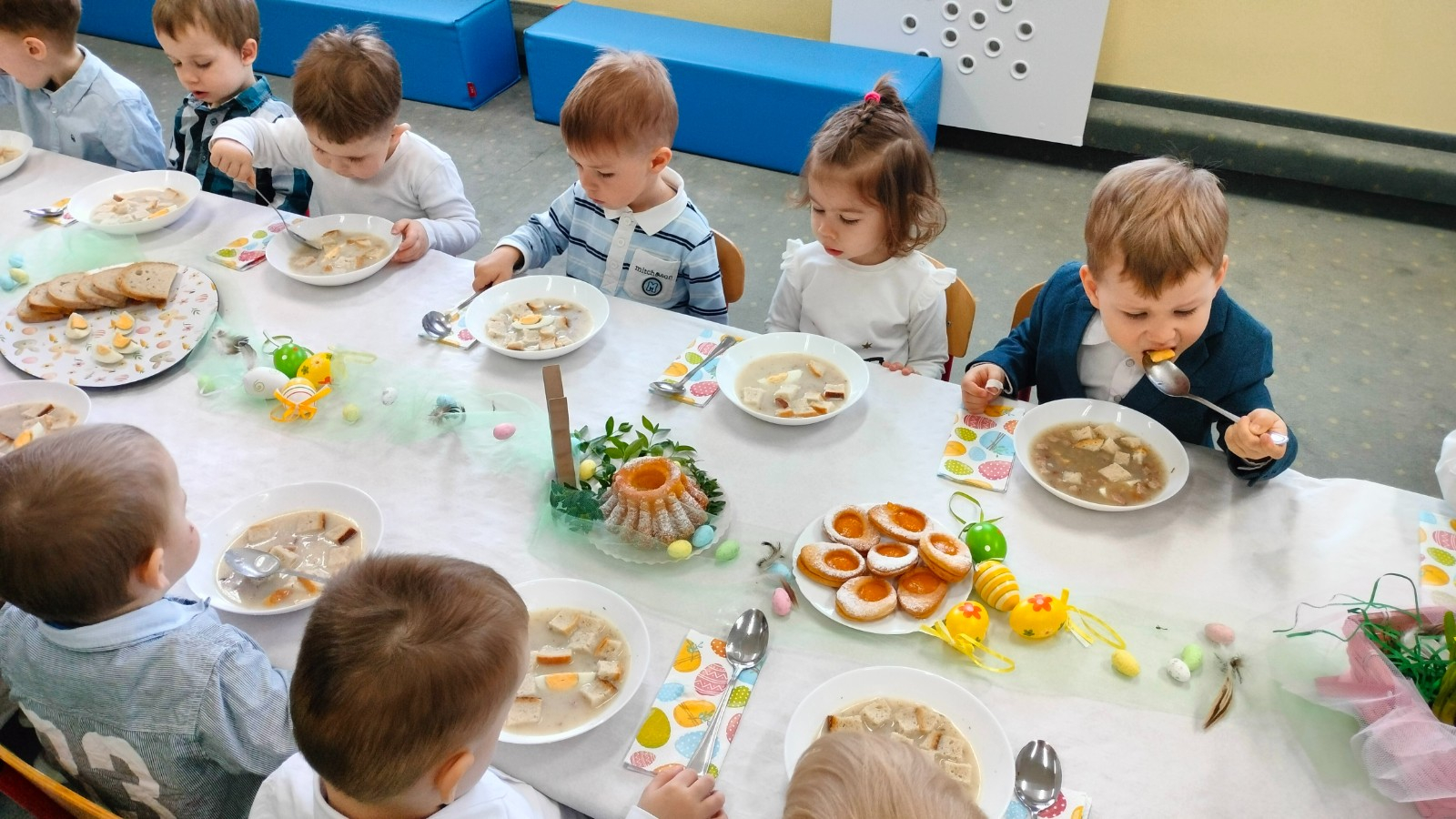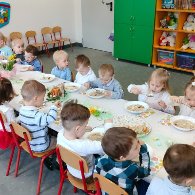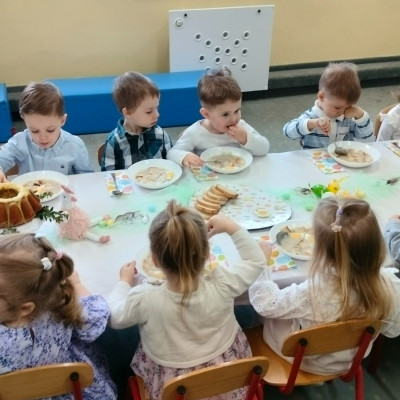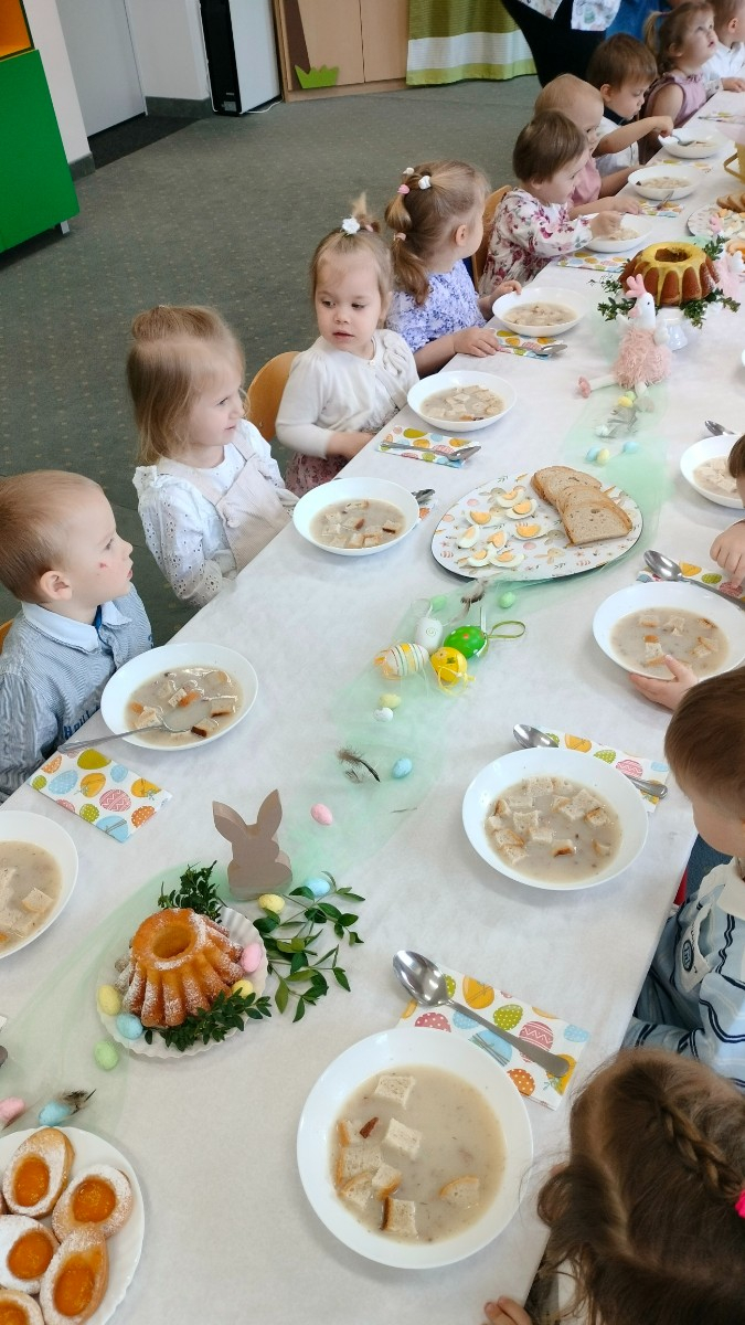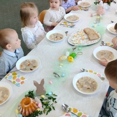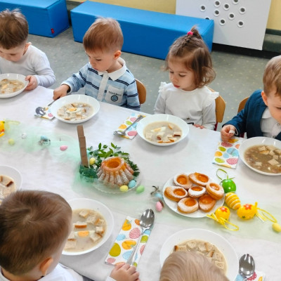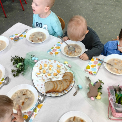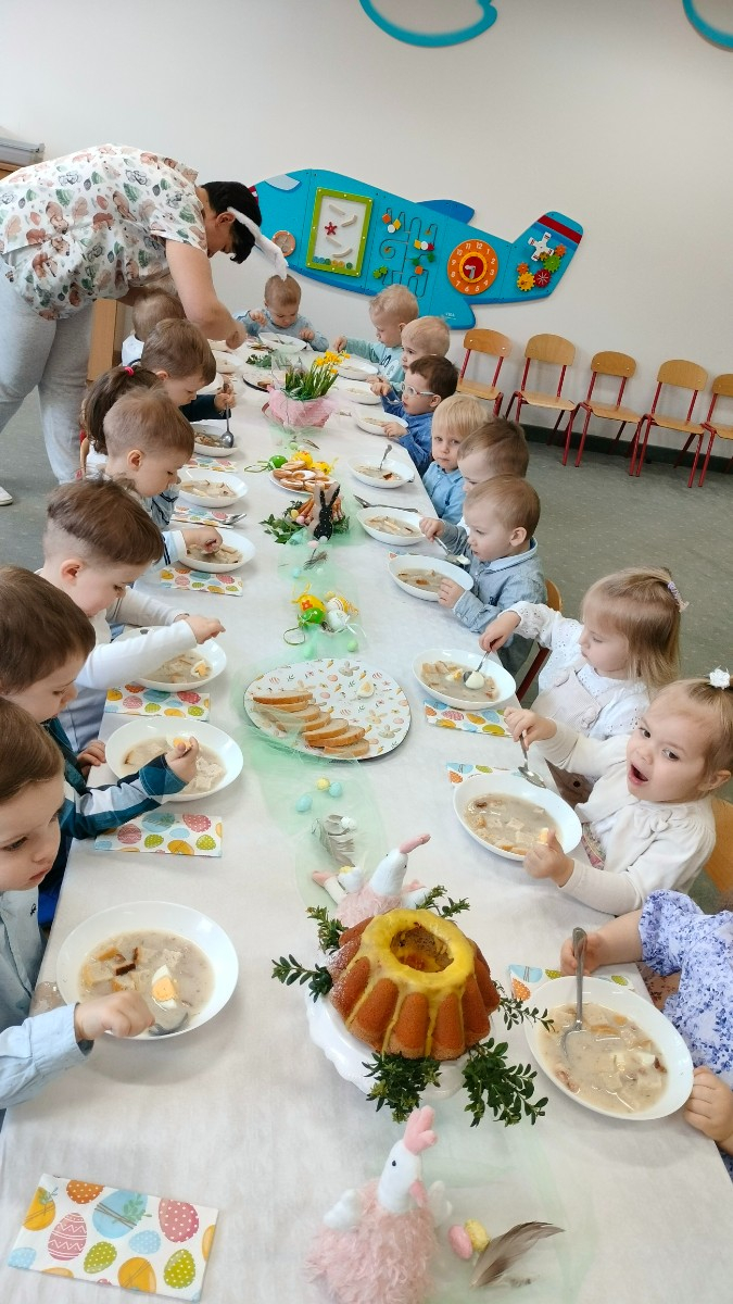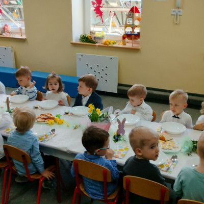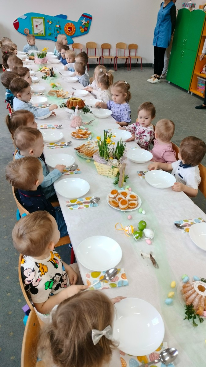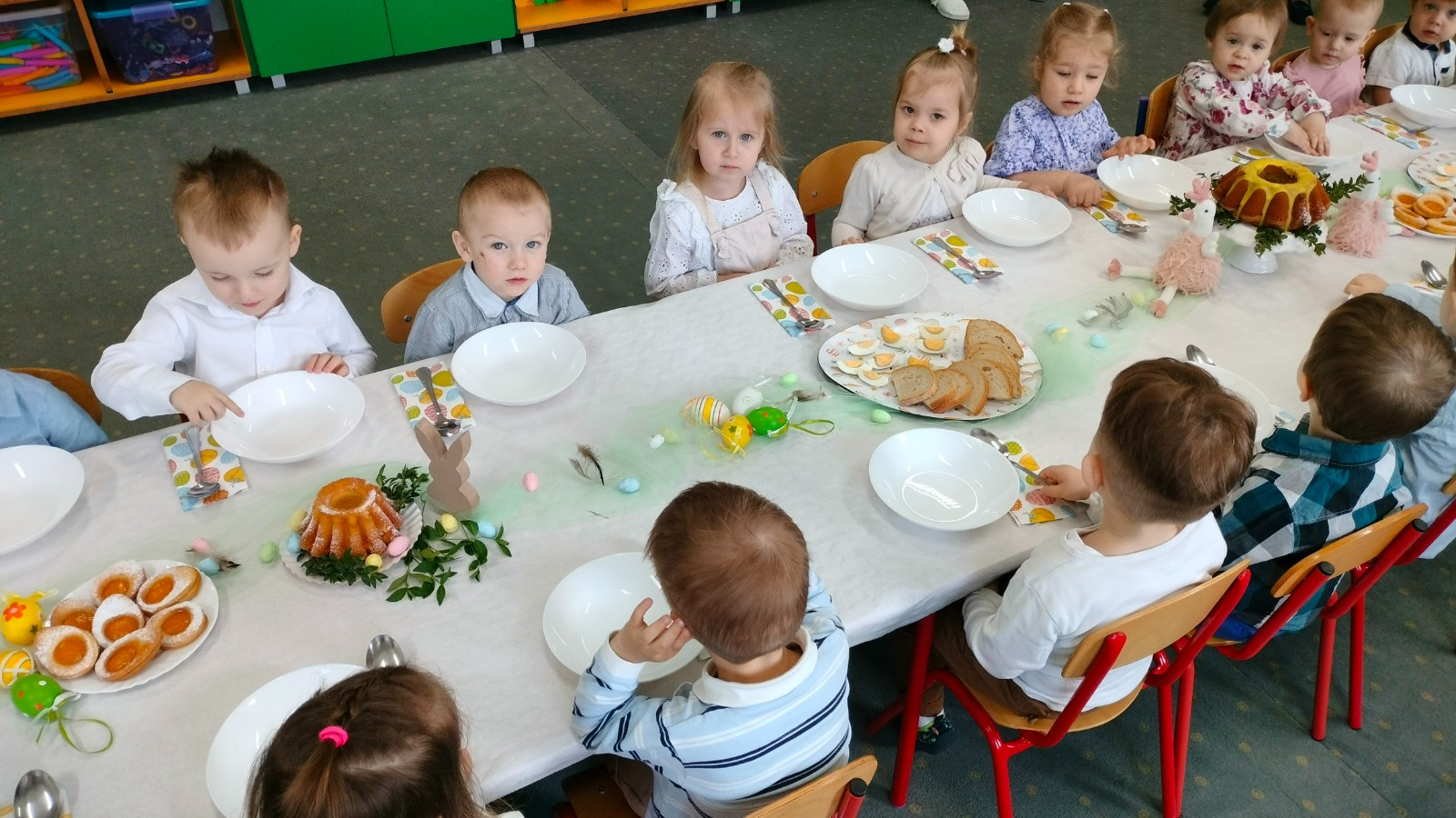 Wielkanoc to najstarsze i najważniejsze święto chrześcijaństwa mające bogatą tradycję i liczne religijne obrzędy. Jednym z nich jest uroczyste śniadanie. Również w naszym żłobku 16 kwietnia dzieci w odświętnych strojach zasiadły do śniadania wielkanocnego. Na stole pojawiły się tradycyjne wielkanocne przysmaki – jajka, kiełbaska, barszcz biały, babki. Nie zabrakło także pięknych wiosennych dekoracji oznaczających budzącą się do życia przyrodę. Spotkanie przy wspólnym świątecznym stole sprawiło dzieciom wiele radości.