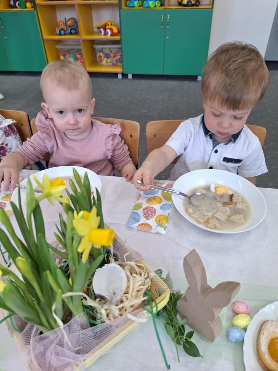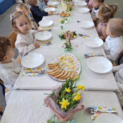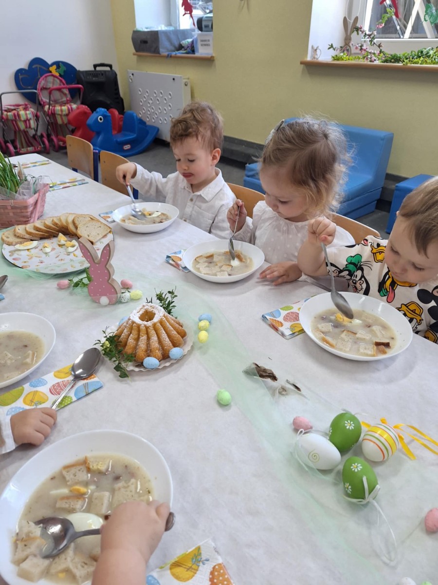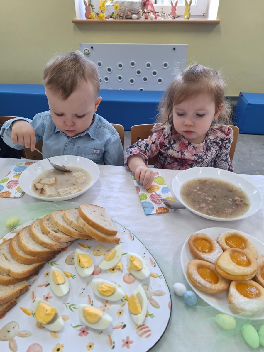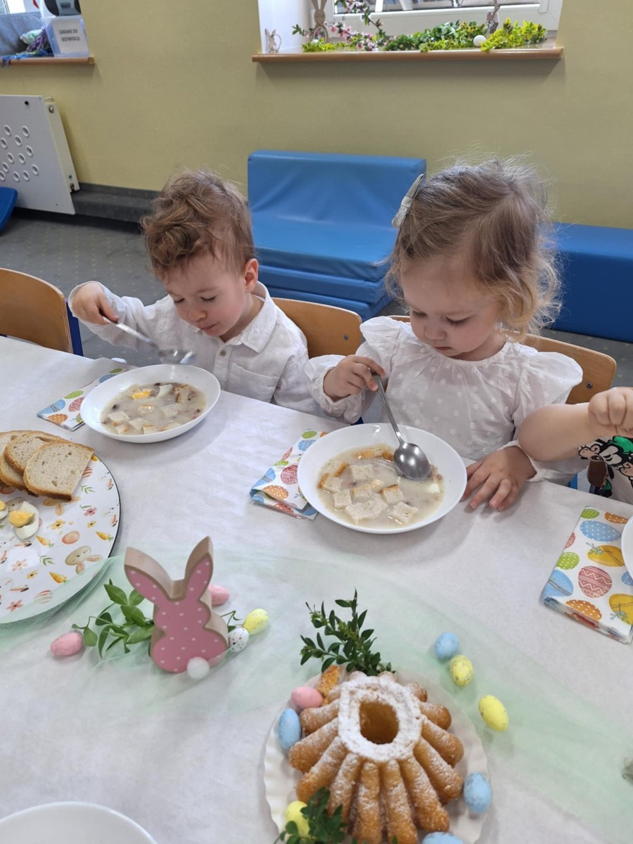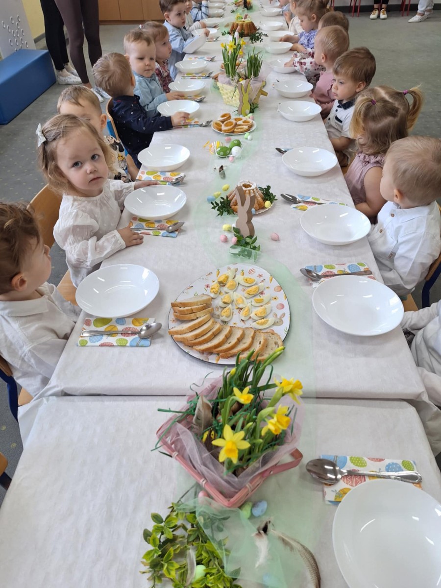 Zdjęcie przedstawia dzieci podczas śniadania wielkanocnego