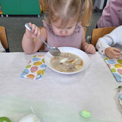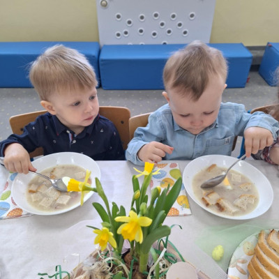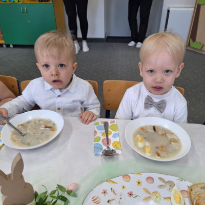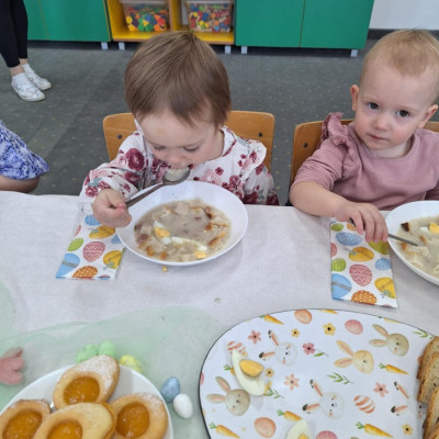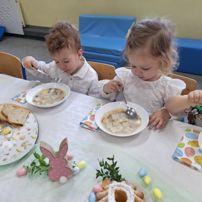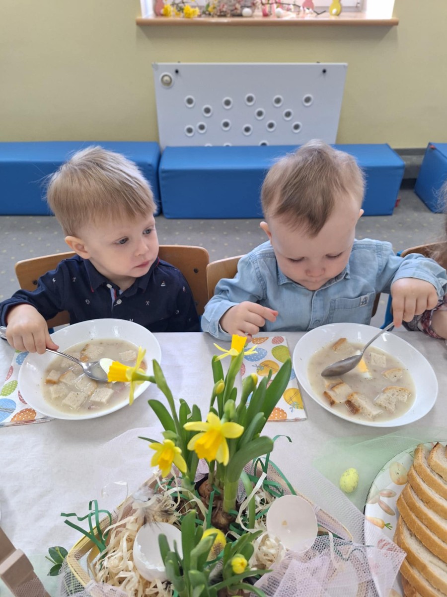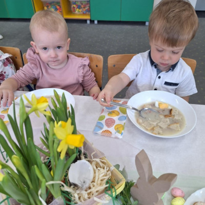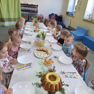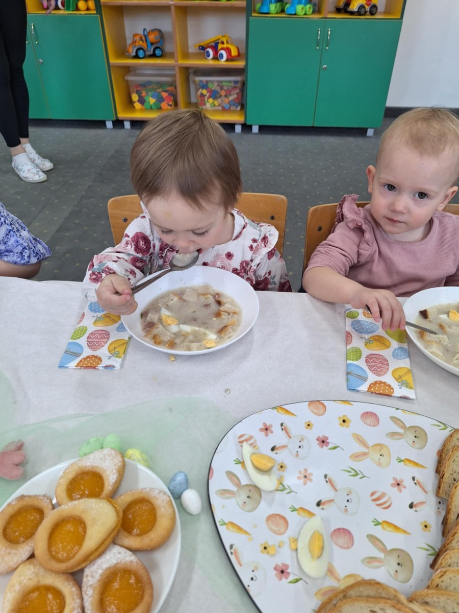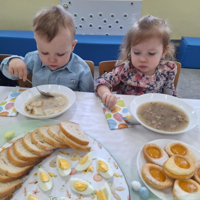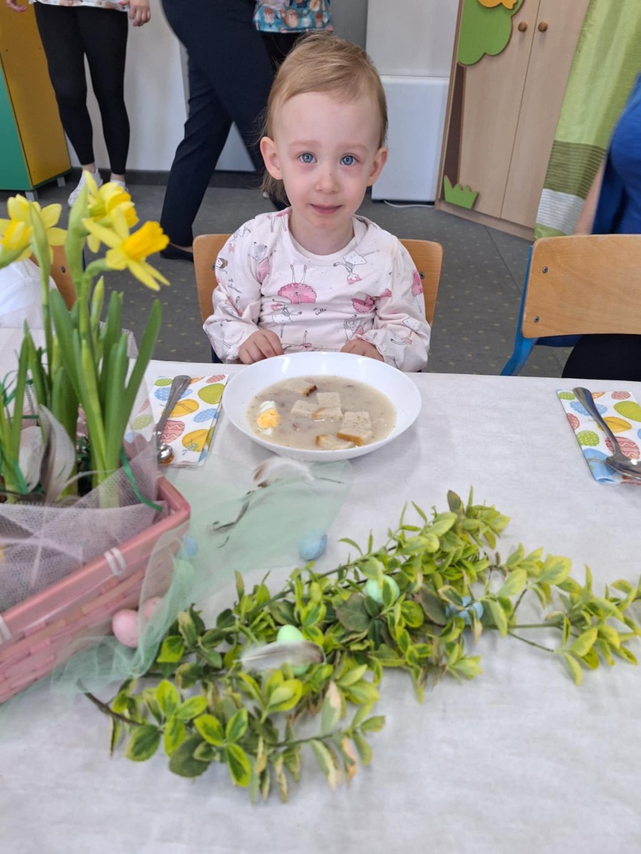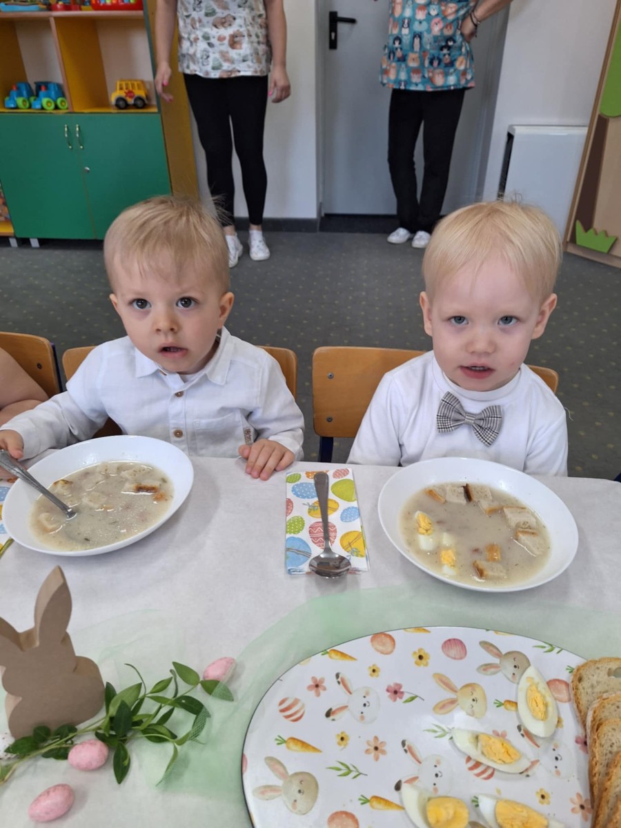Zdjęcie przedstawia dzieci podczas śniadania wielkanocnego