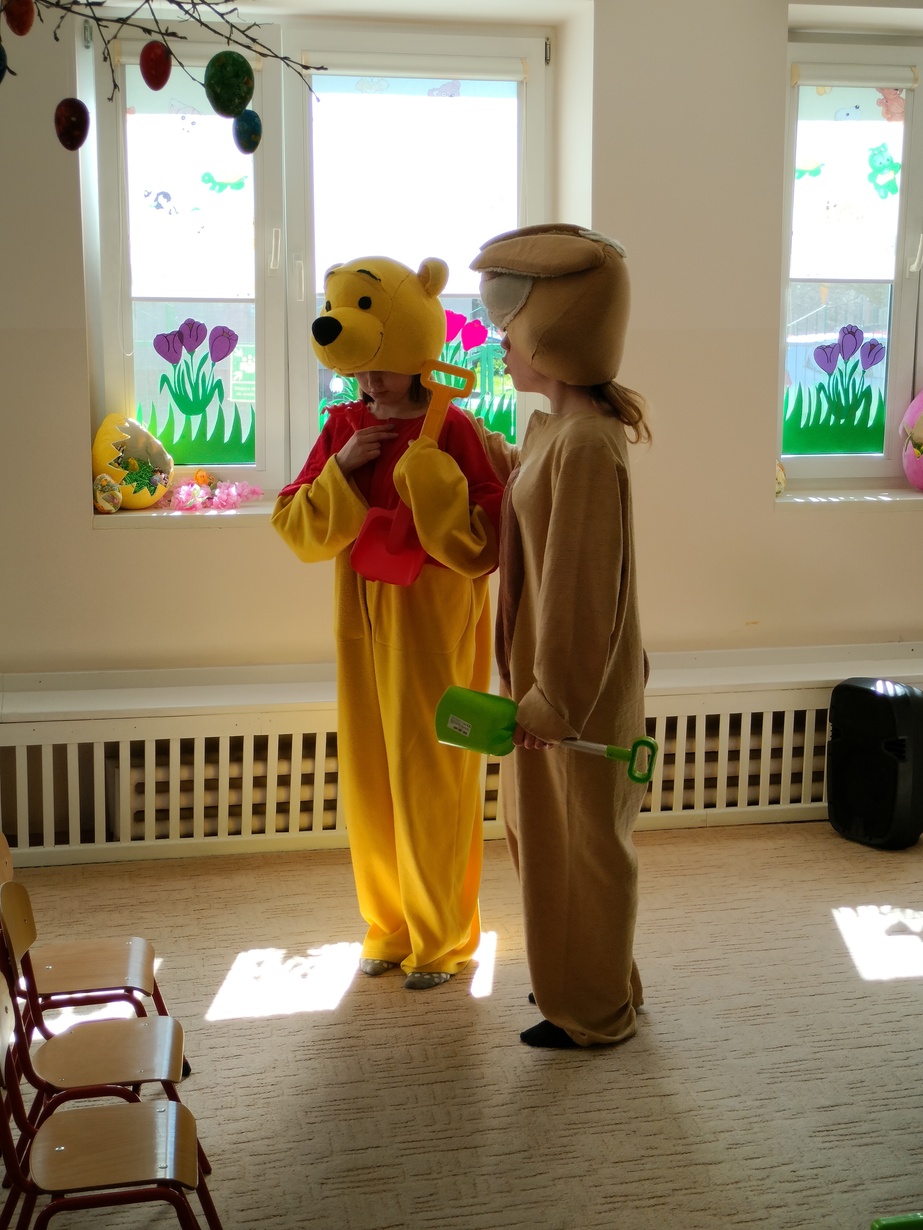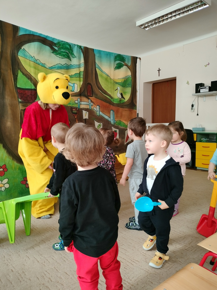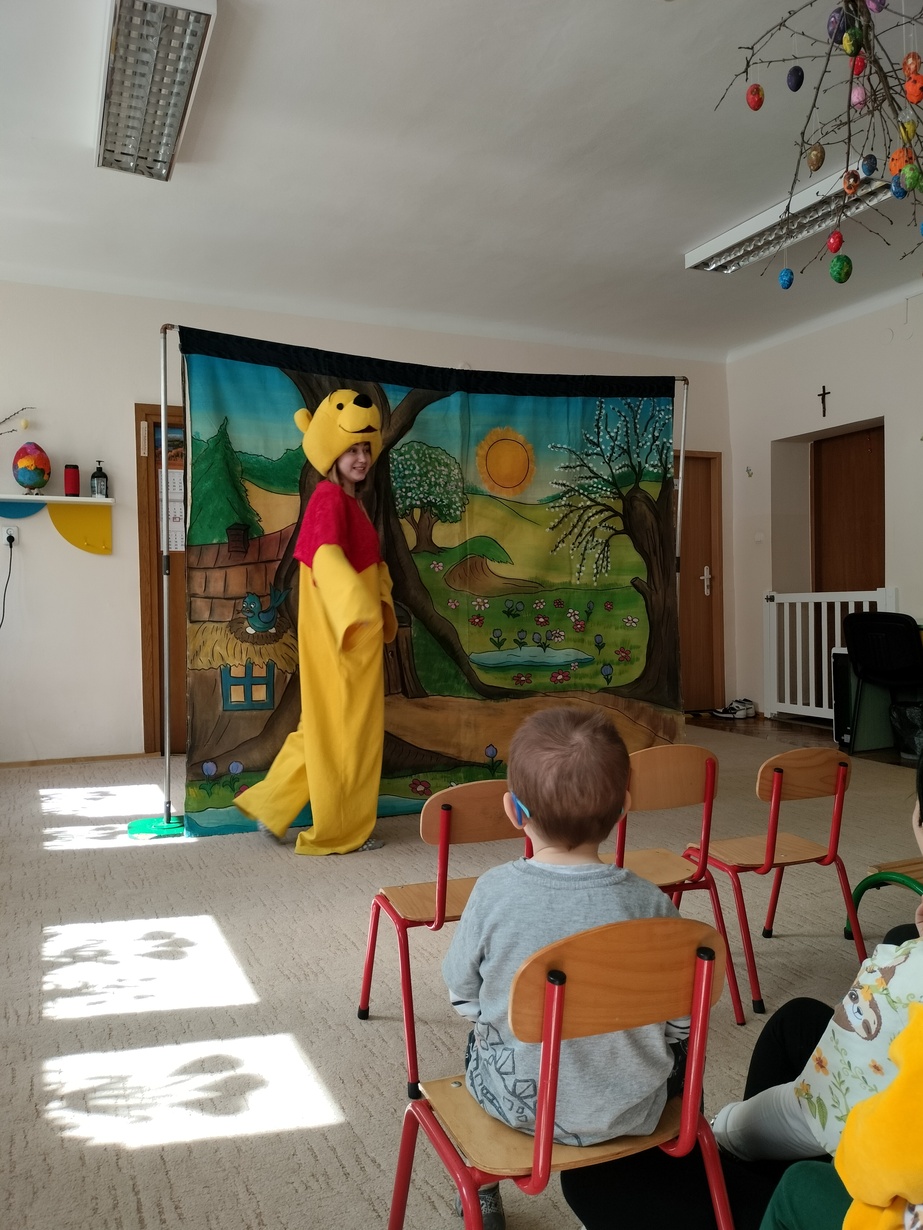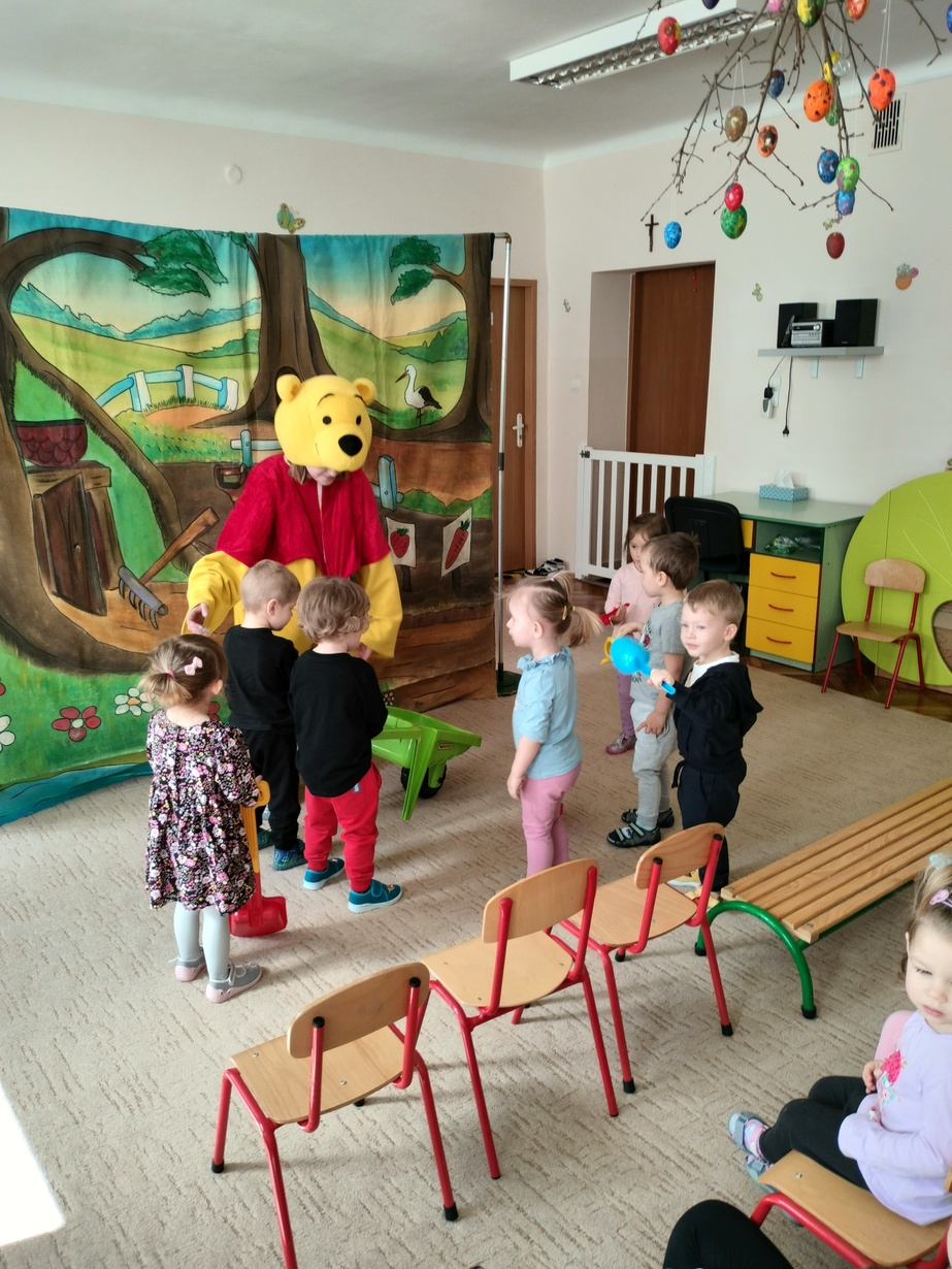 We wtorek 26 marca dzieci z grupy III i IV brały udział w spektaklu teatralnym pt. "Wiosna u Kubusia Puchatka" zaprezentowanym przez aktorów z grupy teatralnej "Krak -Art" z Krakowa. Głównym bohaterem przedstawienia był oczywiście Kubuś Puchatek, który budzi się pewnego ranka i wyczuwa zmiany jakie zaszły w przyrodzie??. W związku z tym wyrusza na poszukiwanie prawdziwej wiosny. Tymczasem, jego przyjaciele ze Stumilowego Lasu już rozpoczęli przygotowania do powitania Pani Wiosny. Dzieci czynnie brały udział w całym przedstawieniu tańczyły, pomagały Królikowi i Kłapouchemu i dobrze się przy tym bawiły?.