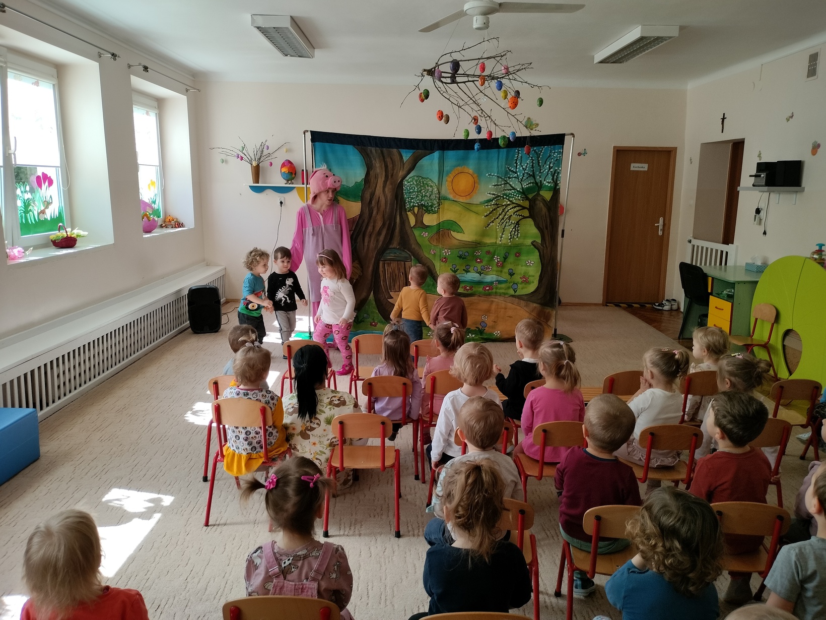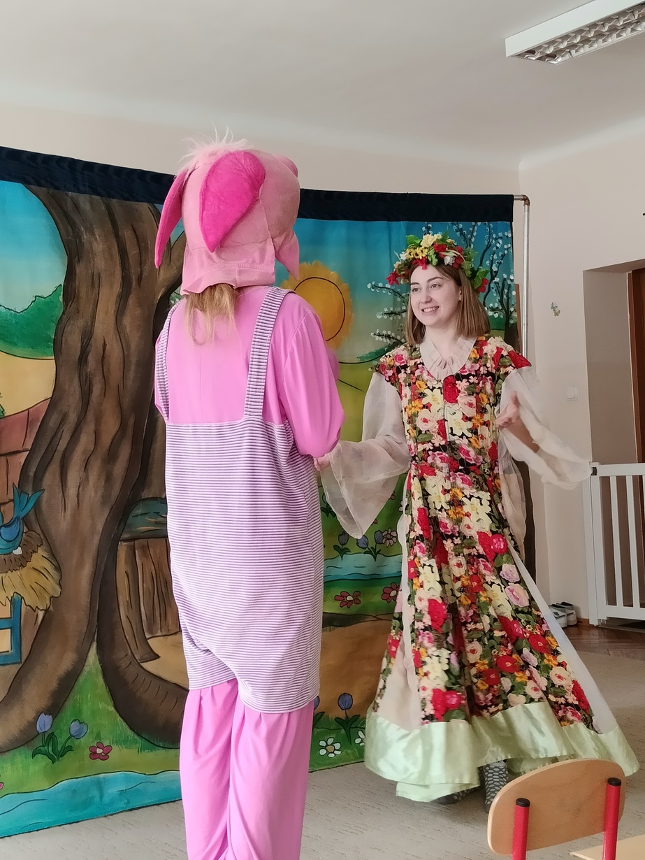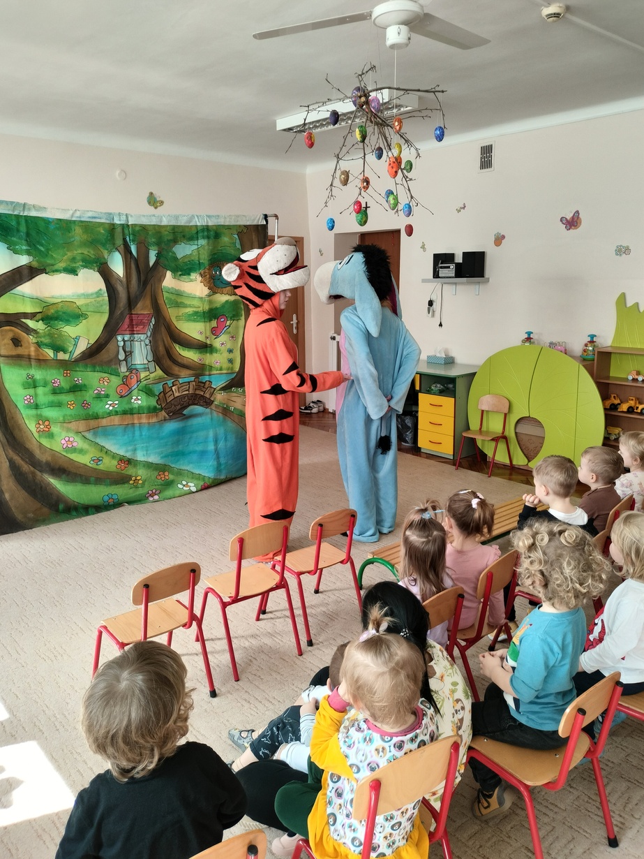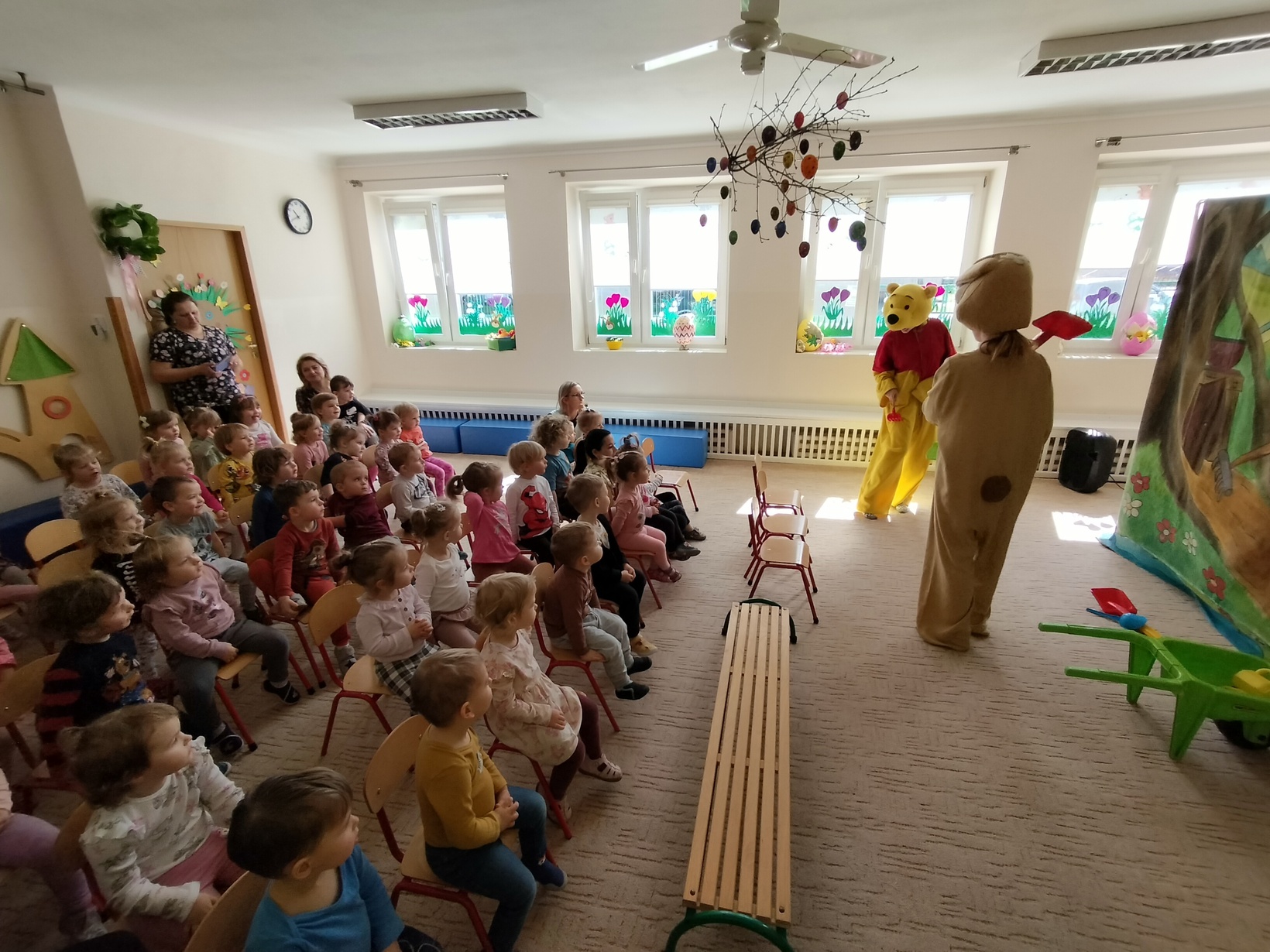 We wtorek 26 marca dzieci z grupy III i IV brały udział w spektaklu teatralnym pt. "Wiosna u Kubusia Puchatka" zaprezentowanym przez aktorów z grupy teatralnej "Krak -Art" z Krakowa. Głównym bohaterem przedstawienia był oczywiście Kubuś Puchatek, który budzi się pewnego ranka i wyczuwa zmiany jakie zaszły w przyrodzie??. W związku z tym wyrusza na poszukiwanie prawdziwej wiosny. Tymczasem, jego przyjaciele ze Stumilowego Lasu już rozpoczęli przygotowania do powitania Pani Wiosny. Dzieci czynnie brały udział w całym przedstawieniu tańczyły, pomagały Królikowi i Kłapouchemu i dobrze się przy tym bawiły?.