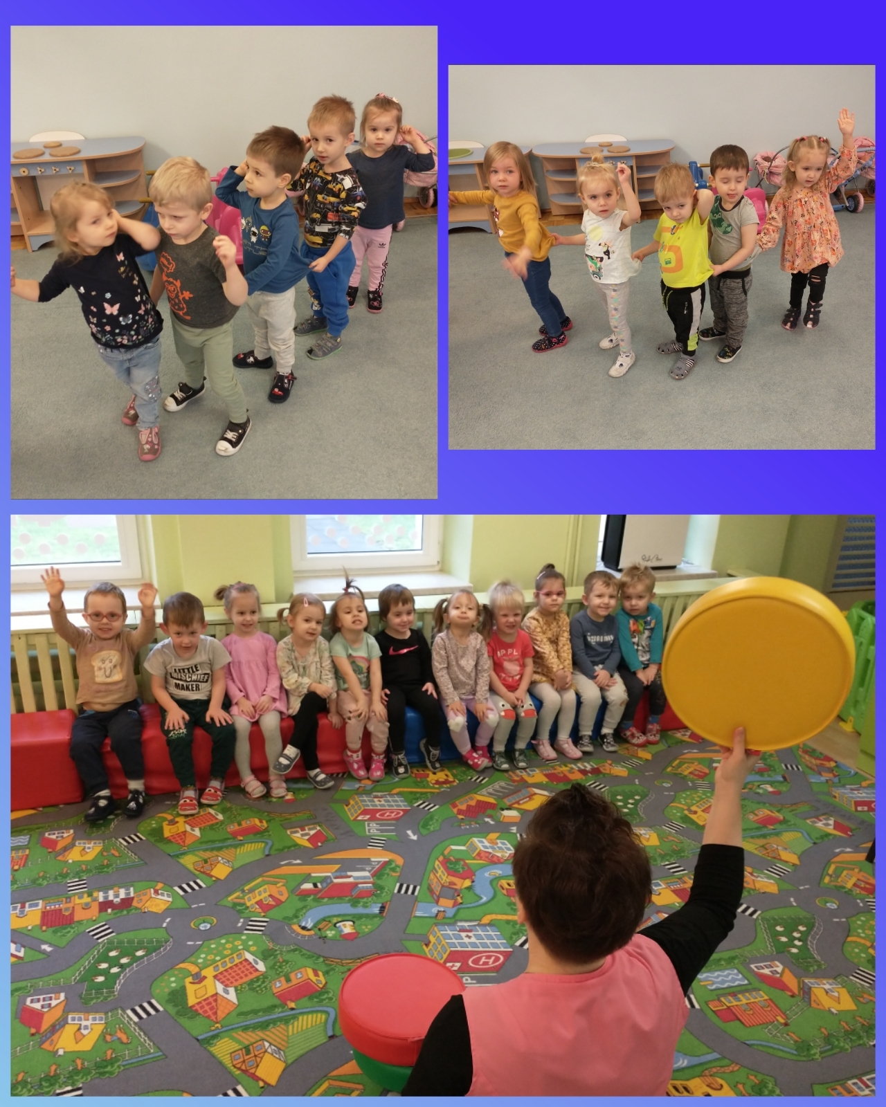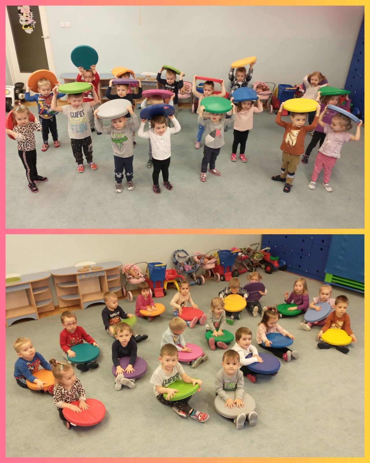 Żabki uruchamiały swoją pomysłowość i przez zabawę z kółeczkami gimnastycznymi oraz chustą animacyjną ćwiczyły swoją sprawność motoryczną.