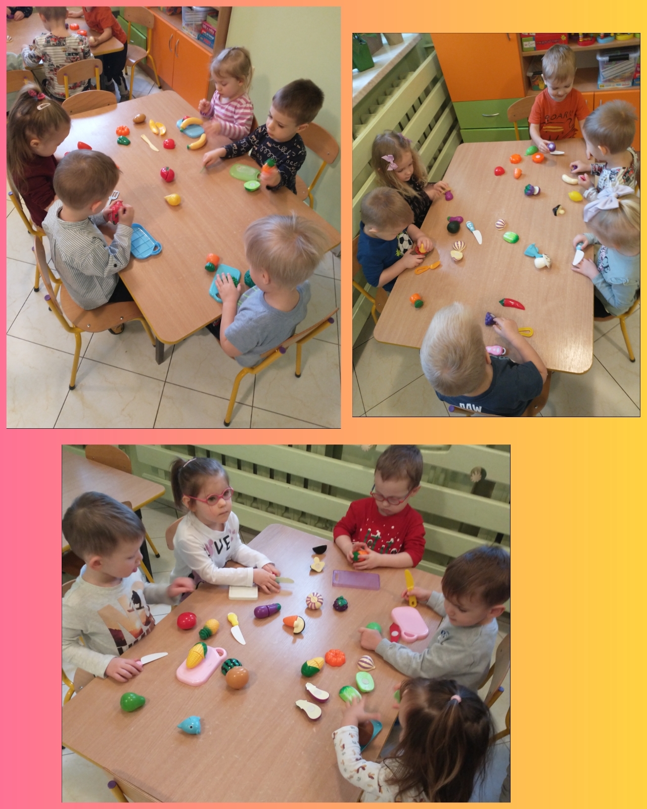 Doskonaliliśmy jazdę w pociągu oraz poznawaliśmy różne rodzaje wyposażenia kuchennego oraz właściwego trzymania nożyka (plastikowego) i krojenia owoców i warzyw (wykonanych z tworzywa).