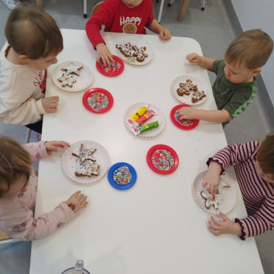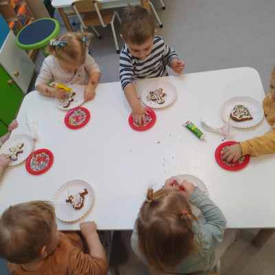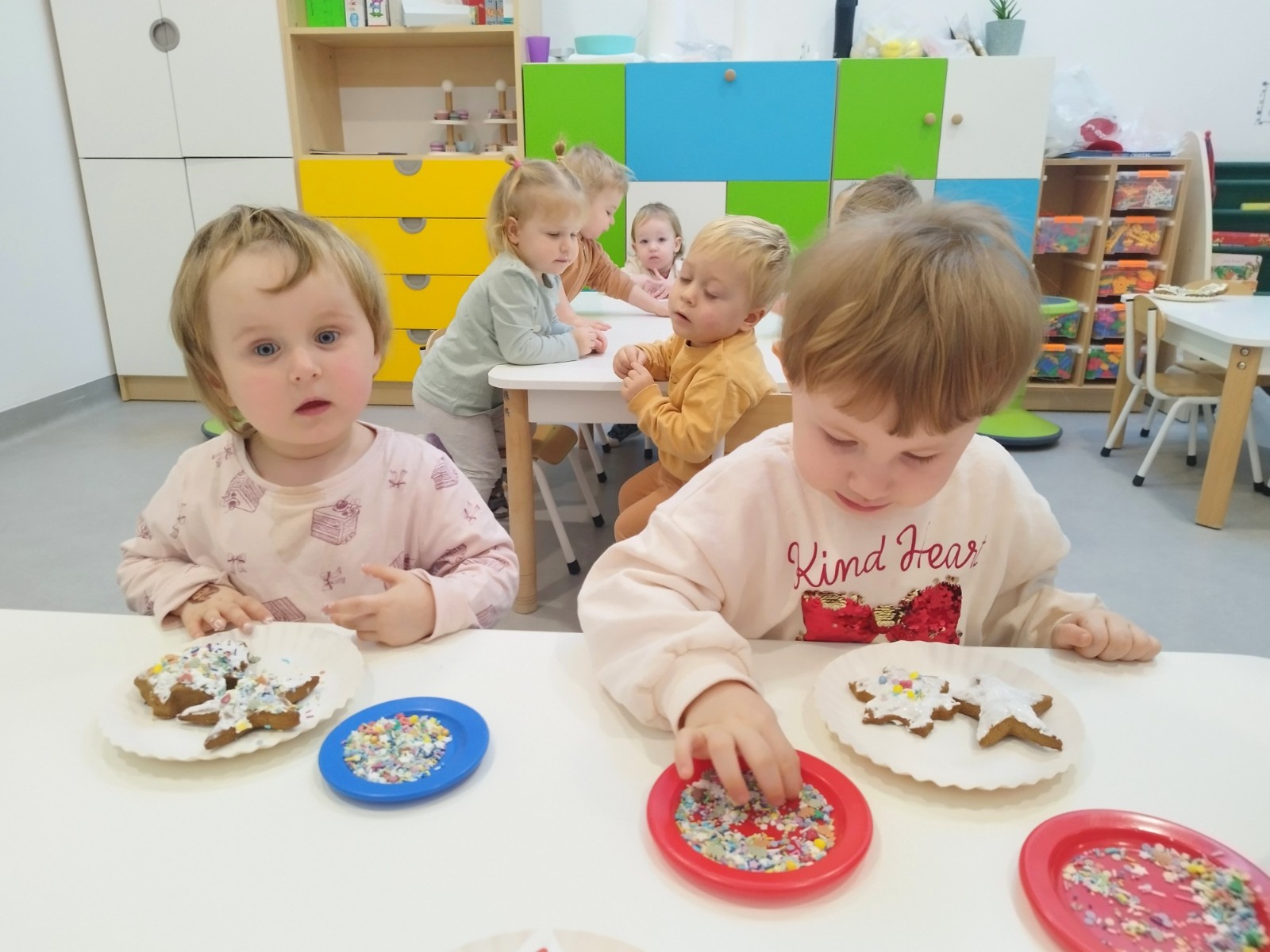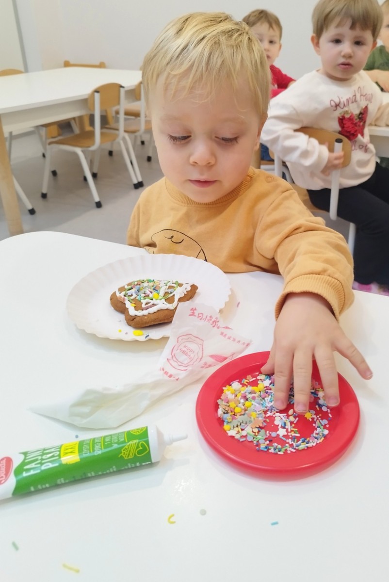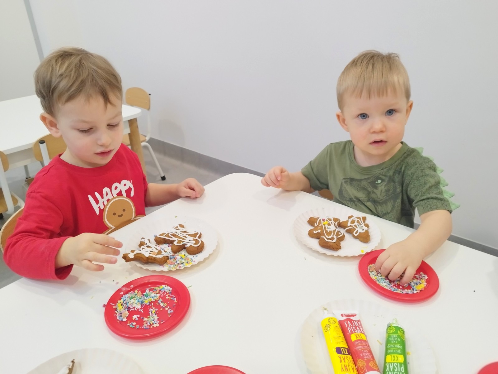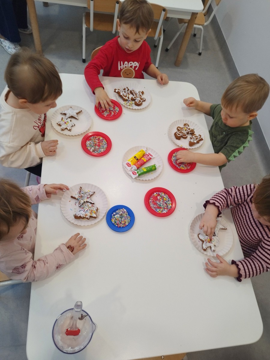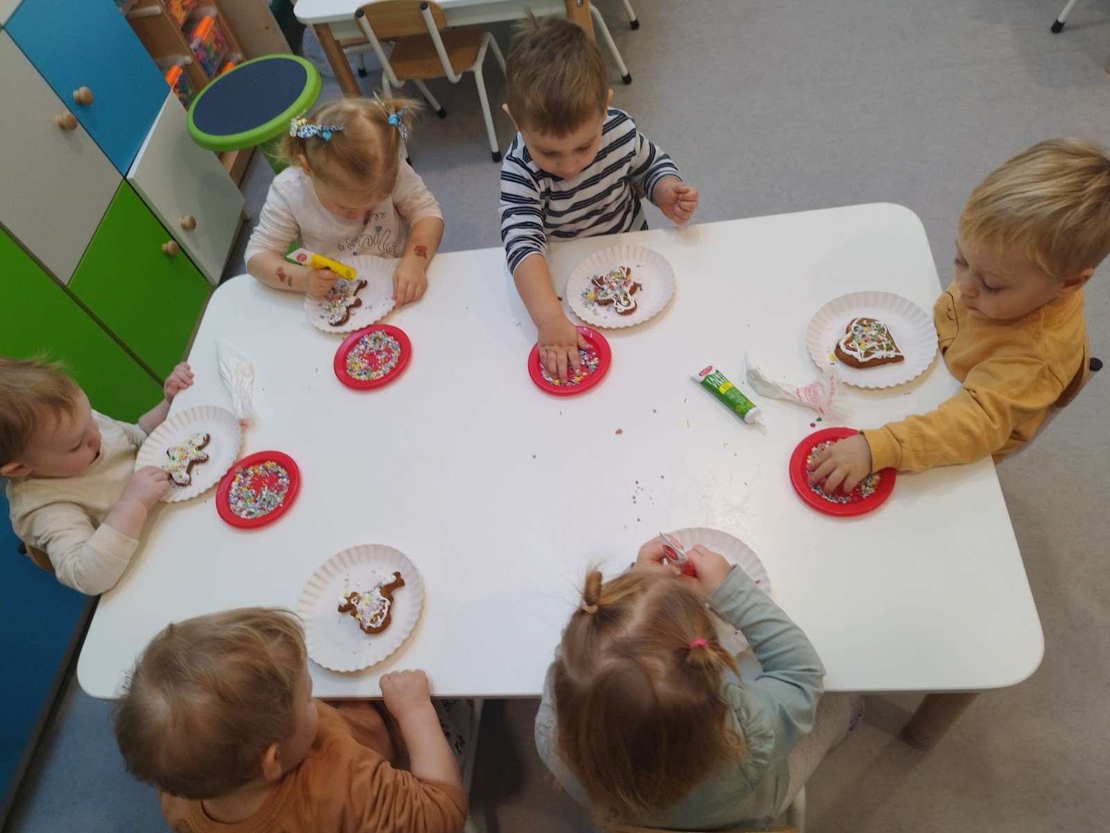 Zdjęcie przedstawia dzieci podczas przygotowywania świątecznych pierniczków
