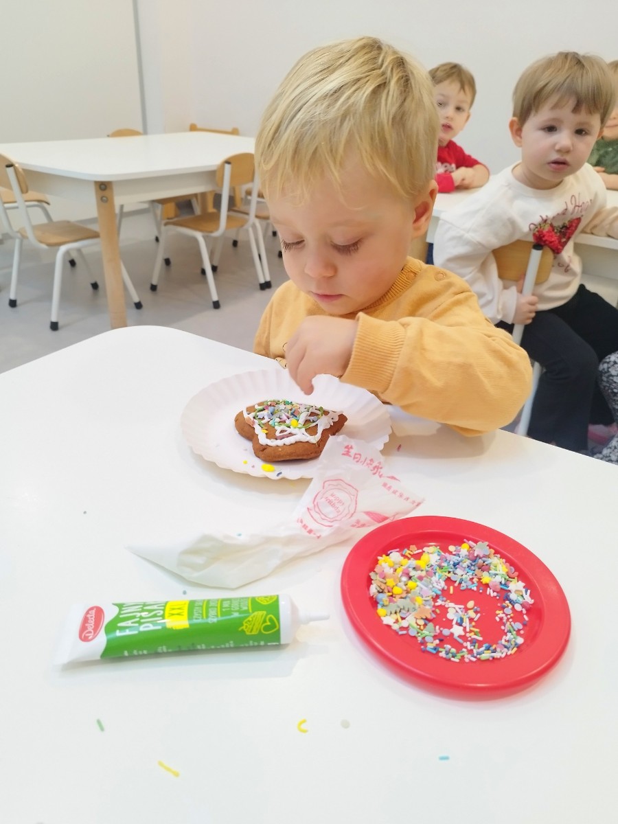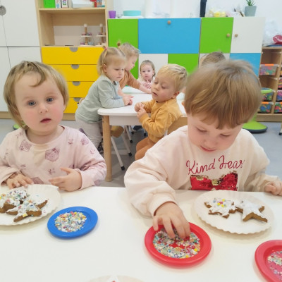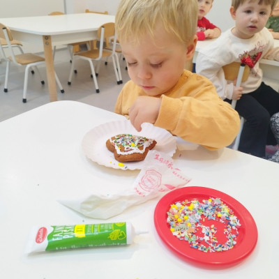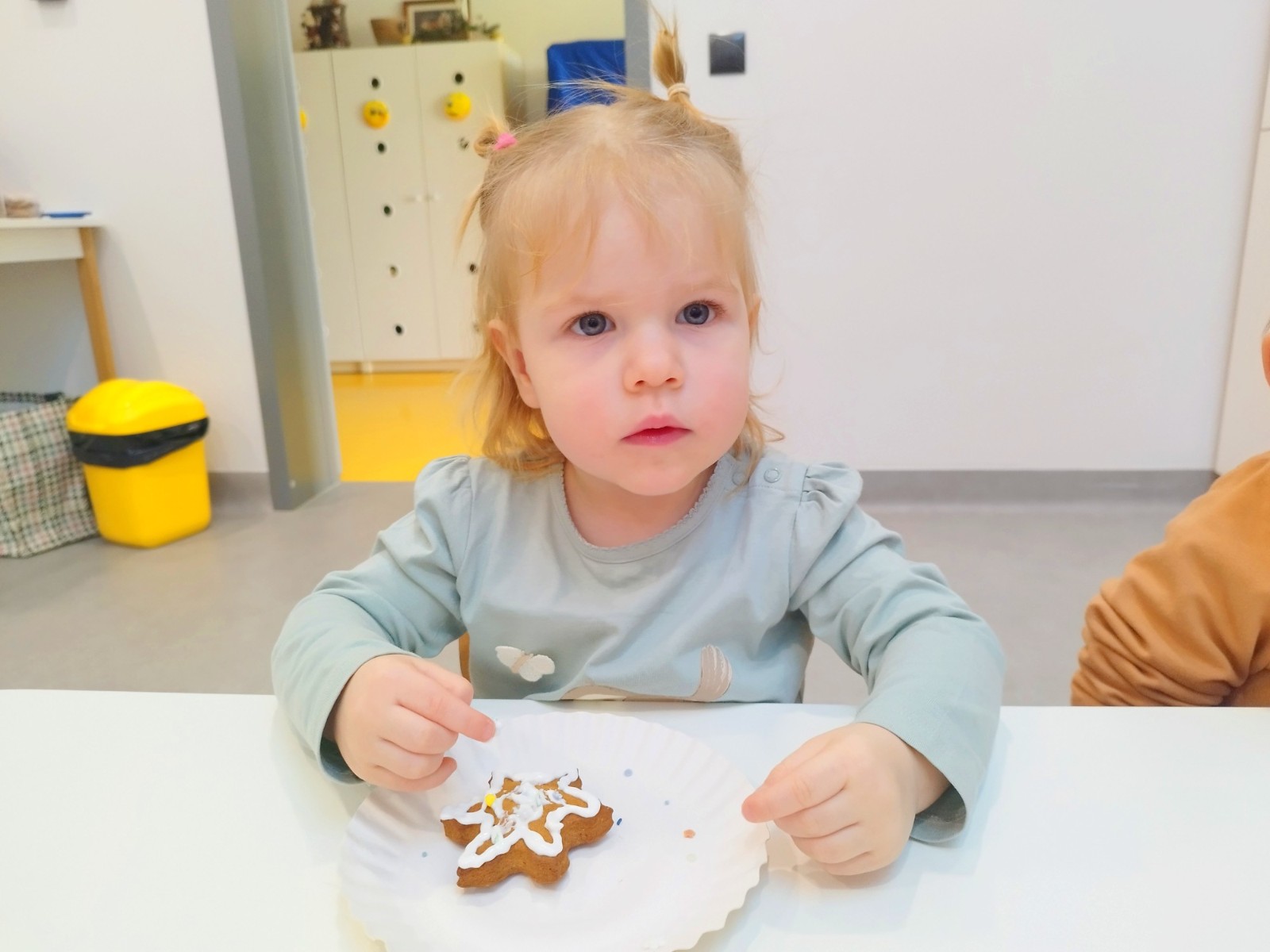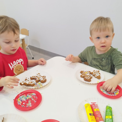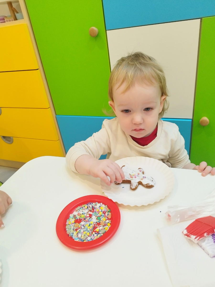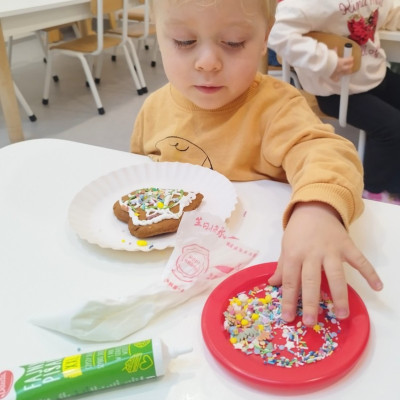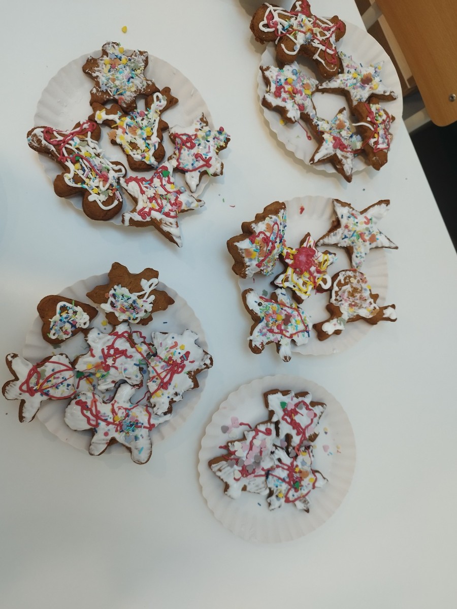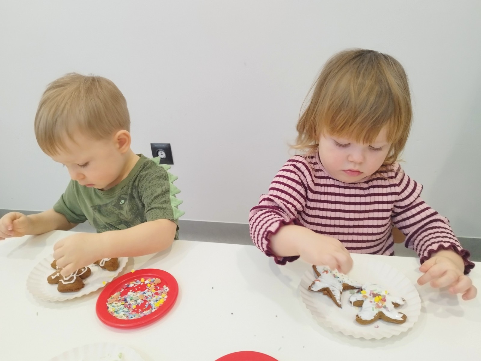 Zdjęcie przedstawia dzieci podczas przygotowywania świątecznych pierniczków