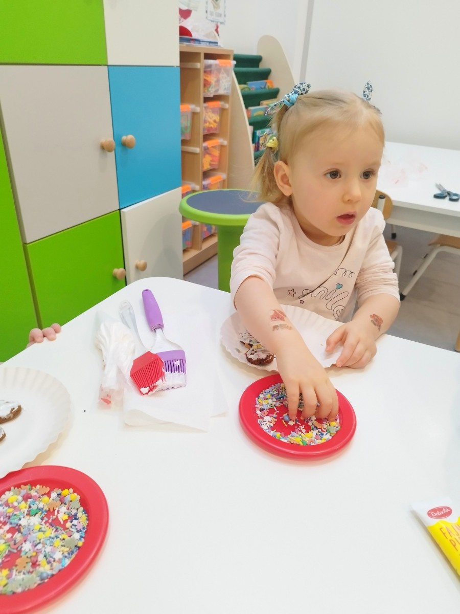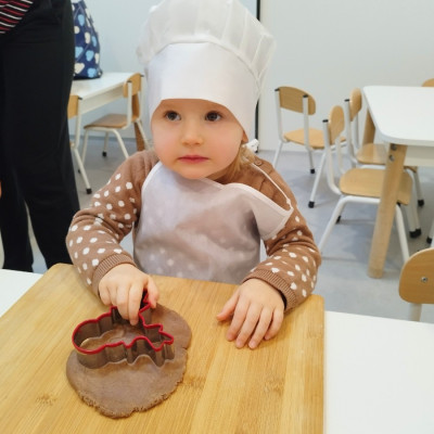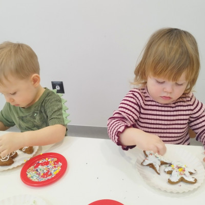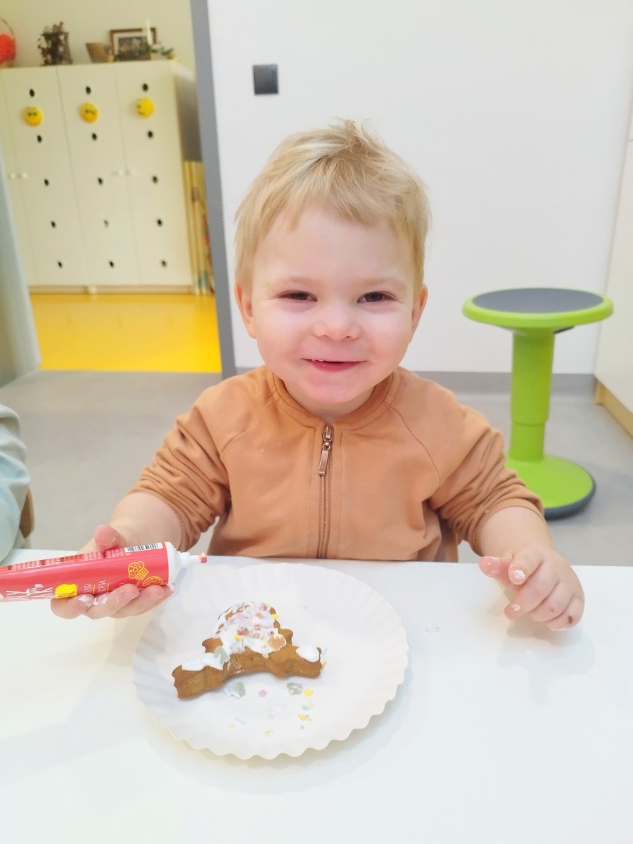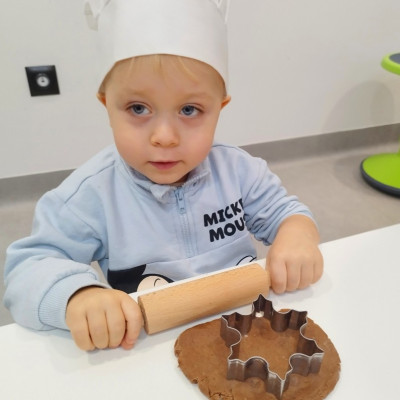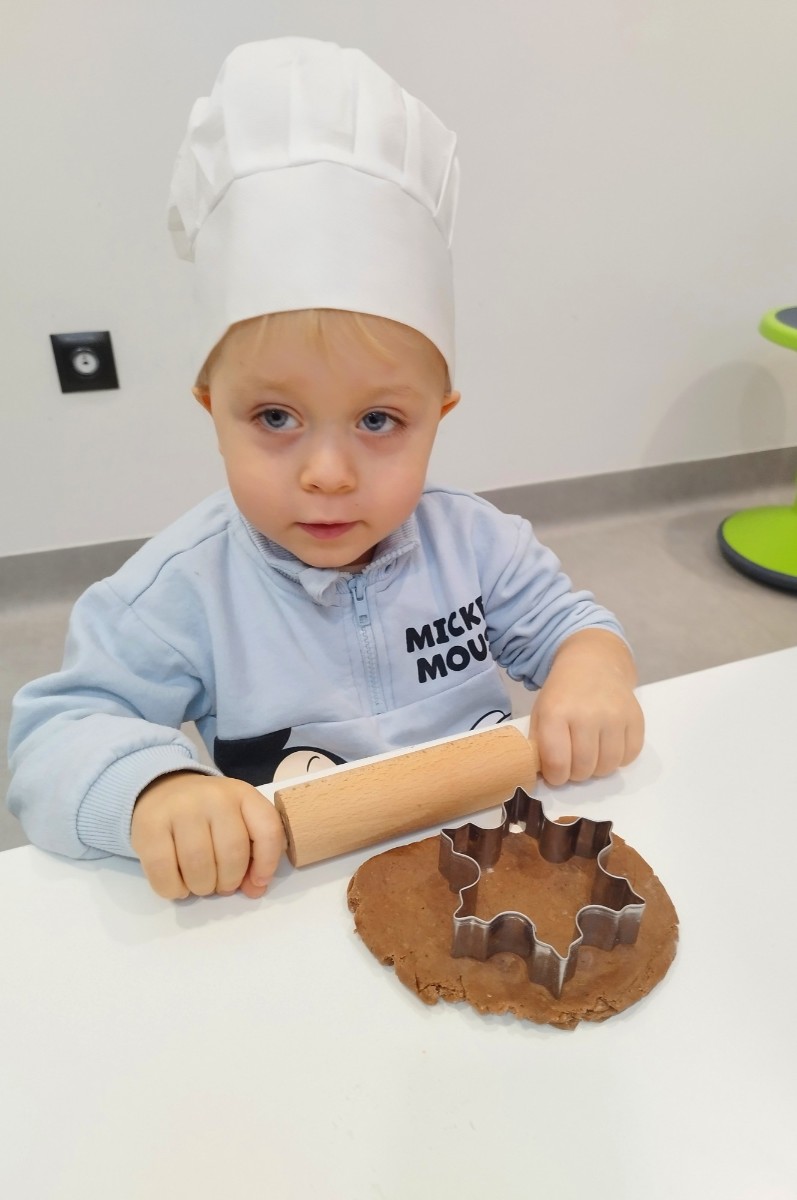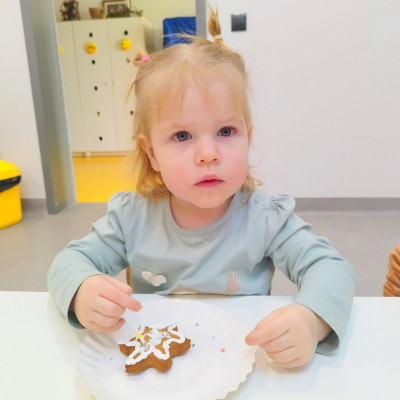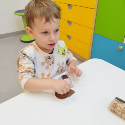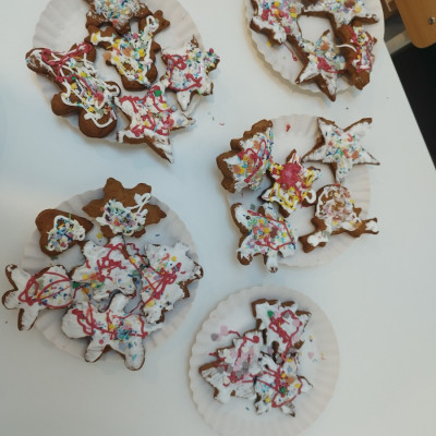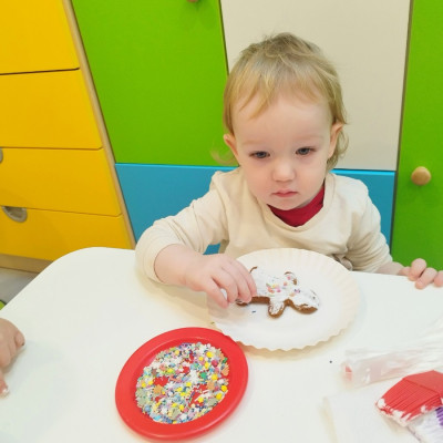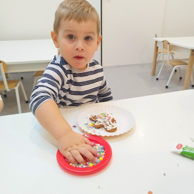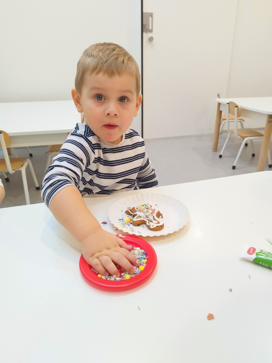 Zdjęcie przedstawia dzieci podczas przygotowywania świątecznych pierniczków