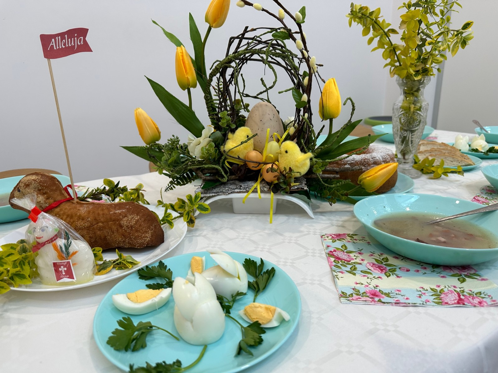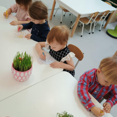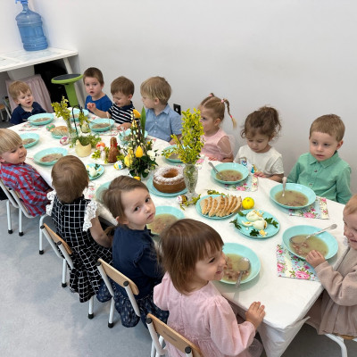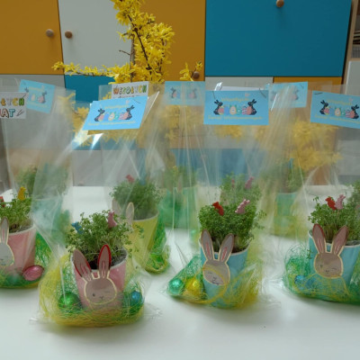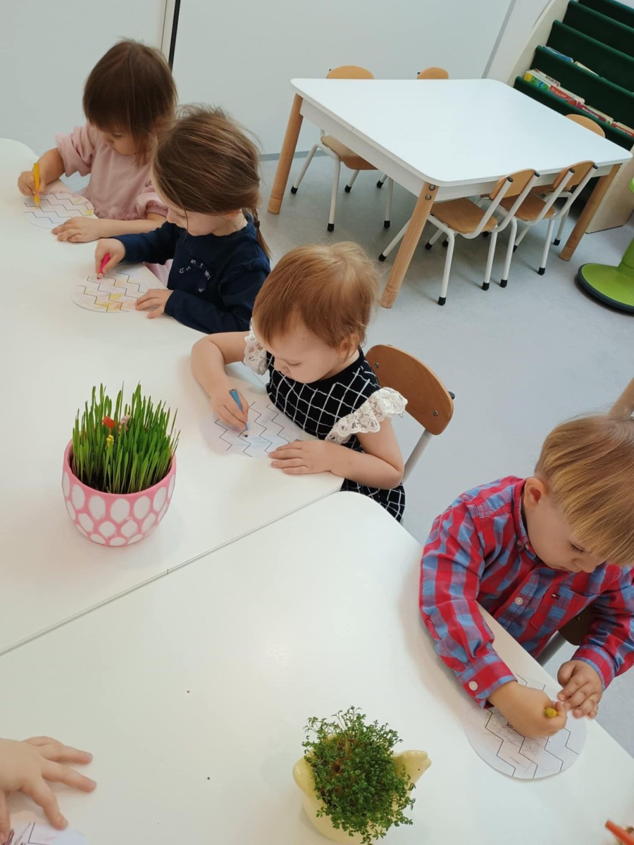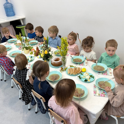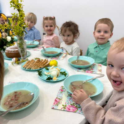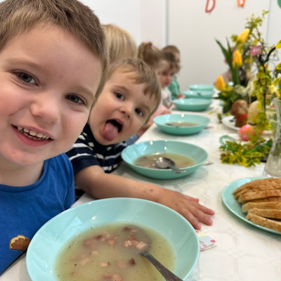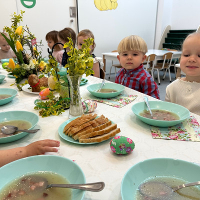 W naszym żłobku kultywujemy świąteczne tradycje. W dniu dzisiejszym nasze Rybki miały okazję zasiąść do wielkanocnego stołu razem ze swoimi równieśnikami. Podczas tegorocznego śniadania na stołach królowały tradycyjne potrawy wielkanocne w uproszczonej wersji dla najmłodszych – jajka, pieczywo, barszczyk, piaskowe babki . Wspólny posiłek to nie tylko moment na delektowanie się smakołykami, ale też okazja do nauki – dzieci uczą się, czym są tradycje wielkanocne, jak dzielić się jedzeniem i spędzać czas w gronie rówieśników. Naszą grupę odwiedziła również Pani Dyrektor składając świąteczne życzenia dla wszystkich. W podziękowaniu maluchy wreczyły Pani Dyrektor własnoręcznie zasianą rzeżuchę.