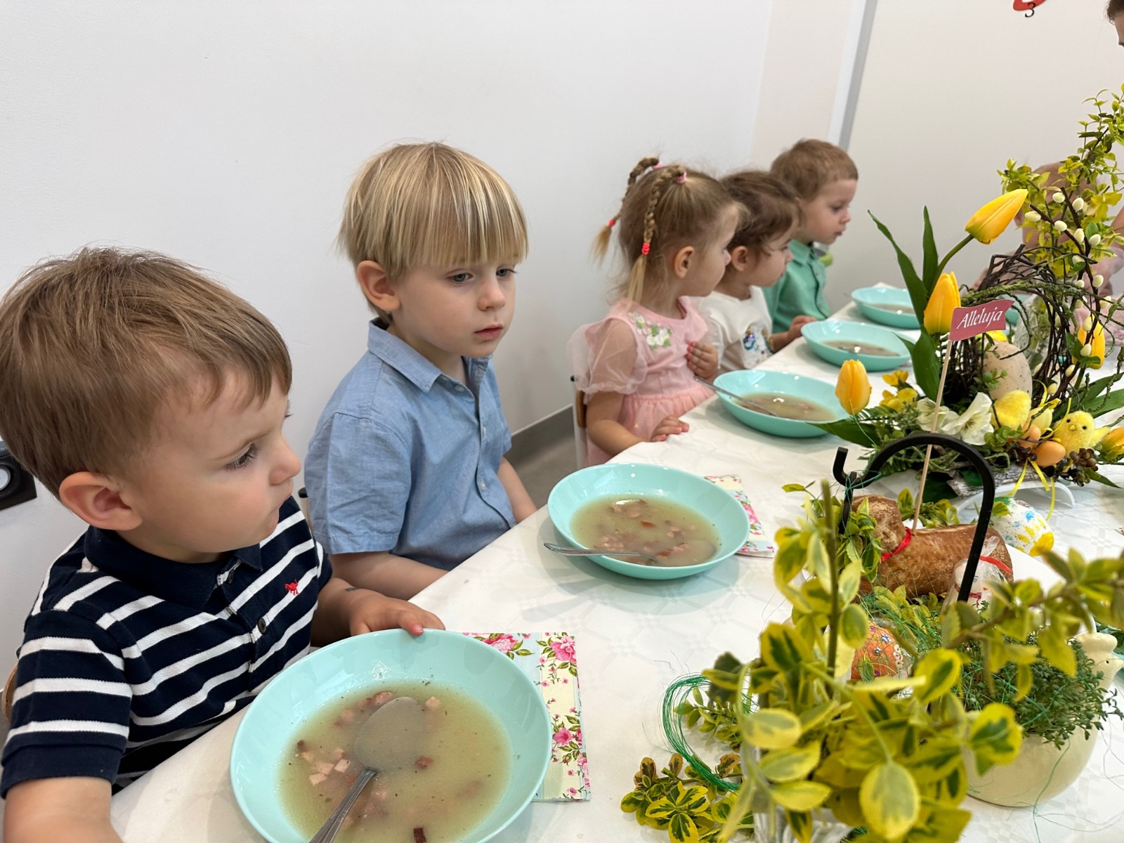 Zdjęcie przedstawia dzieci podczas śniadania wielkanocnego