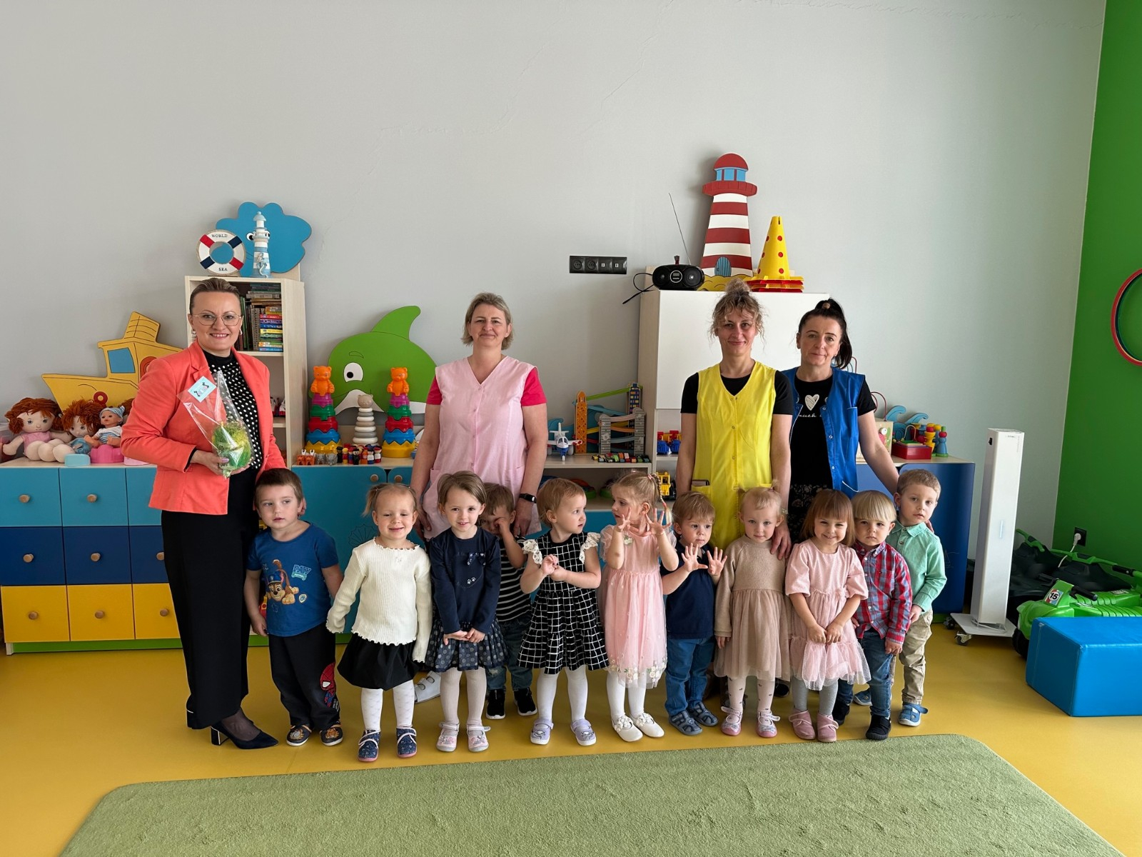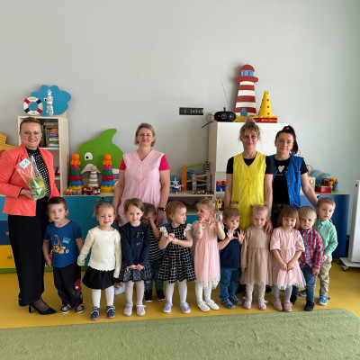 Zdjęcie przedstawia dzieci z Panią Dyrektor