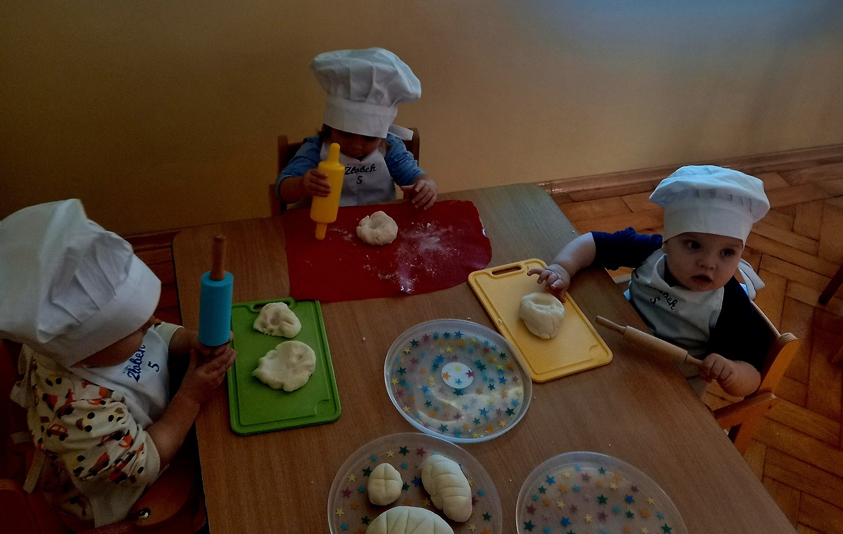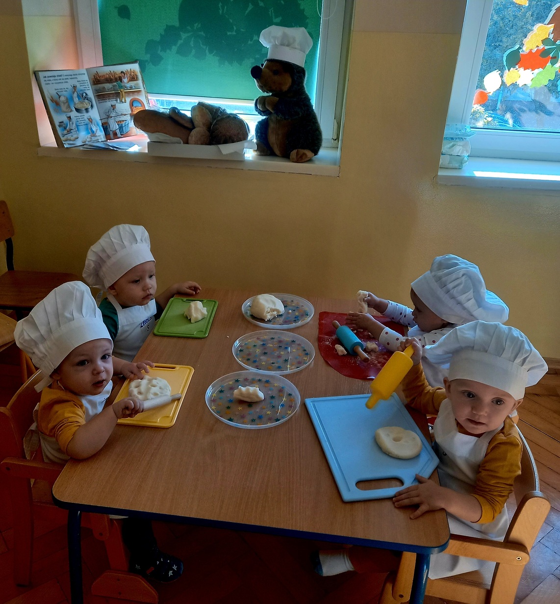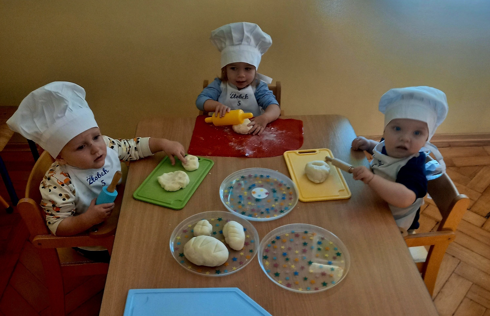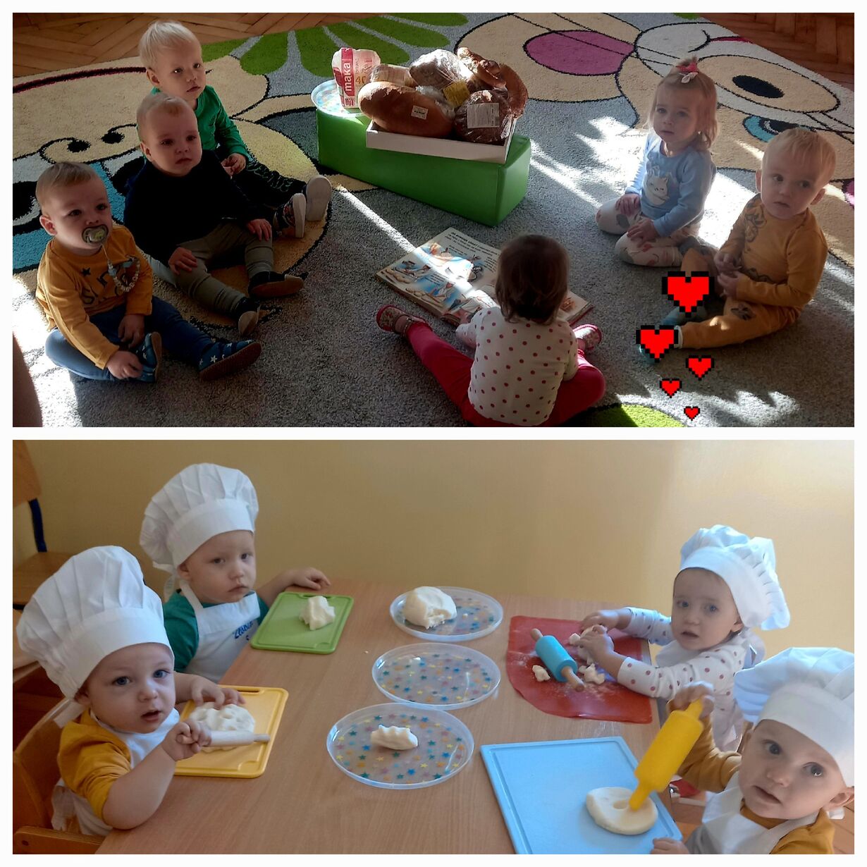 16 października dzieci z gr.1 obchodziły Dzień Chleba co wiązało się z zapoznaniem ich z czego i jak powstaje chleb; oglądały różne rodzaje pieczywa oraz same wykonały chlebki.Kontakt z ciastem i kuchennymi akcesoriami sprawił im wiele radości. ?