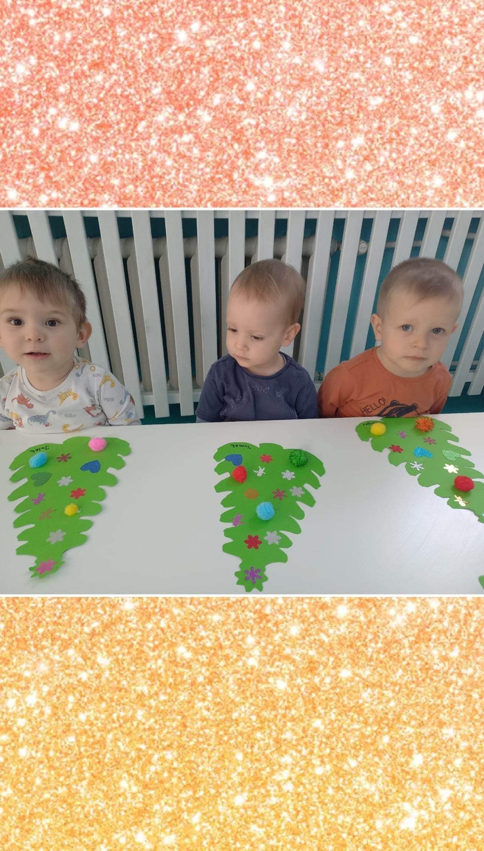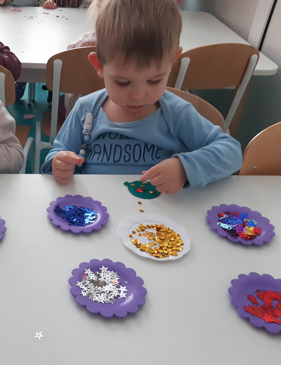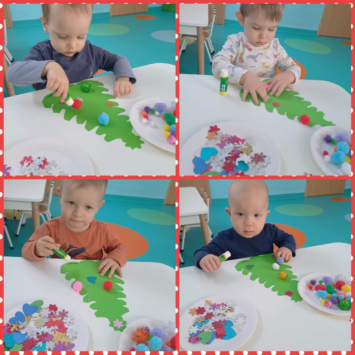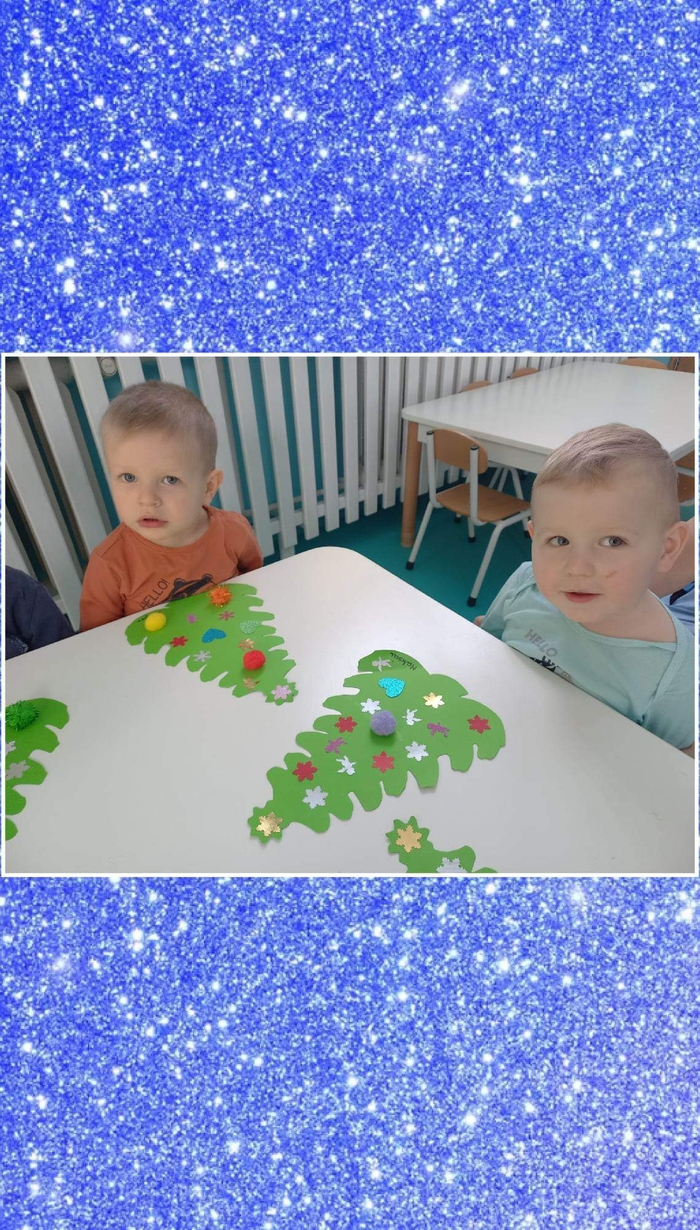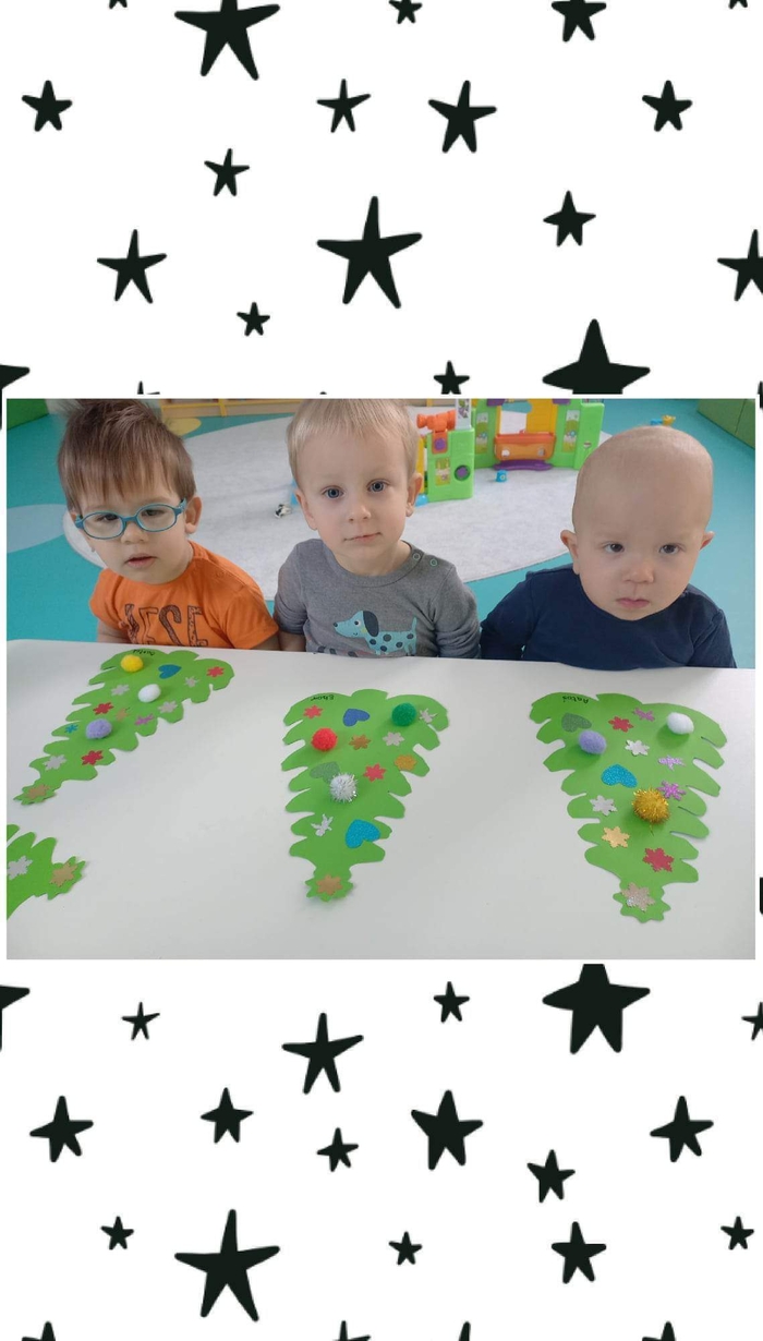 Także na grupie Żabki okres przedświąteczny okazał się czasem intensywnych przygotowań do świąt . W ramach zajęć panie opiekunki na tej grupie starały się zaznajomić dzieci z bożonarodzeniowymi tradycjami i obyczajami. Dzieci z tej grupy wykonały pracę plastyczną której tematem była świąteczna choinka oraz kolorową bombę, którą doklejały do przygotowanych kartek świątecznych. Do wykonania tych prac dzieci wykorzystały plastelinę, cekiny, brokat, kolorowe kuleczki .