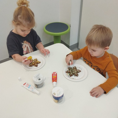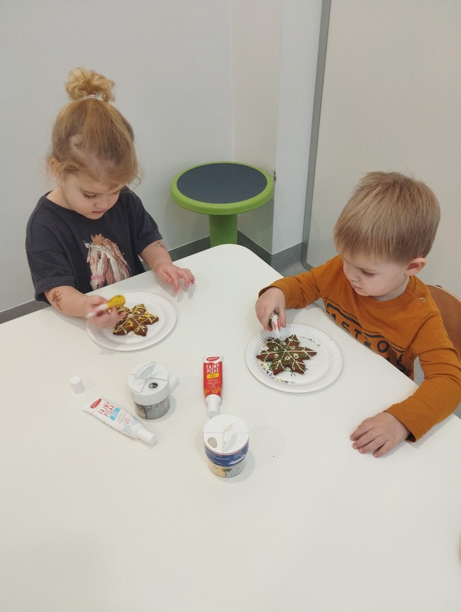 Zdjęcie przedstawia dzieci dekorujące pierniki
