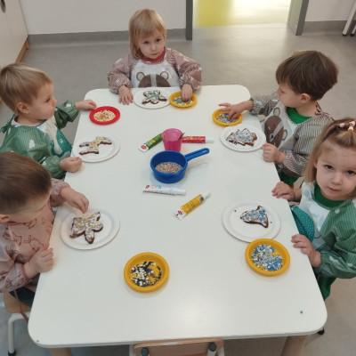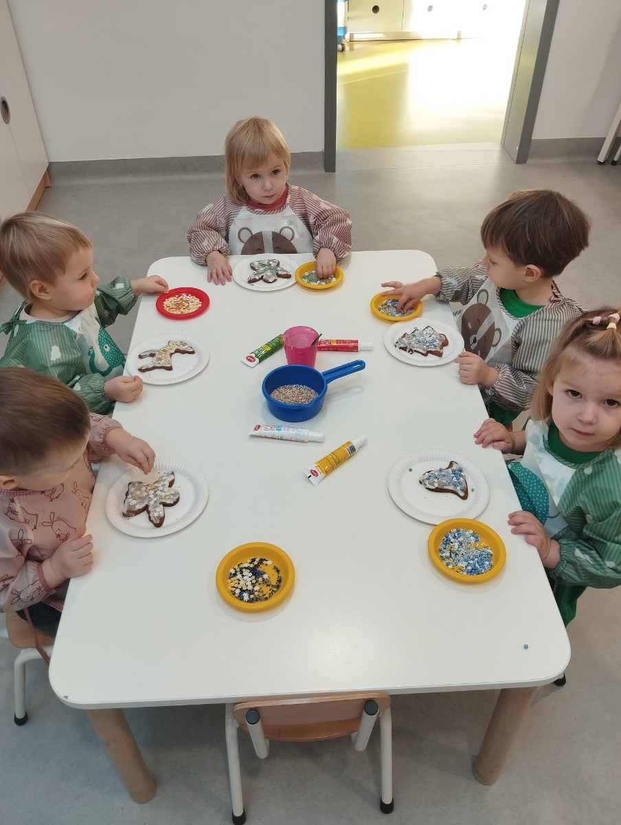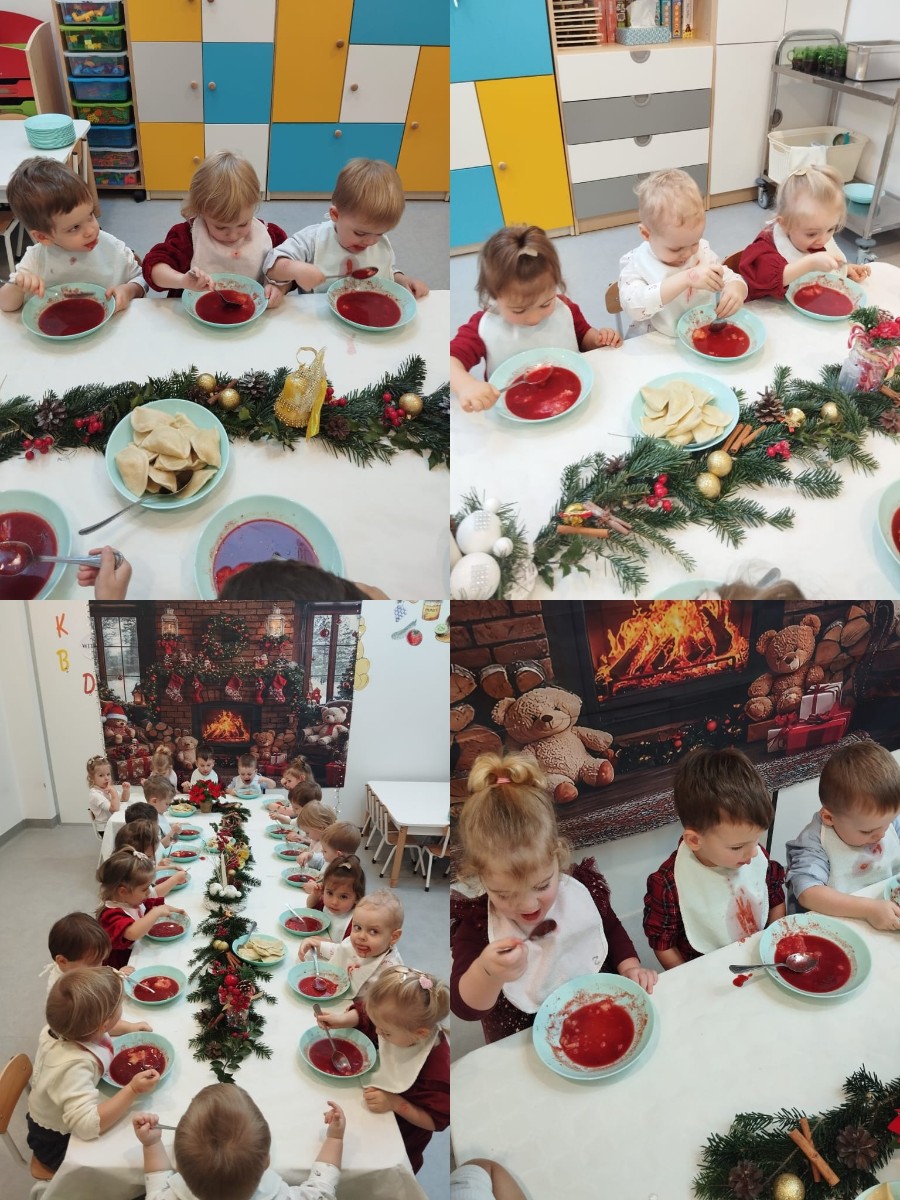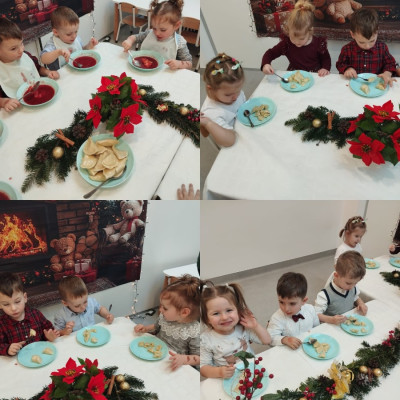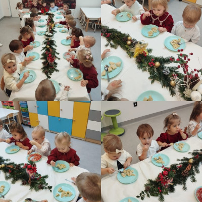 W okresie świątecznym w naszej grupie Rybek jak co roku odbyła się uroczysta Wgilia żłobkowa ⭐ Wszystkie dzieci zasiadły przy odświętnie nakrytym stole spożywając wigilijne potrawy. Jest to również czas, gdzie nasze maluchy zapoznają się ze zwyczajami i tradycjami ŚWIĄT BOŻEGO NARODZENIA 🧑‍🎄🎄 Dzieci miały okazję dekorować choinkę przyniesionymi przez siebie bombkami. Nie zabrakło również tworzenia i ozdabiania pierniczków według własnego pomysłu ☺️ Wszyscy razem śpiewaliśmy kolędy, a w calej grupie panowała radosna atmosfera i świąteczny klimat 🎀🎄