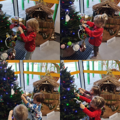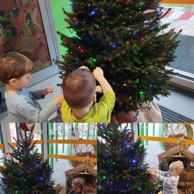 Zdjęcie przedstawia dzieci dekorujące choinkę