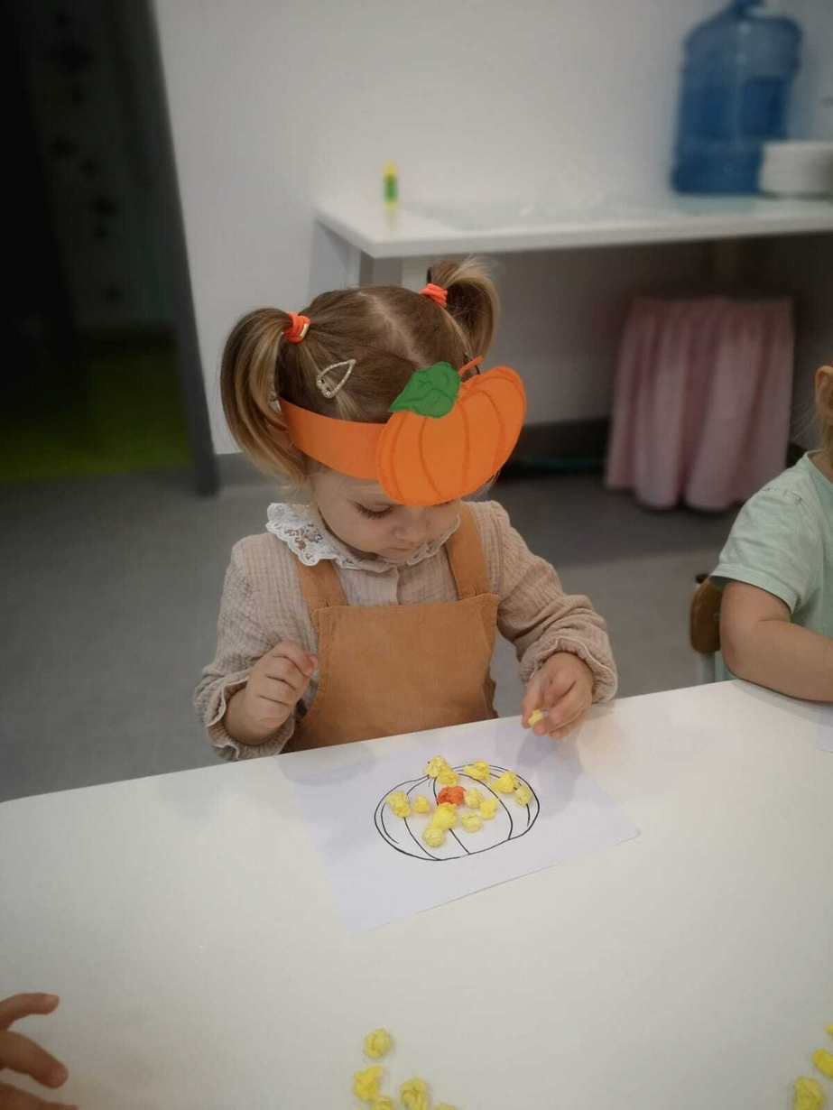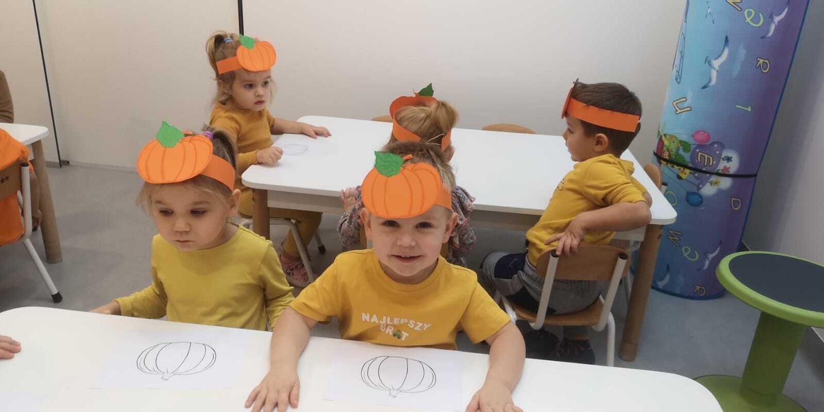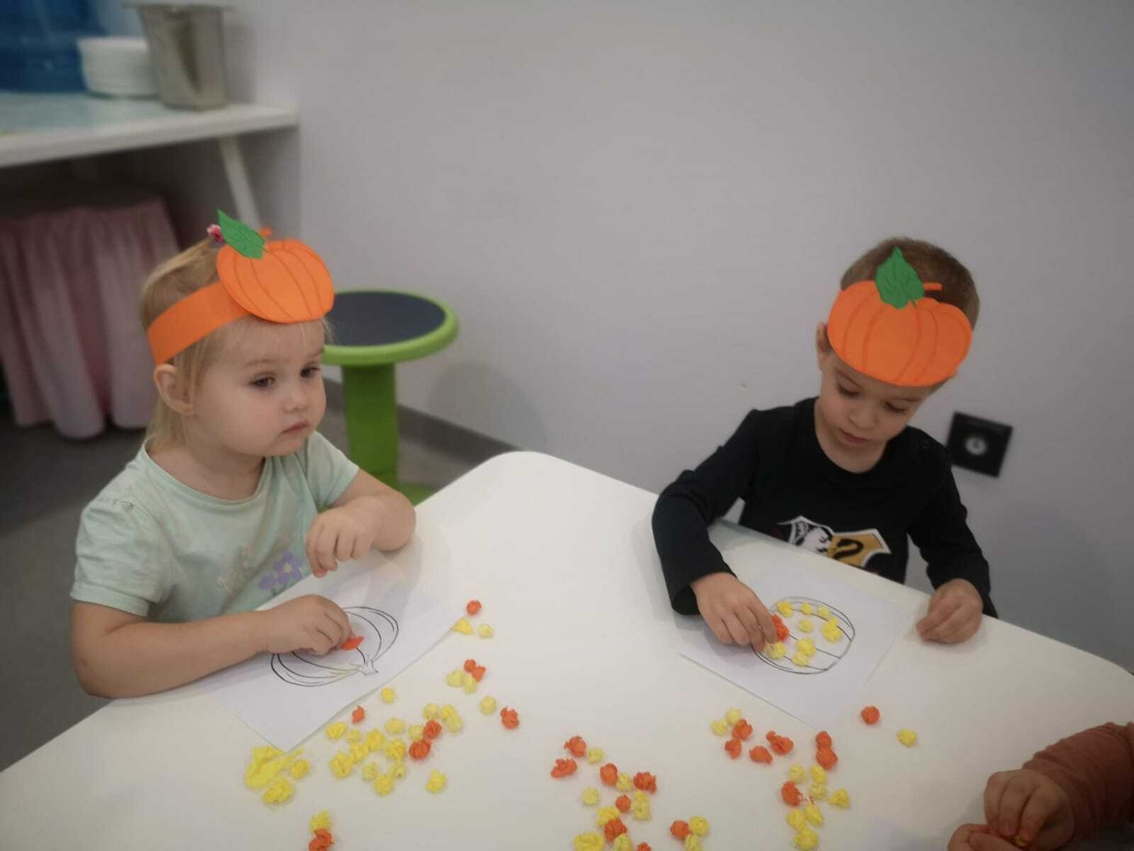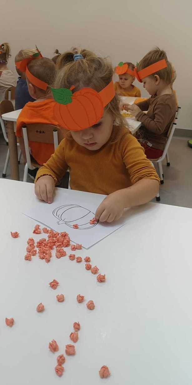 Na zakończenie pracowitego dnia dzieci wykonały pracę plastyczną z wykorzystaniem szablonu dyni i bibuły.
