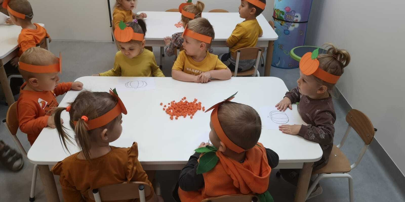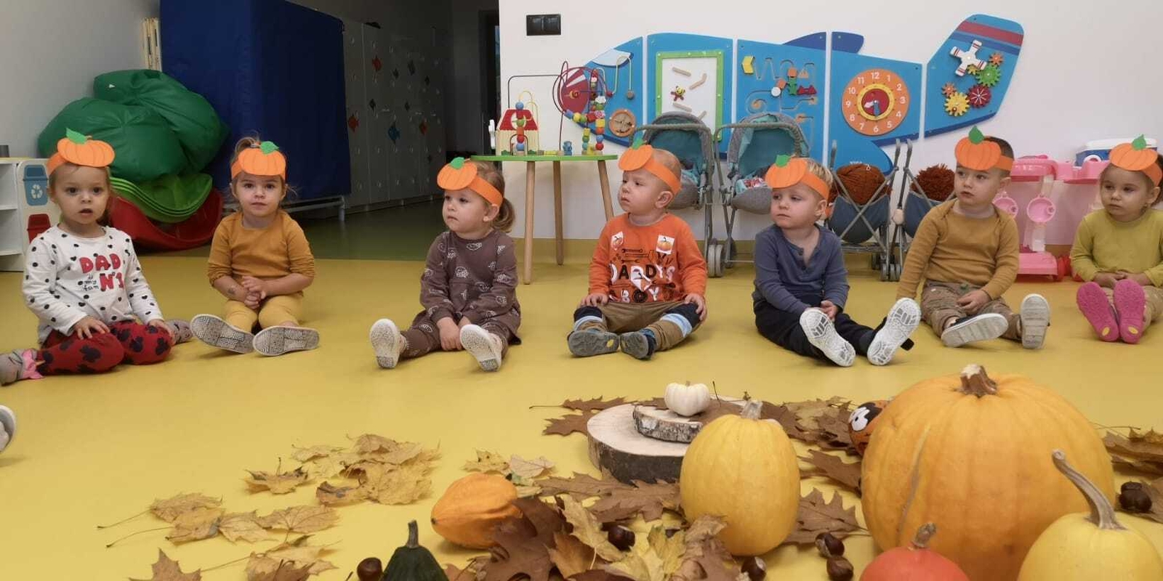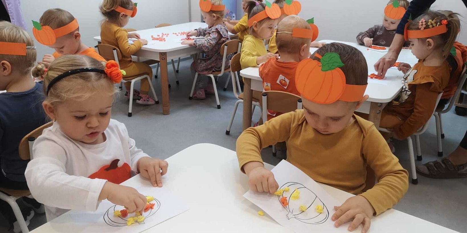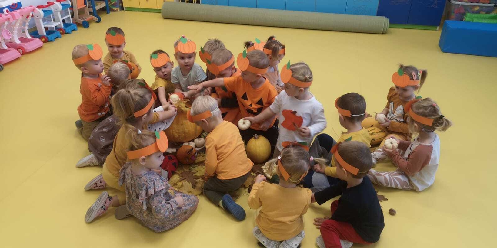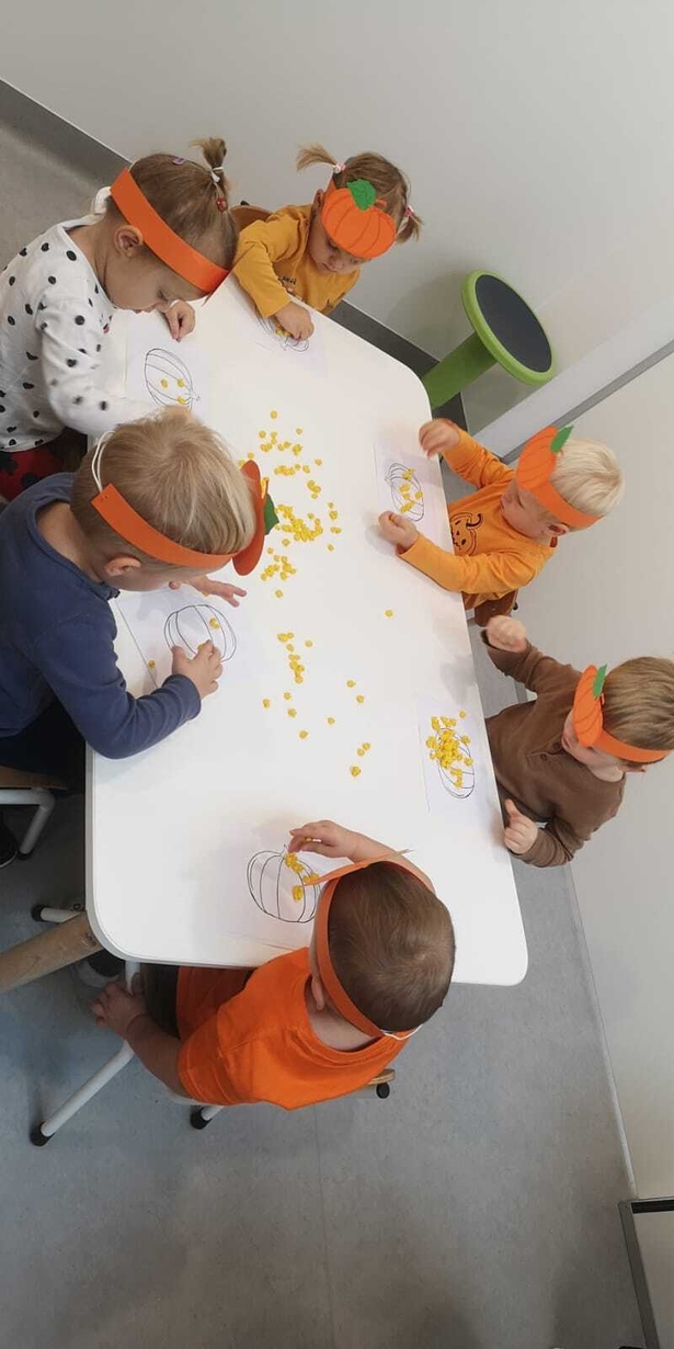 We wtorek 31.10.2023 obchodziliśmy na grupie Rybek "Święto Dyni". Dzieci mogły zobaczyć i dotknąć dynie o różnej wielkości i kolorystyce. Z wykorzystaniem liści i kasztanów stworzyły piękny stroik. Było dużo radości i śmiechu.