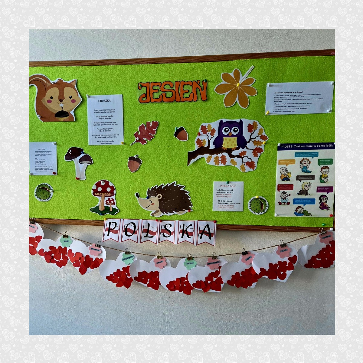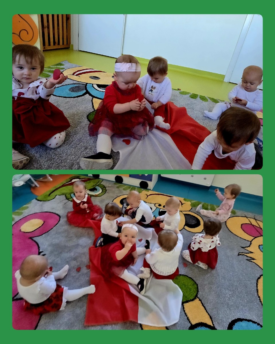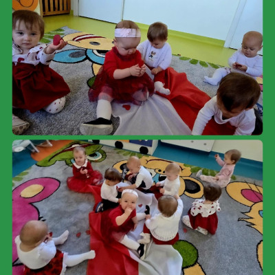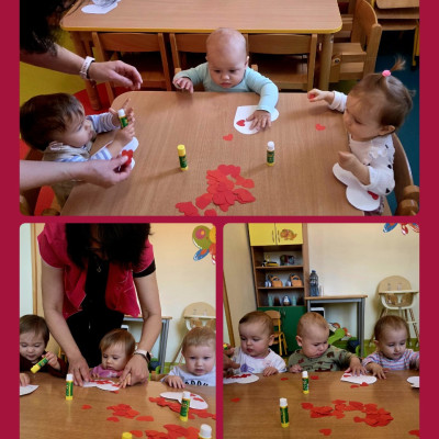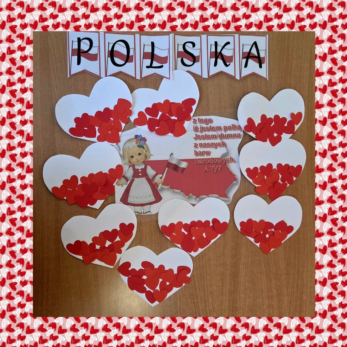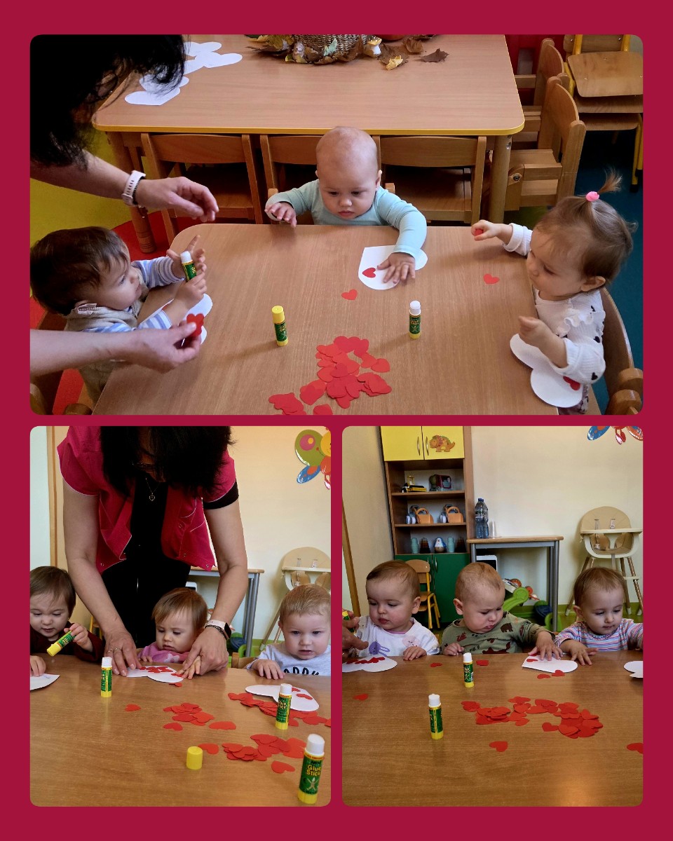 Nasze kochane Maluszki przyklejały dzielnie czerwone serduszka tworząc flagę Polski .