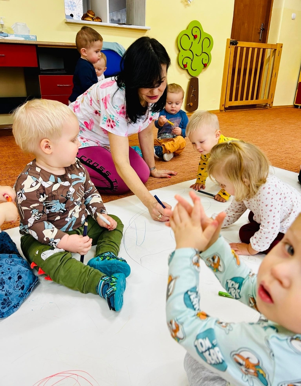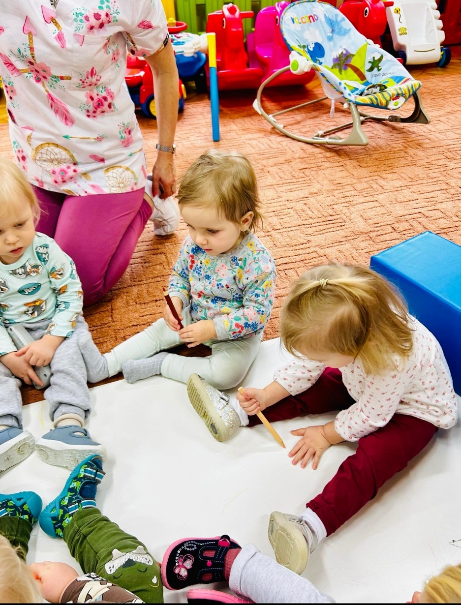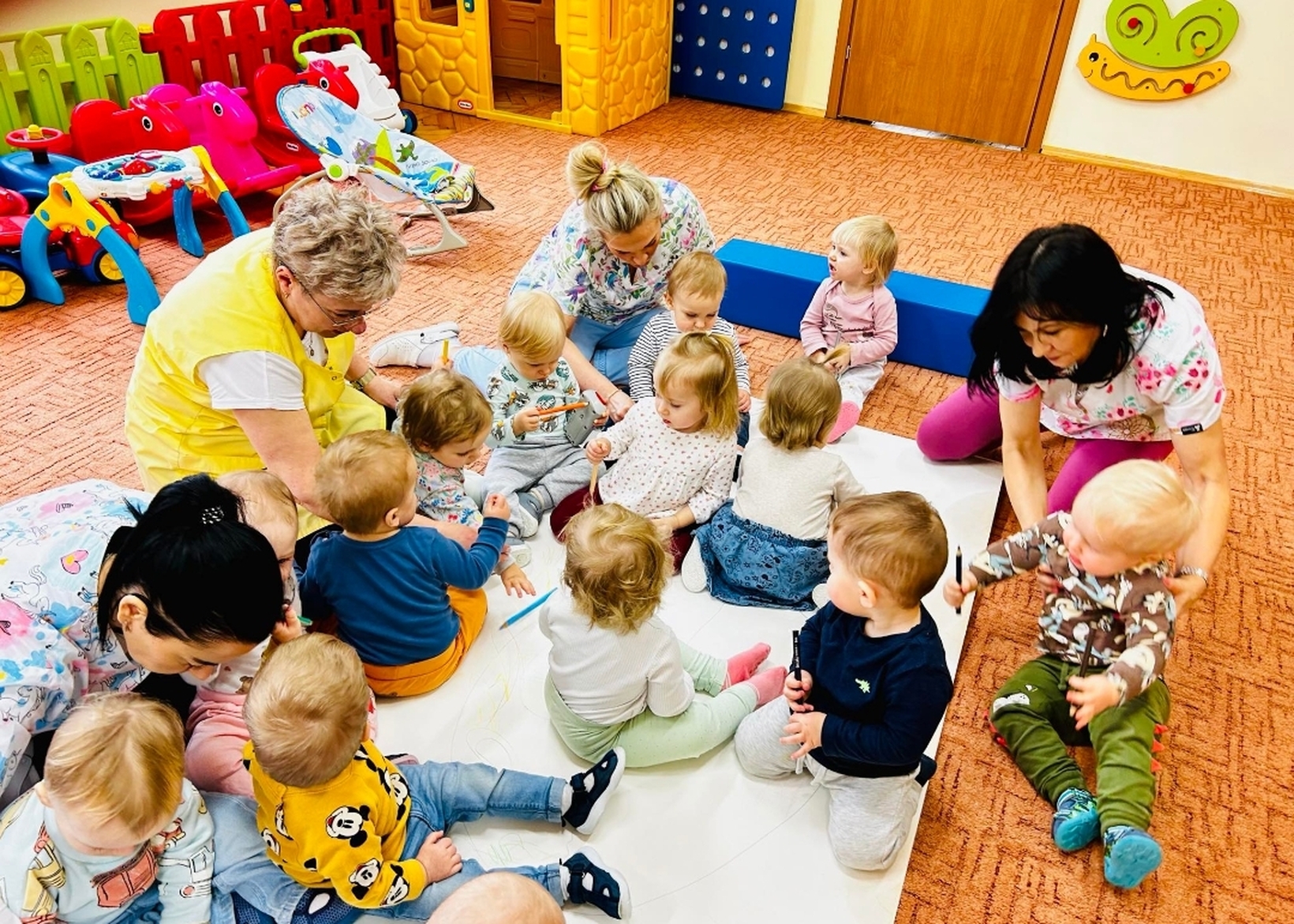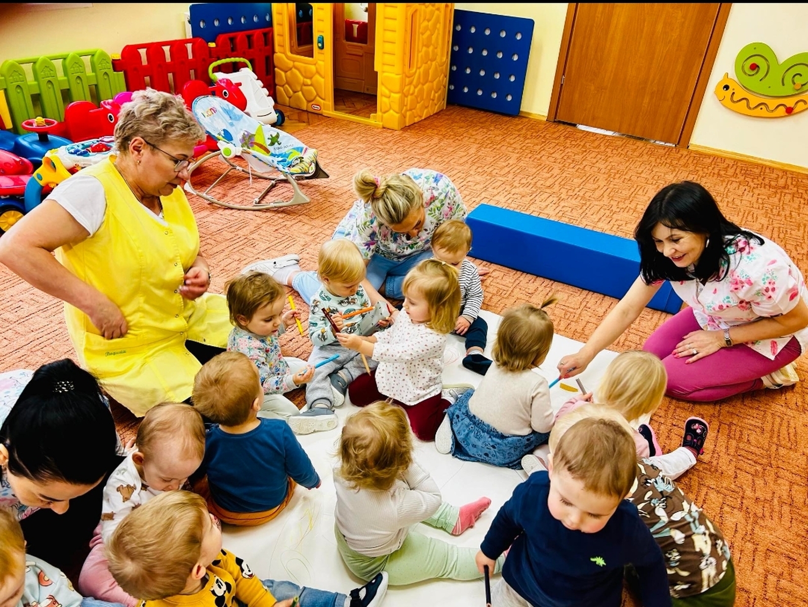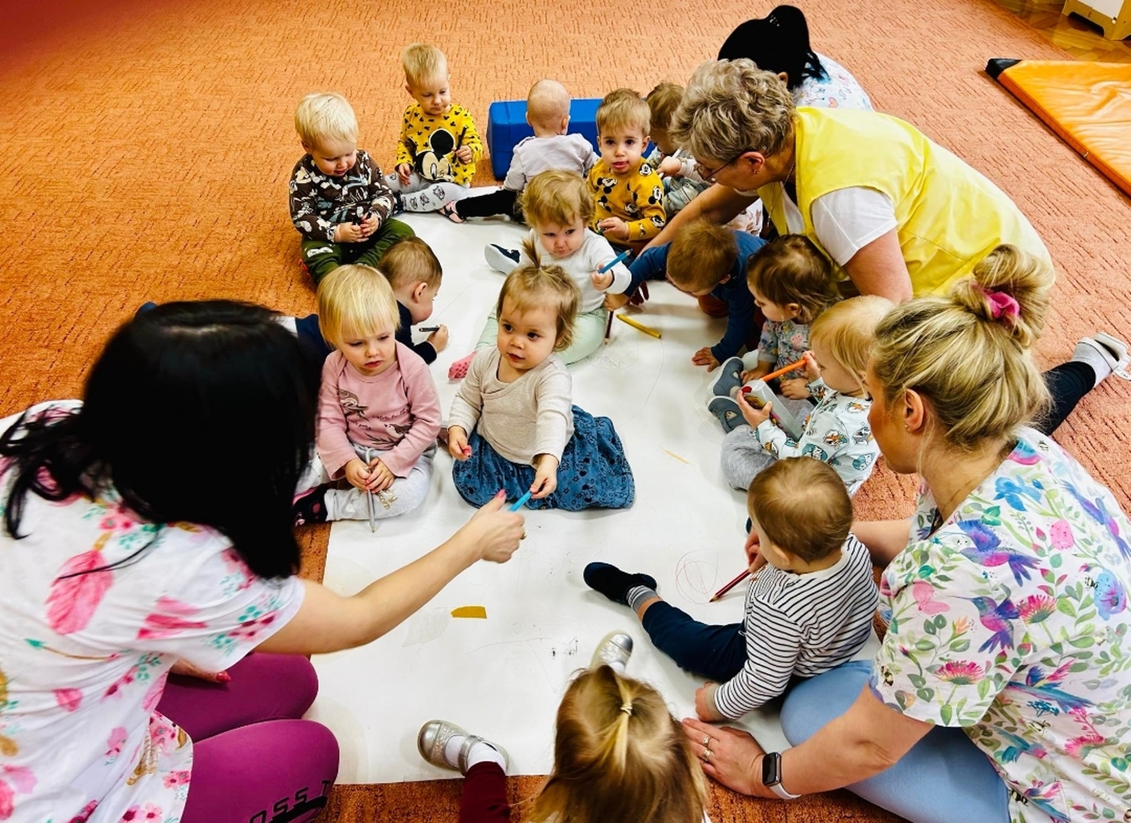 Maluszki razem z ciociami kolorowały duże pączki na arkuszu papieru.