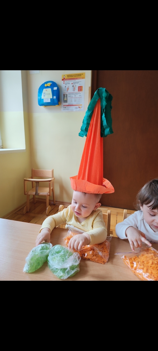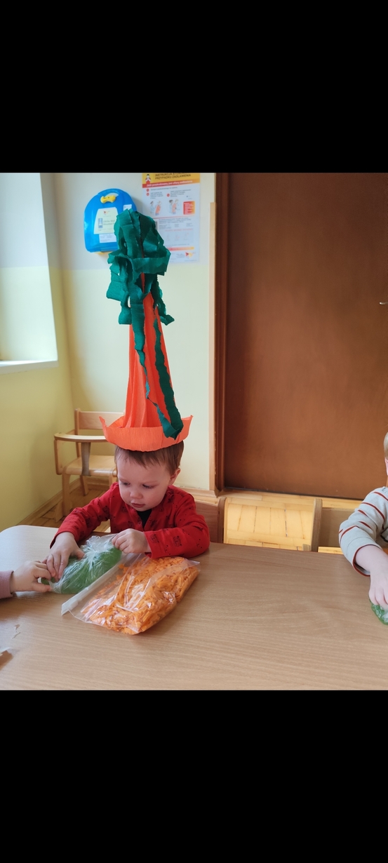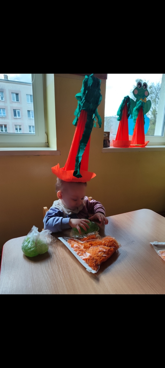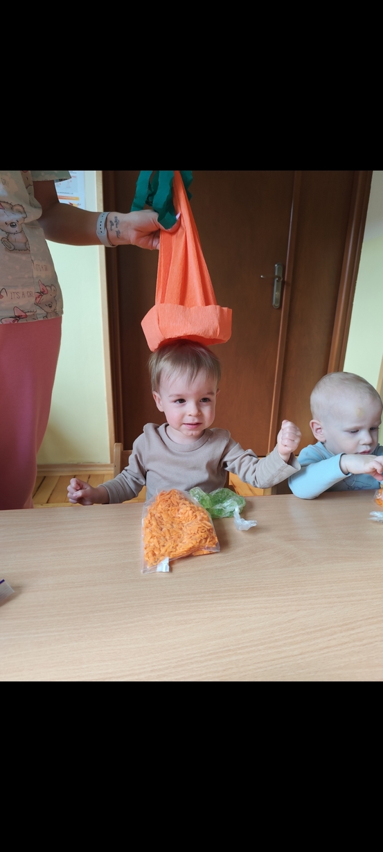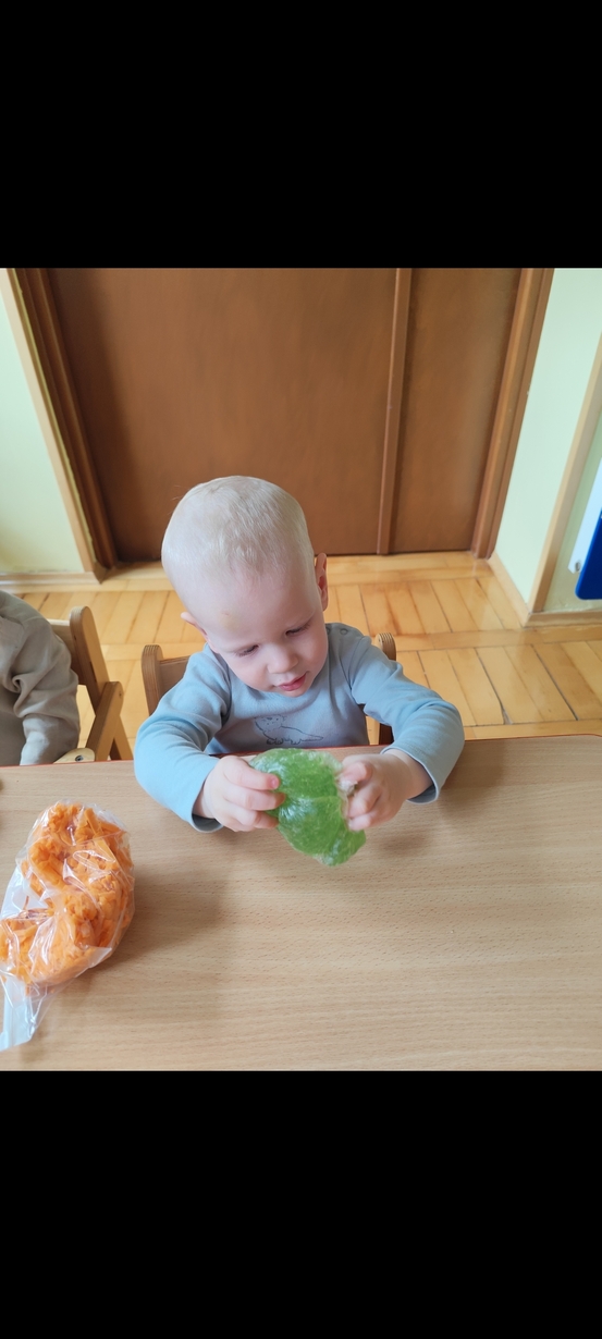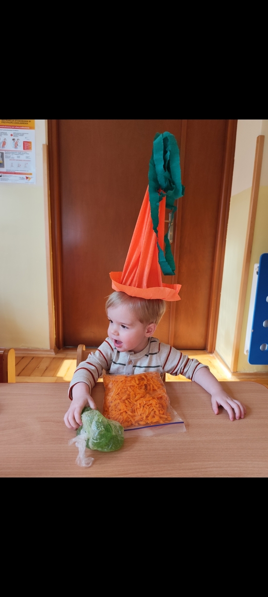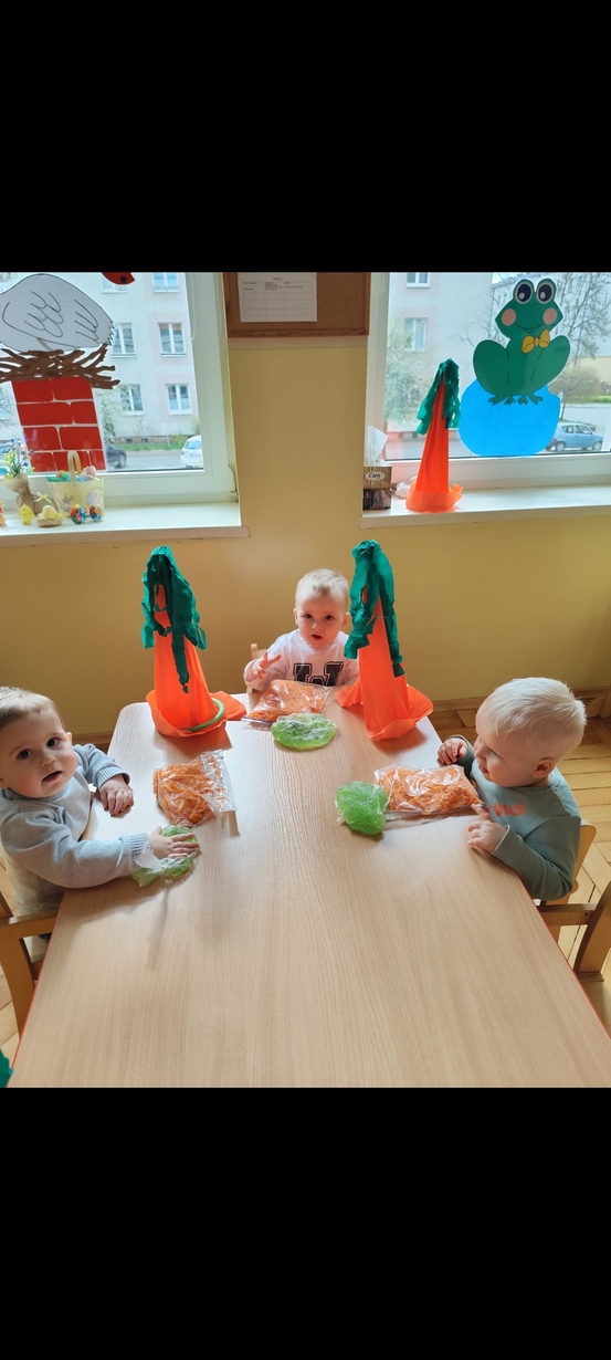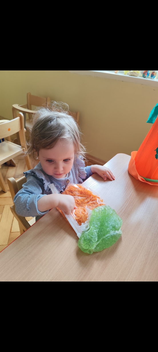 Dzisiaj nasze dzieciaczki ćwiczyły motorykę duzą. Za pomocą różnych struktur wykonanych z tartej marchewki i zielonej galaretki próbowały formować kształt marchewki.